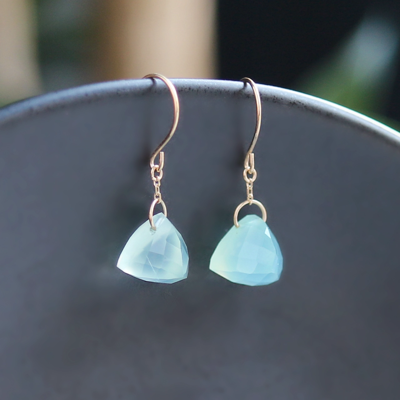 繊細で美しいフックの曲線と石が主役のイエローゴールドのフックピアス。 フックと石のつなぎには極細の10金チェーンを使用し、シーブルーカルセドニーの美しい発色と輝きが最大限に引き立つようにしました。