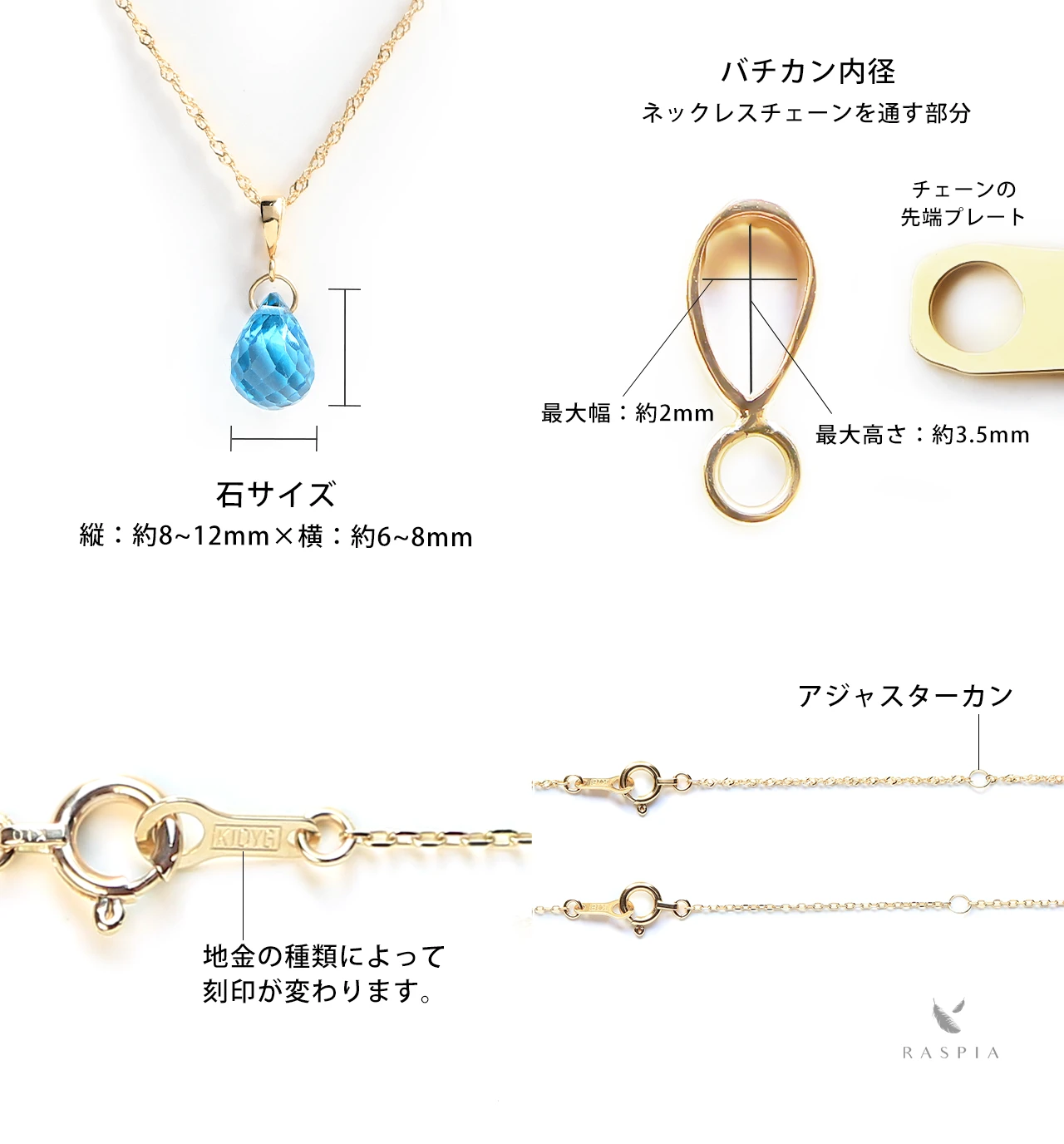 | サイズ | スイスブルートパーズ:縦 約8~12mm × 横6~8mm バチカン内径:高さ 最大(約)3.5mm/幅 最大(約)2mm チェーン全長は40cm・45cm・50cmよりお選びいただけます。 | ||