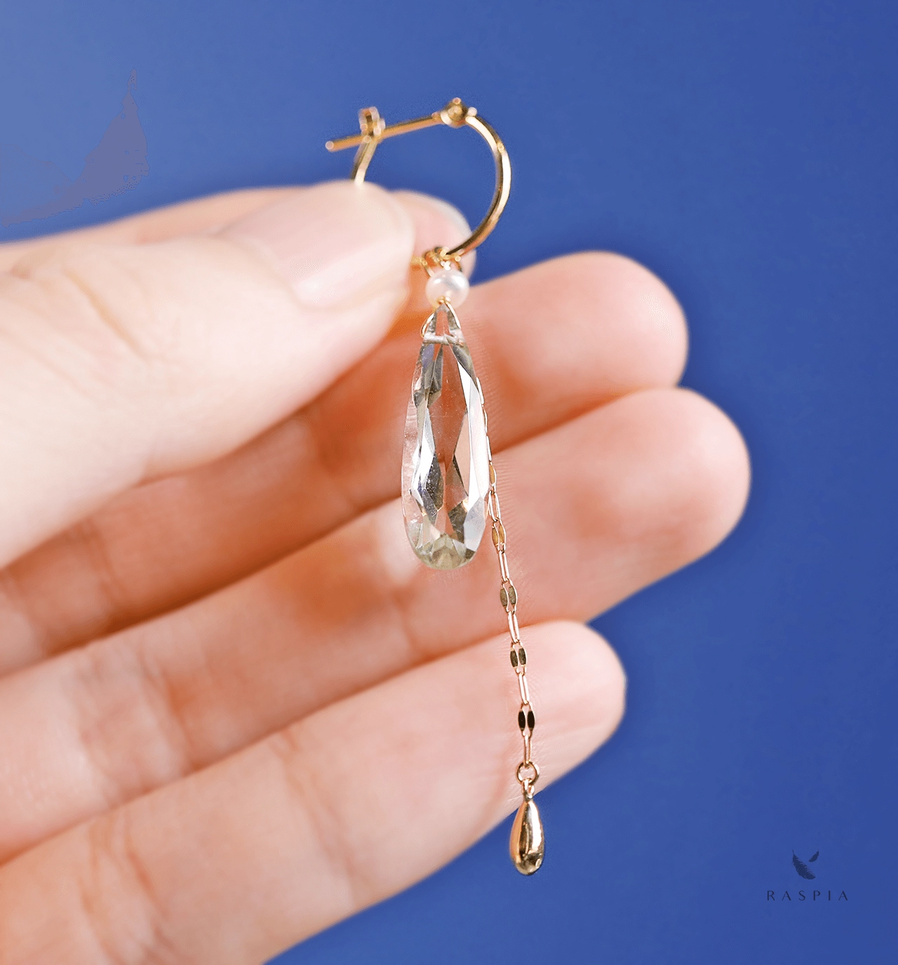 澄んだ湖水のような透明感が印象的なグリーンアメジストを使用したK18のリングピアスです。洗練された大人の女性をイメージさせるチャームは石とチェーンの両方取外し可能なので、その時の気分で使い分けが可能です。