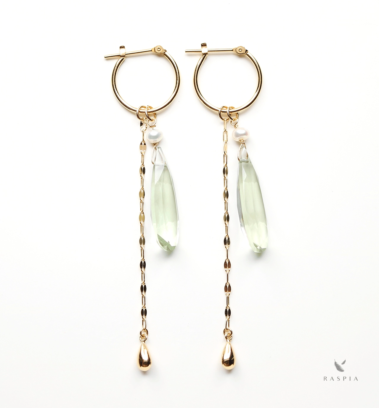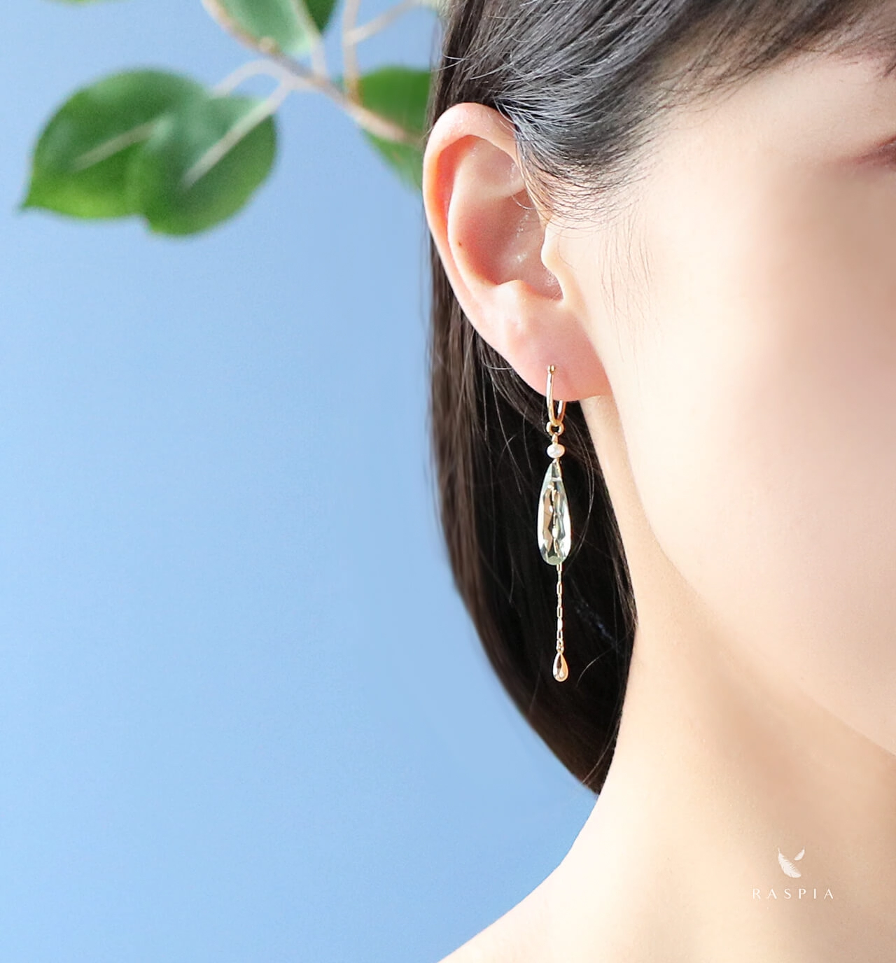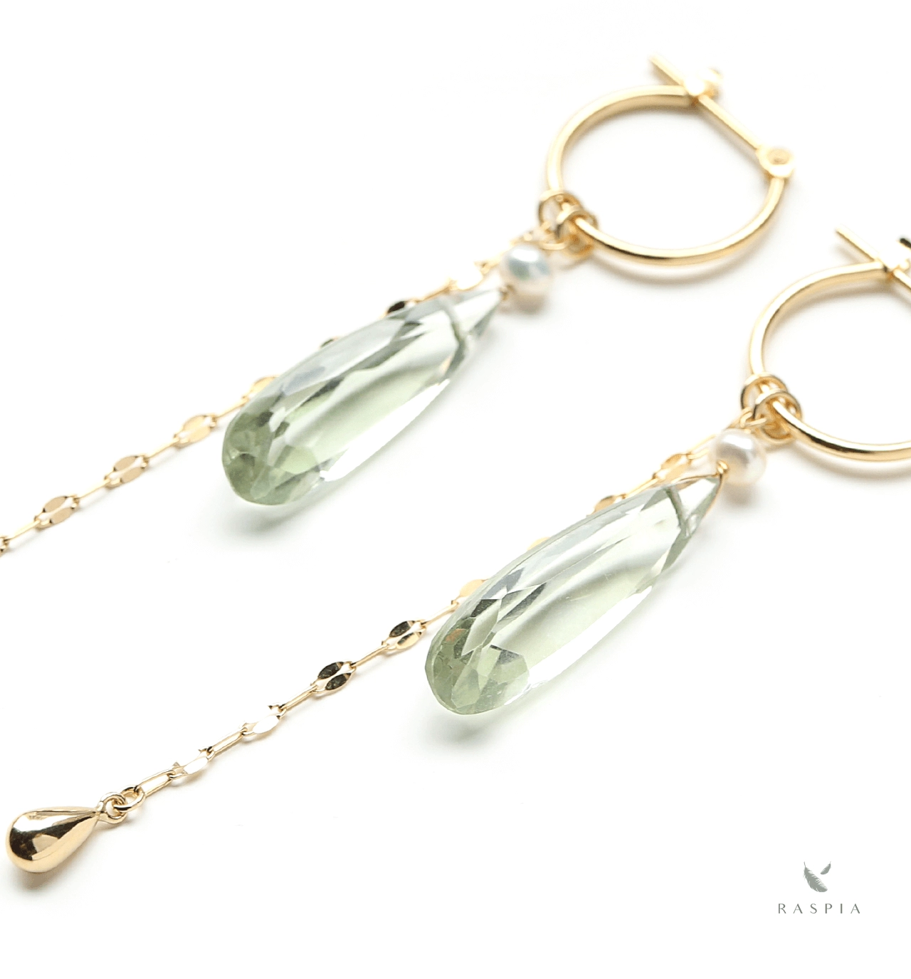 縦長のグリーンアメジストとチェーンが耳元で揺れるたびに軽やかに煌めきます。また、鮮やかなイエローゴールドと清々しい色のグリーンアメジスト、そしてさり気なくあしらわれた淡水パールは相性がよく、上品な可愛らしさを演出してくれます。