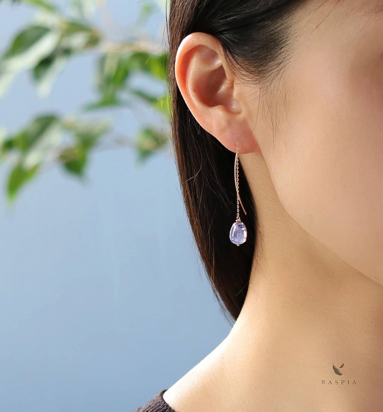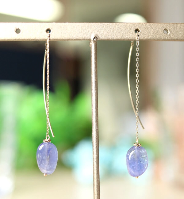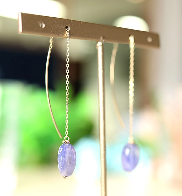 アメリカンピアスはK10イエローゴールドを使用し、タンザナイトが持つ独特の青をより引き立ててくれます。黄色と青紫の色合わせは神秘的な魅力を醸し出します。
