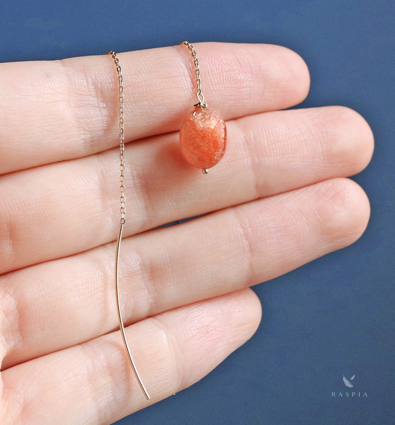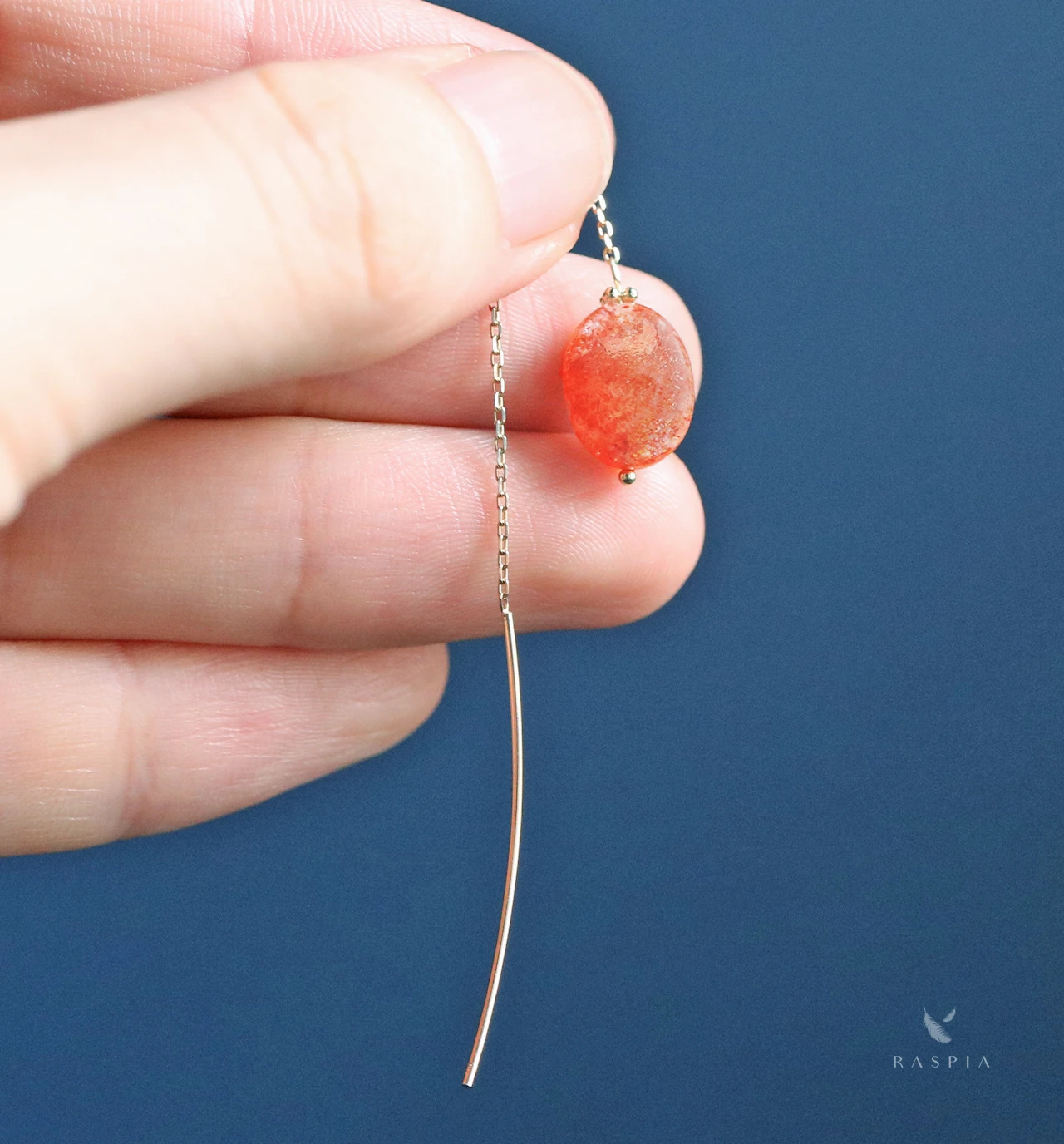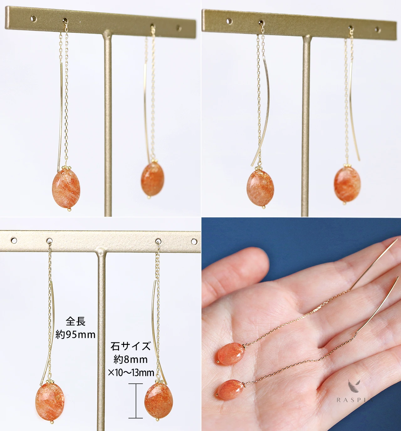 | サイズ | 全長:約95mm(石の大きさにより長さは変動) サンストーン:約8×10〜13mm ポストの太さ:0.8mm | ||