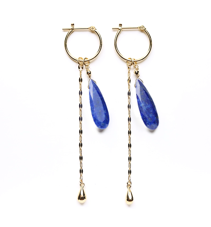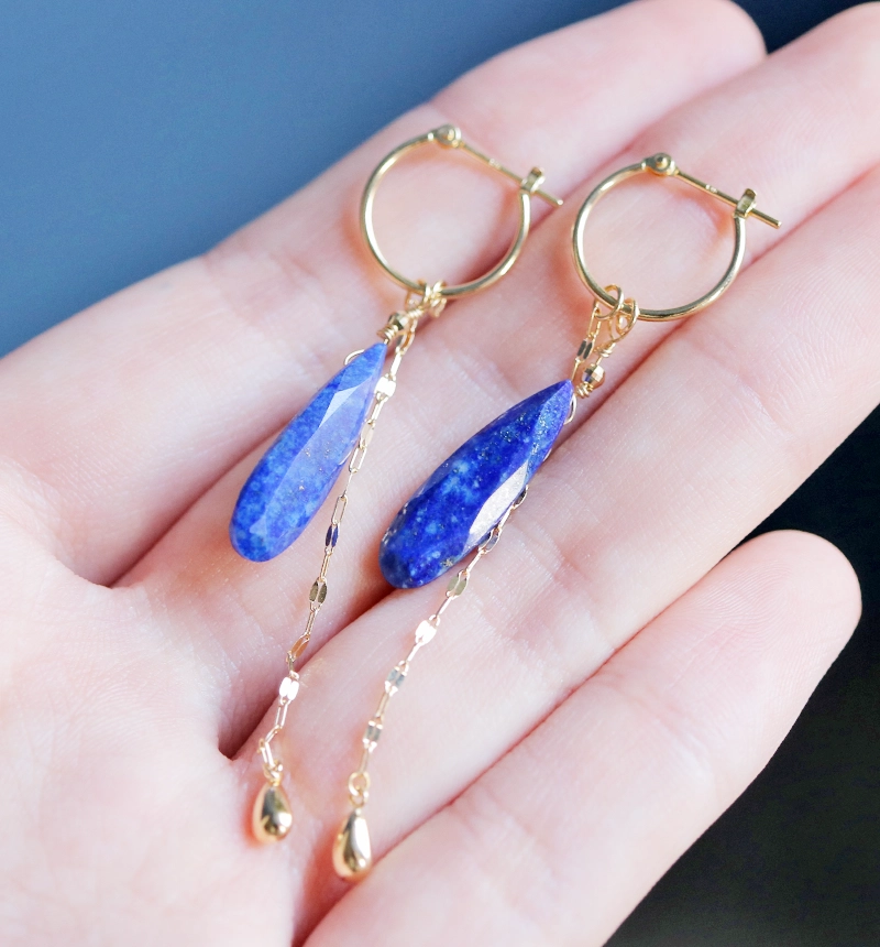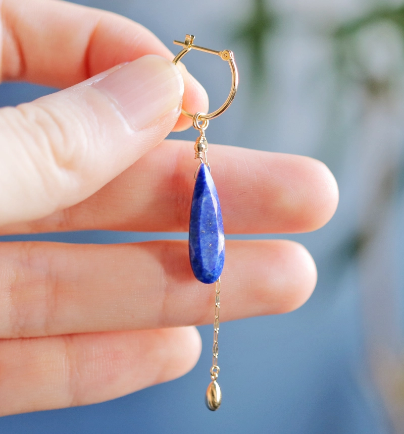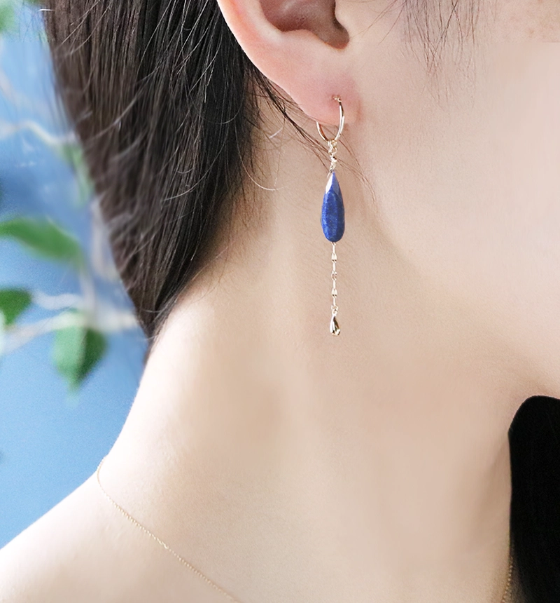 ラピスラズリの深い青とのコントラストの美しさが最大限に引き立つようにしました。散りばめた星が夜の空に広がるような綺麗なラピスラズリ、そしてさり気なくあしらわれたK18のカットビーズは相性がよく、上品で可愛く耳元で揺れます。