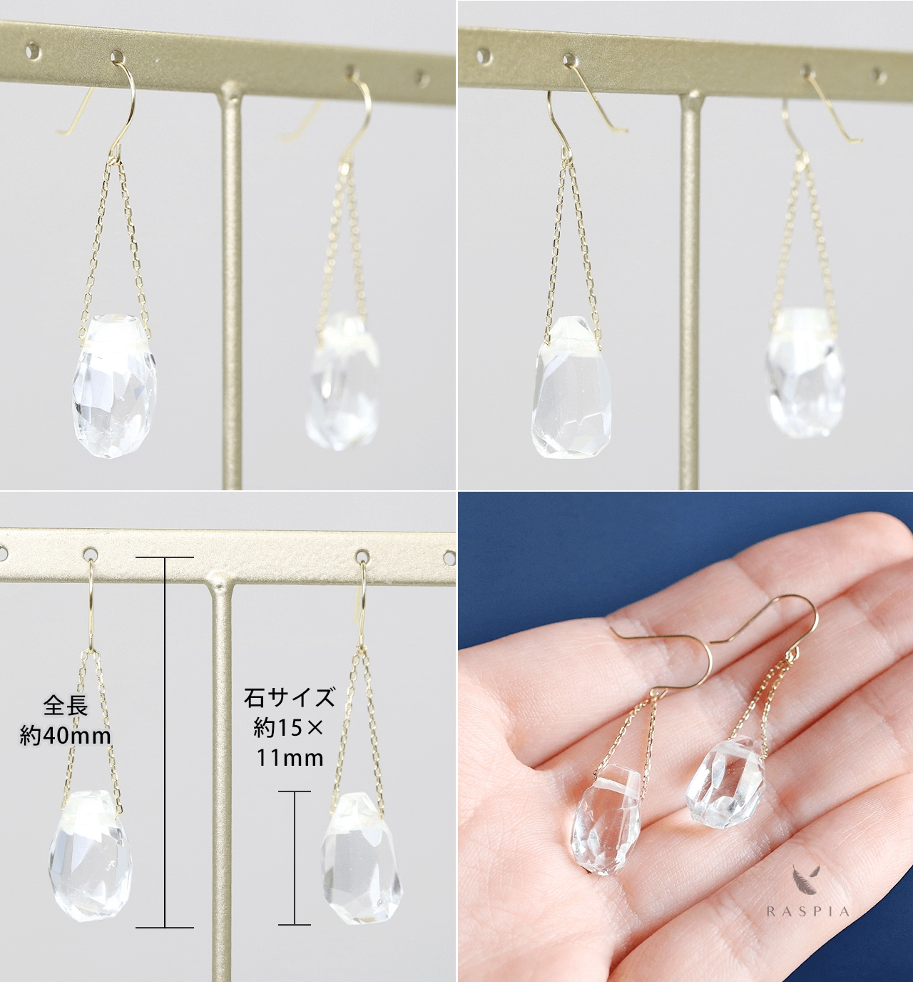 | サイズ | 【ピアス】サイズ:縦 約14mm×横 約10mm フックの太さ 0.5mm【石】ロッククリスタル:約15mm×10mm【チャーム丸カン内径】約1.2mm | ||