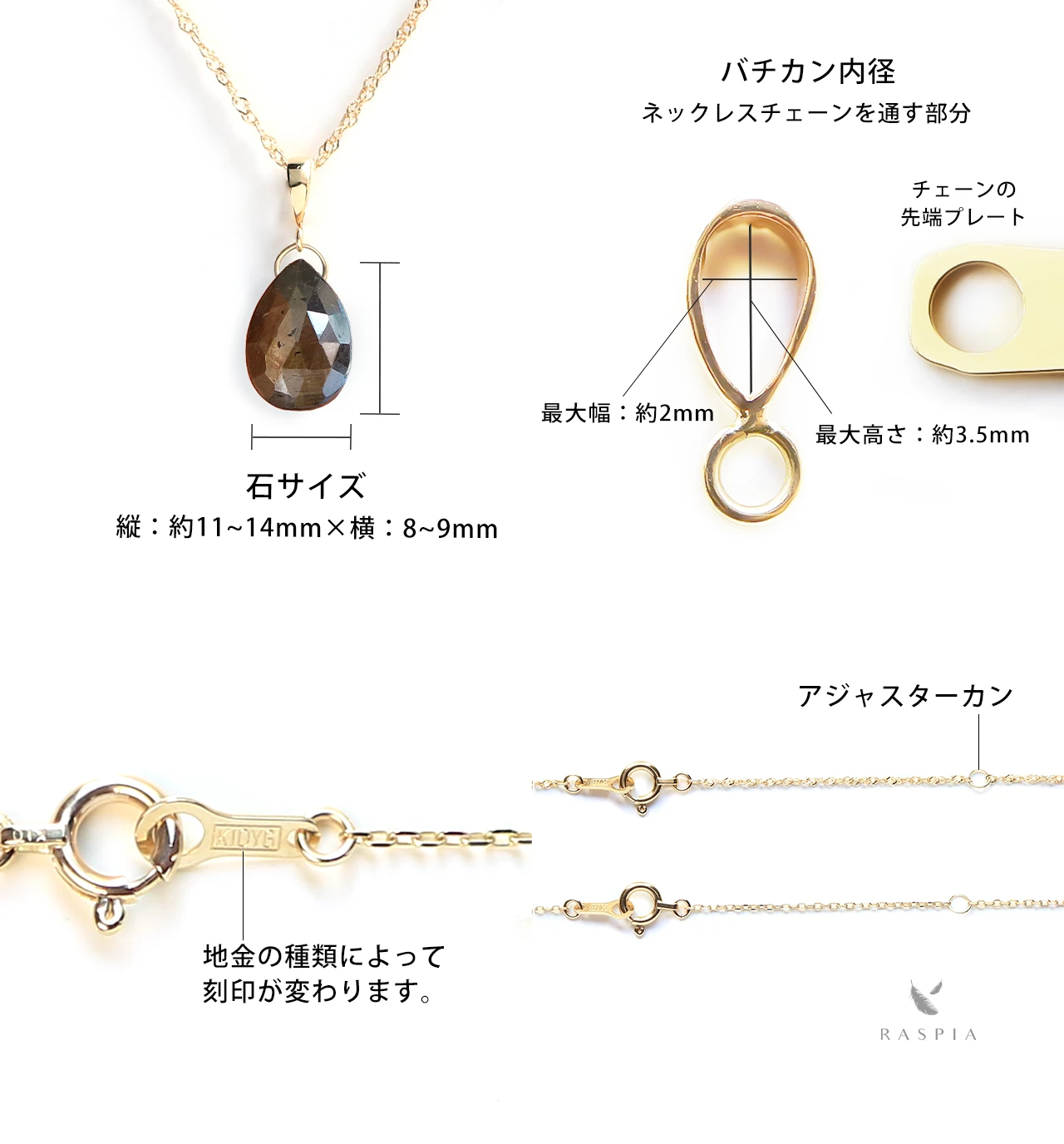 | サイズ | ゴールデンブラウンカラーサファイア:約11~14mm × 約8~9mm バチカン内径:高さ 最大(約)3.5mm/幅 最大(約)2mm チェーン全長は40cm・45cm・50cmよりお選びいただけます。 | ||