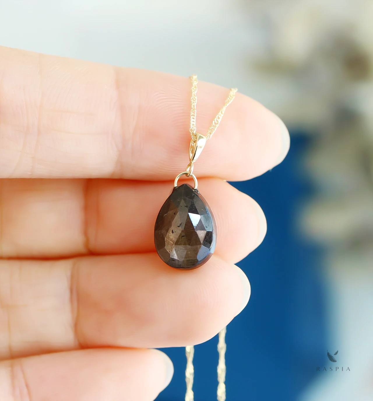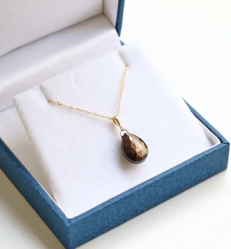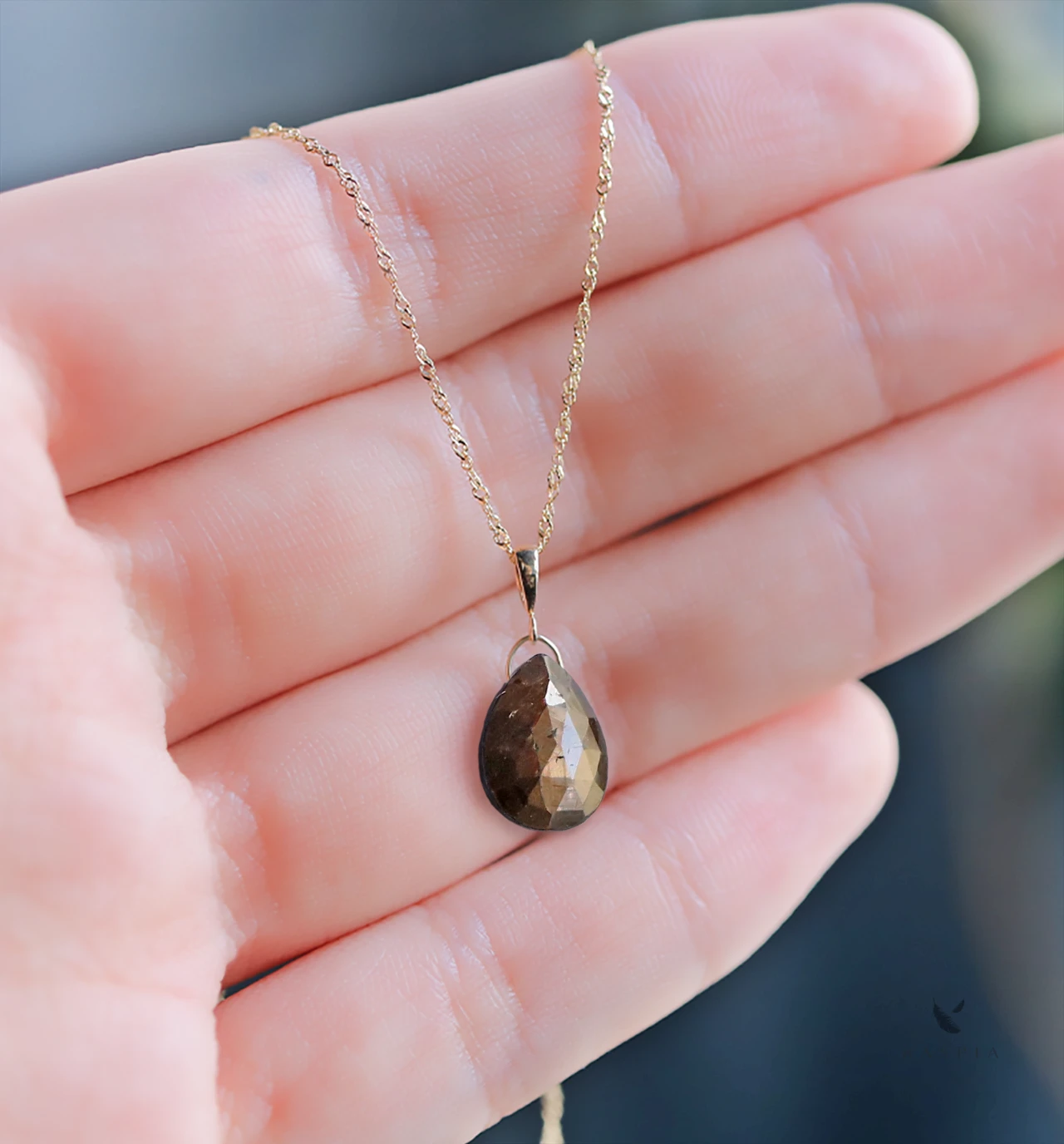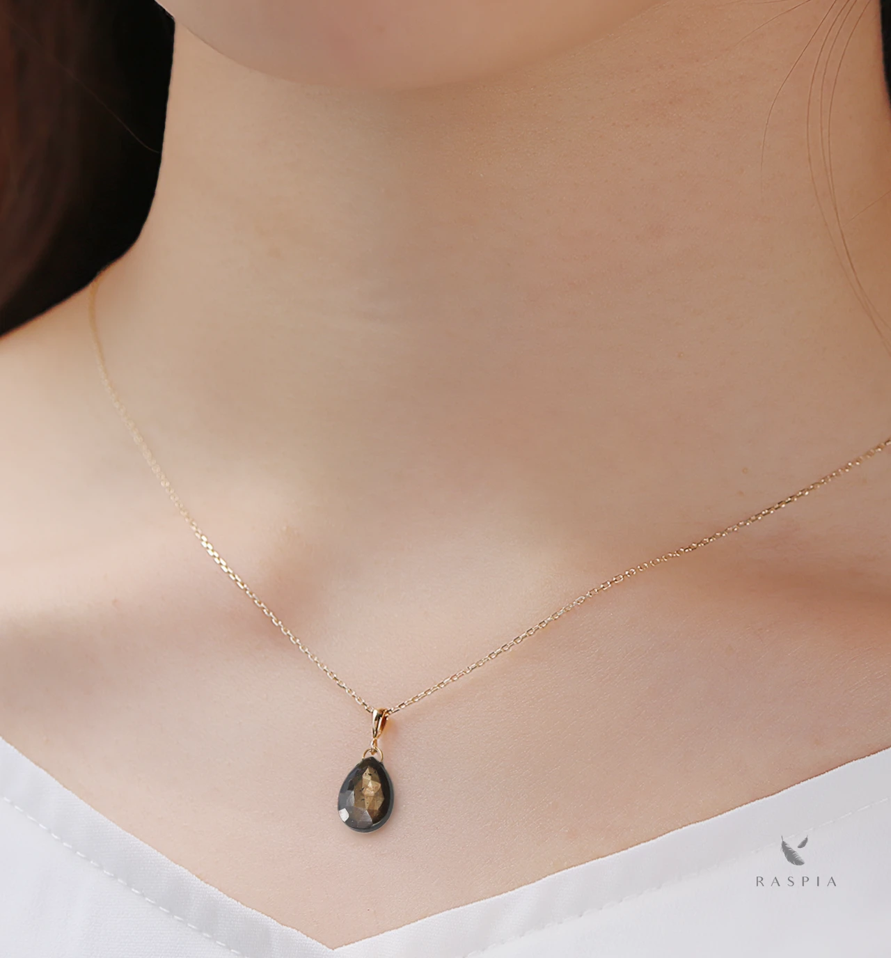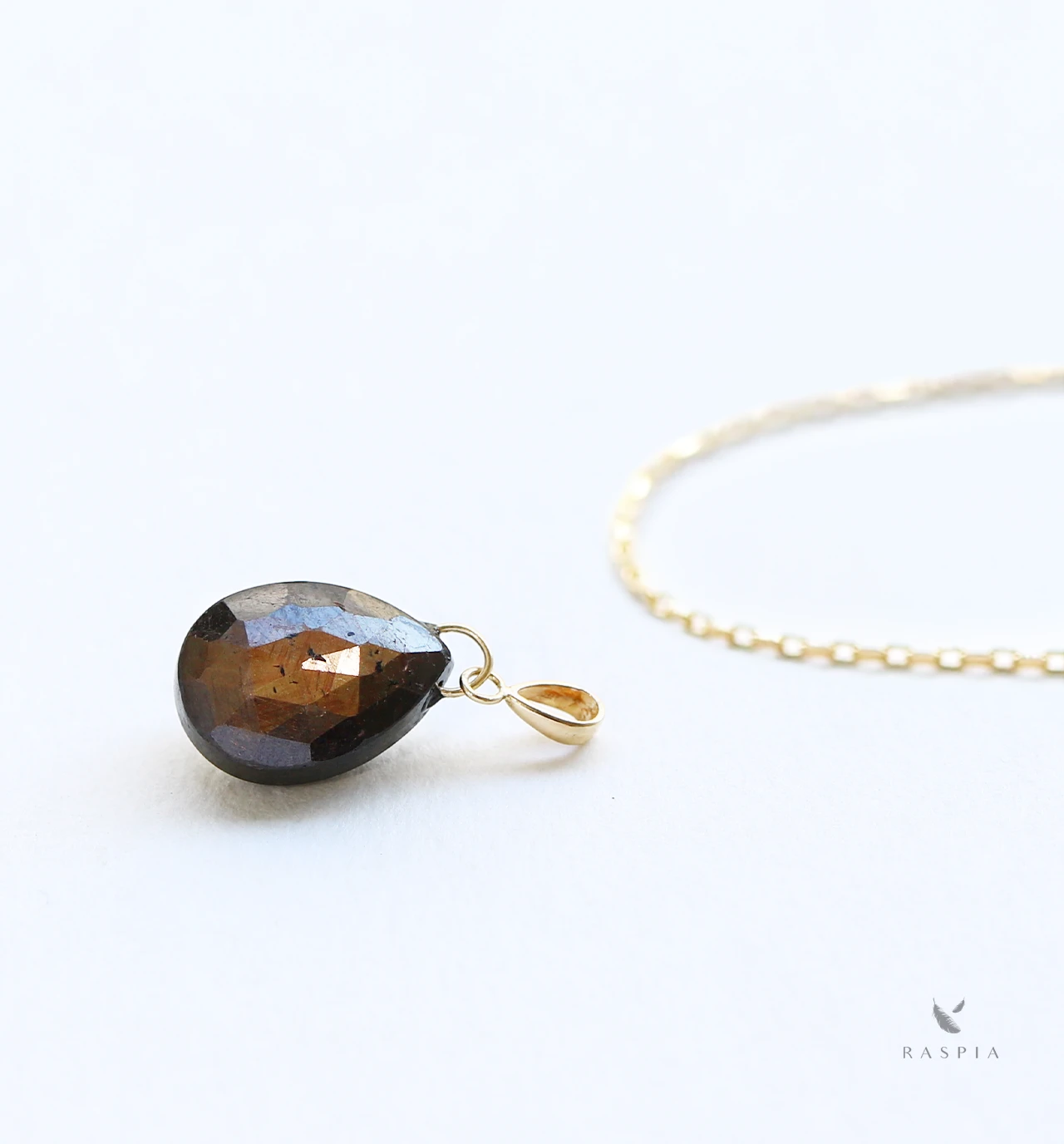 シックなブラックカラーをベースに落ち着いたブラウンに輝くシラーが美しい、マダガスカル産のゴールデンブラウンカラーのサファイアを使用したネックレスチャーム。