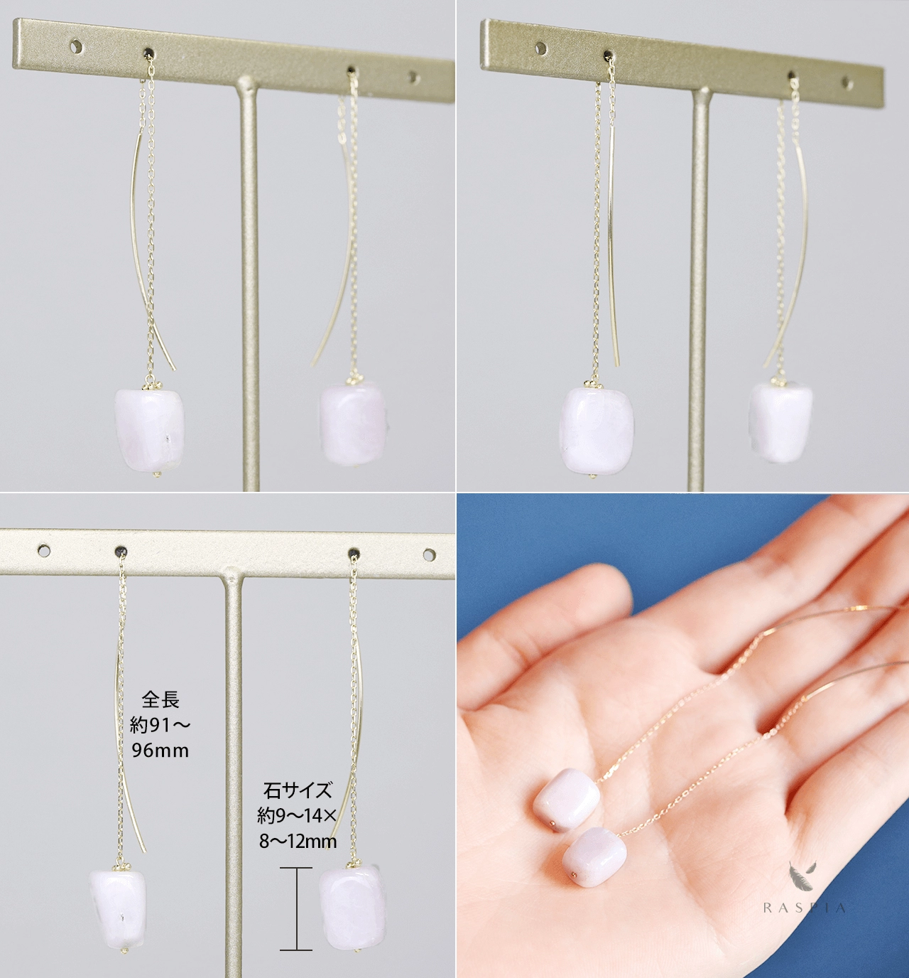 | サイズ | 全長:約91~96mm(石の大きさにより長さは変動) クンツァイト:約9~14mm×8~12mm ポストの太さ:0.8mm | ||