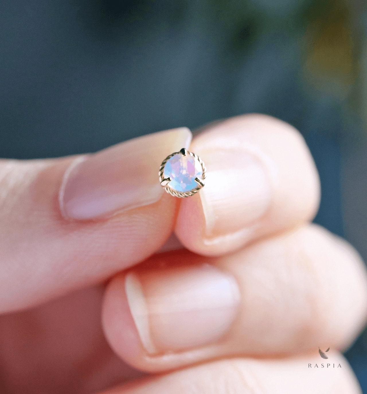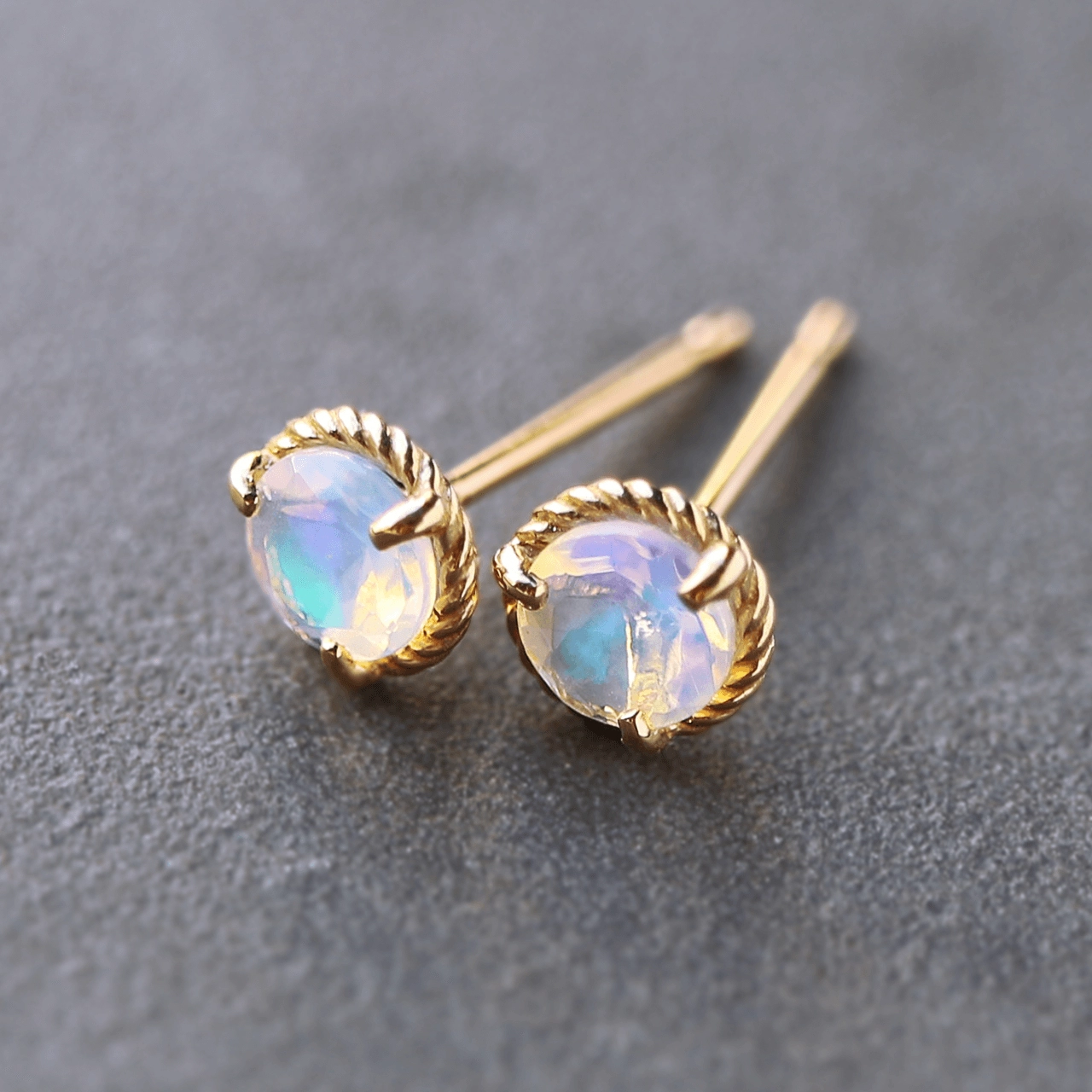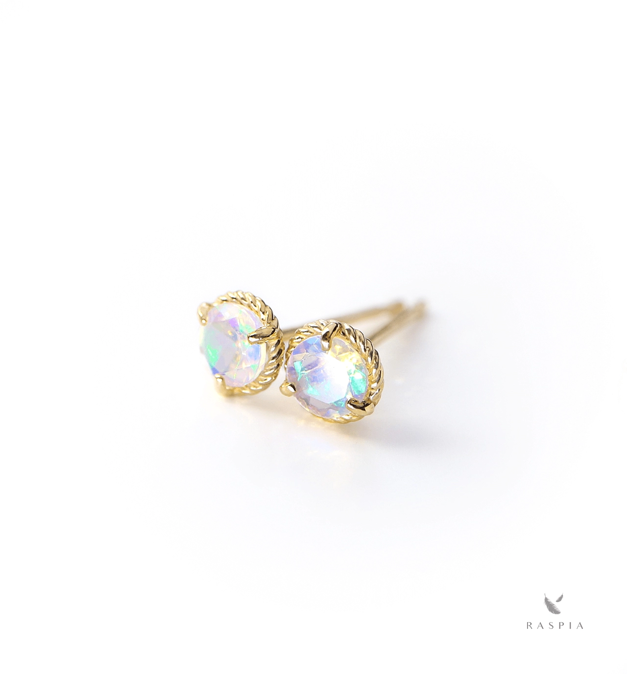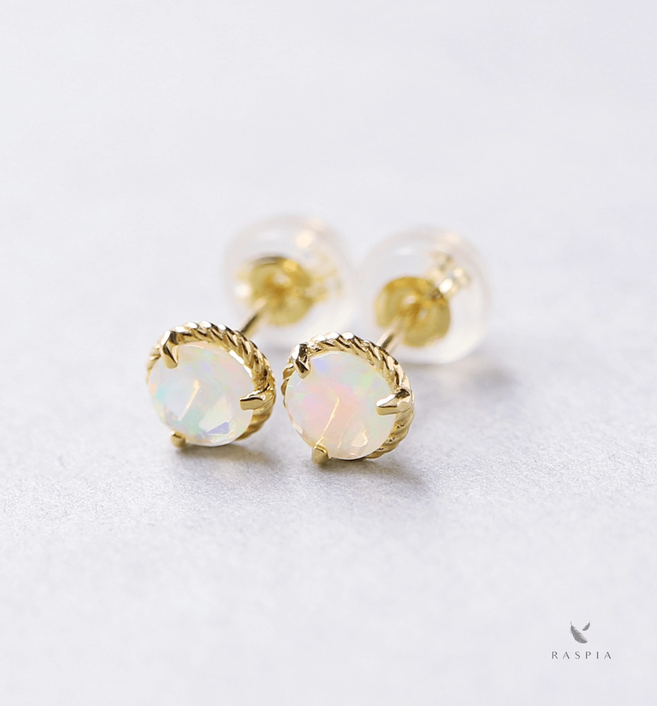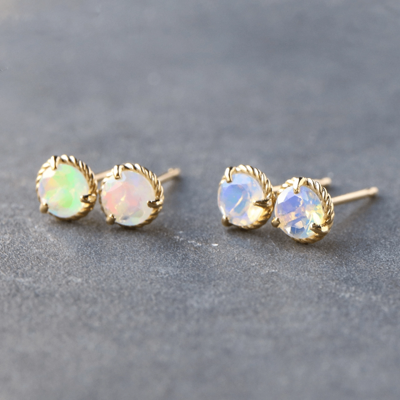 彩り鮮やかな遊色が魅力的なエチオピア産プレシャスオパール。ラウンドにファセットカットを施したオパールを18金のヨリ線の縁取りの台座にシンプルなピアスに仕立てました。