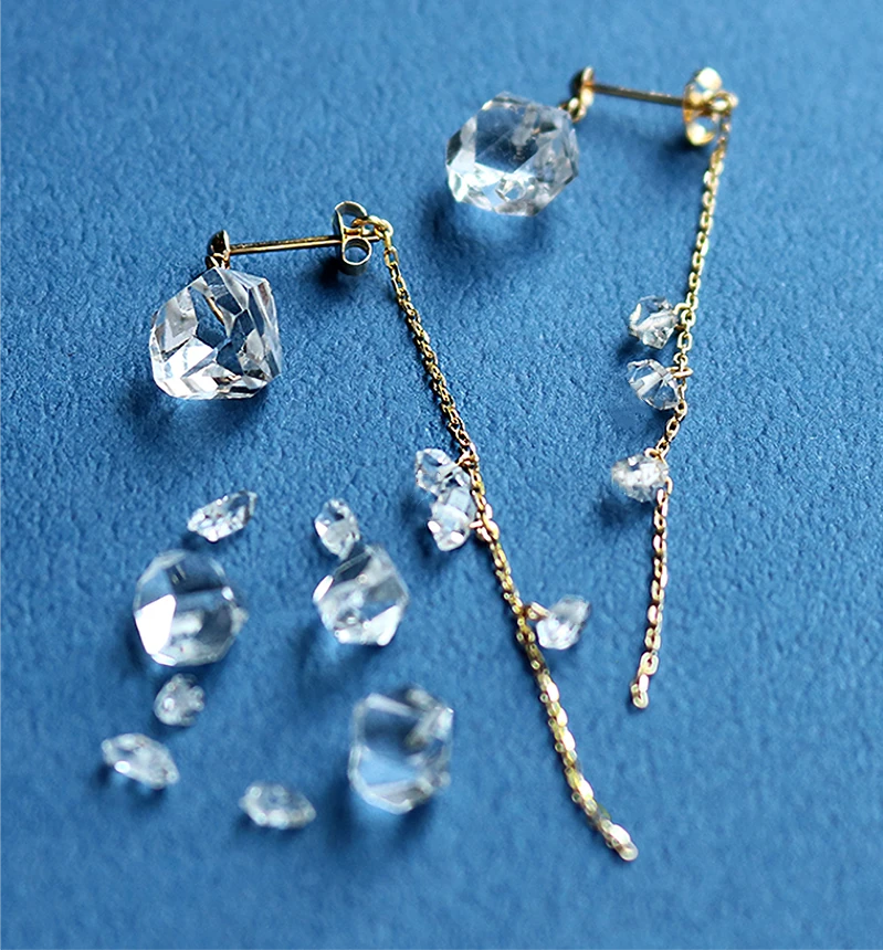 太古の地層から採掘された、自然由来のハーキマーダイヤモンドの輝きを活かしたデザインで、ストーン一つ一つの個性を存分にお楽しみいただけます。