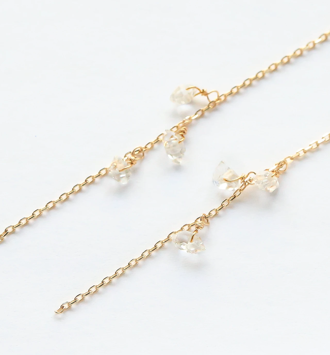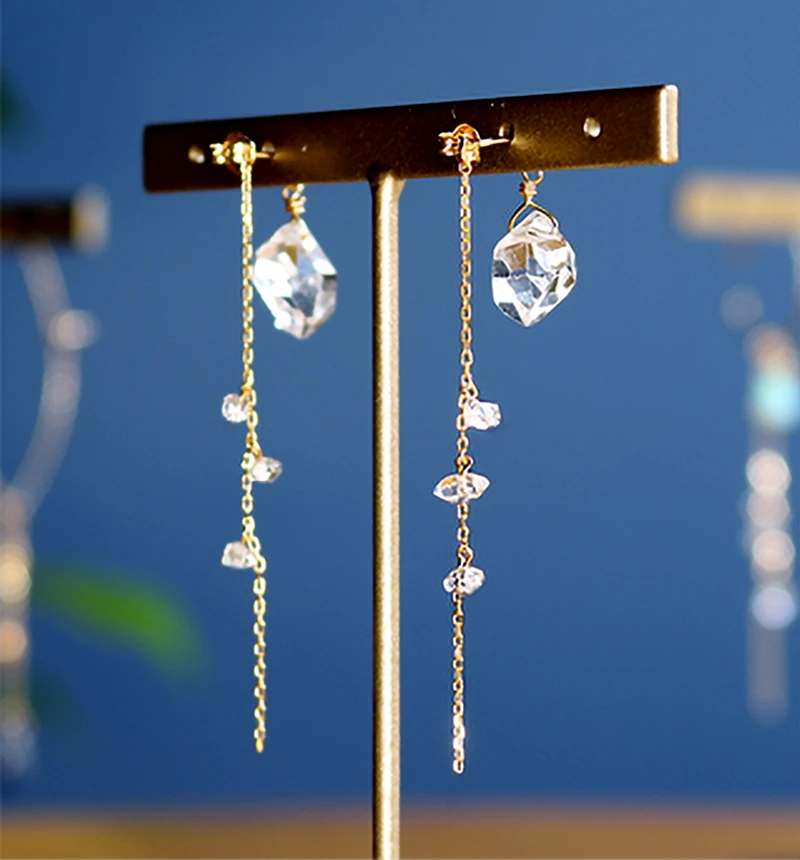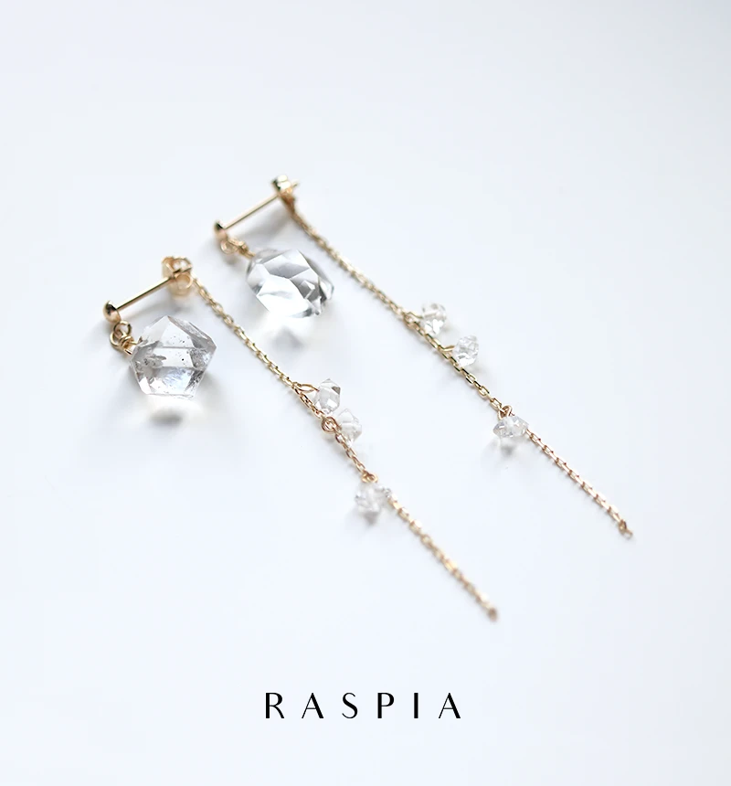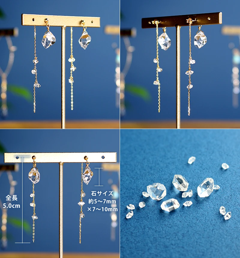 ハーキマーの特徴の天然のカットから生まれる透明感のある輝きを、より一層引き立たせるため2種類のゴールドを使用しています。 前に大きい一粒ハーキマーを使用し、後ろのキャッチ部分には流れ落ちるように小粒のハーキマーを配置することで遠近感や物語性を演出しています。