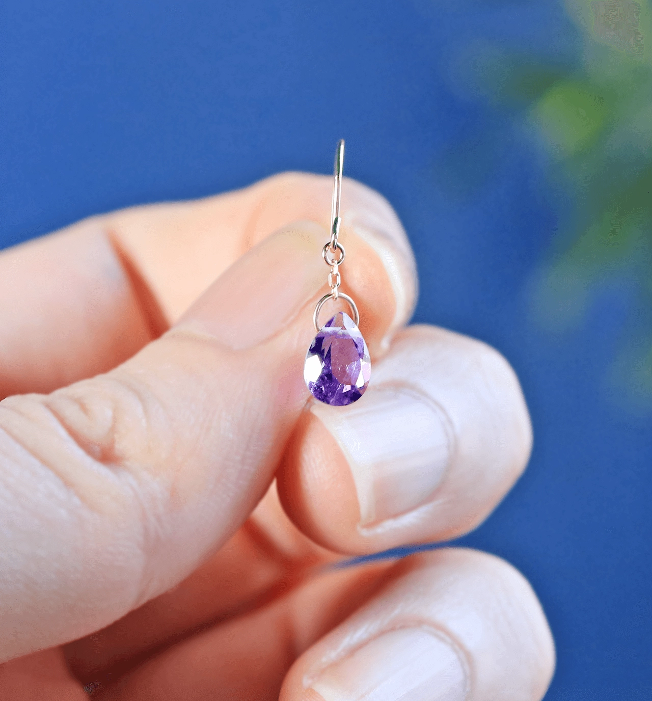 鮮やかな発色と、ペアシェイプのファセットカットによる強い煌めきが特徴。