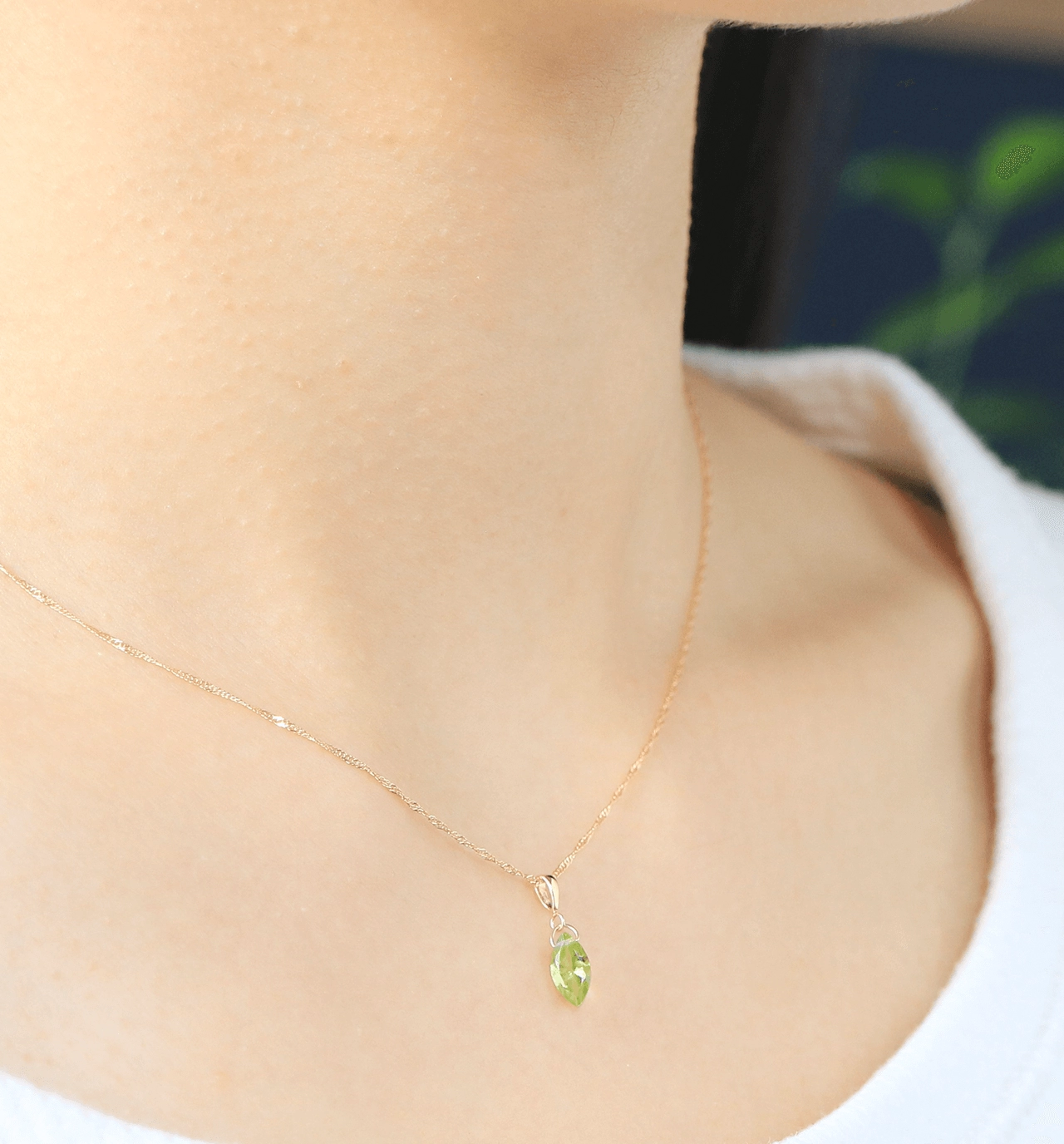 シンプルなデザインながらも、ゴールドの輝きと美しいグリーンカラーが胸元で存在感を放ち、夏のコーディネートの爽やかなアクセントにもぴったりのアイテム。