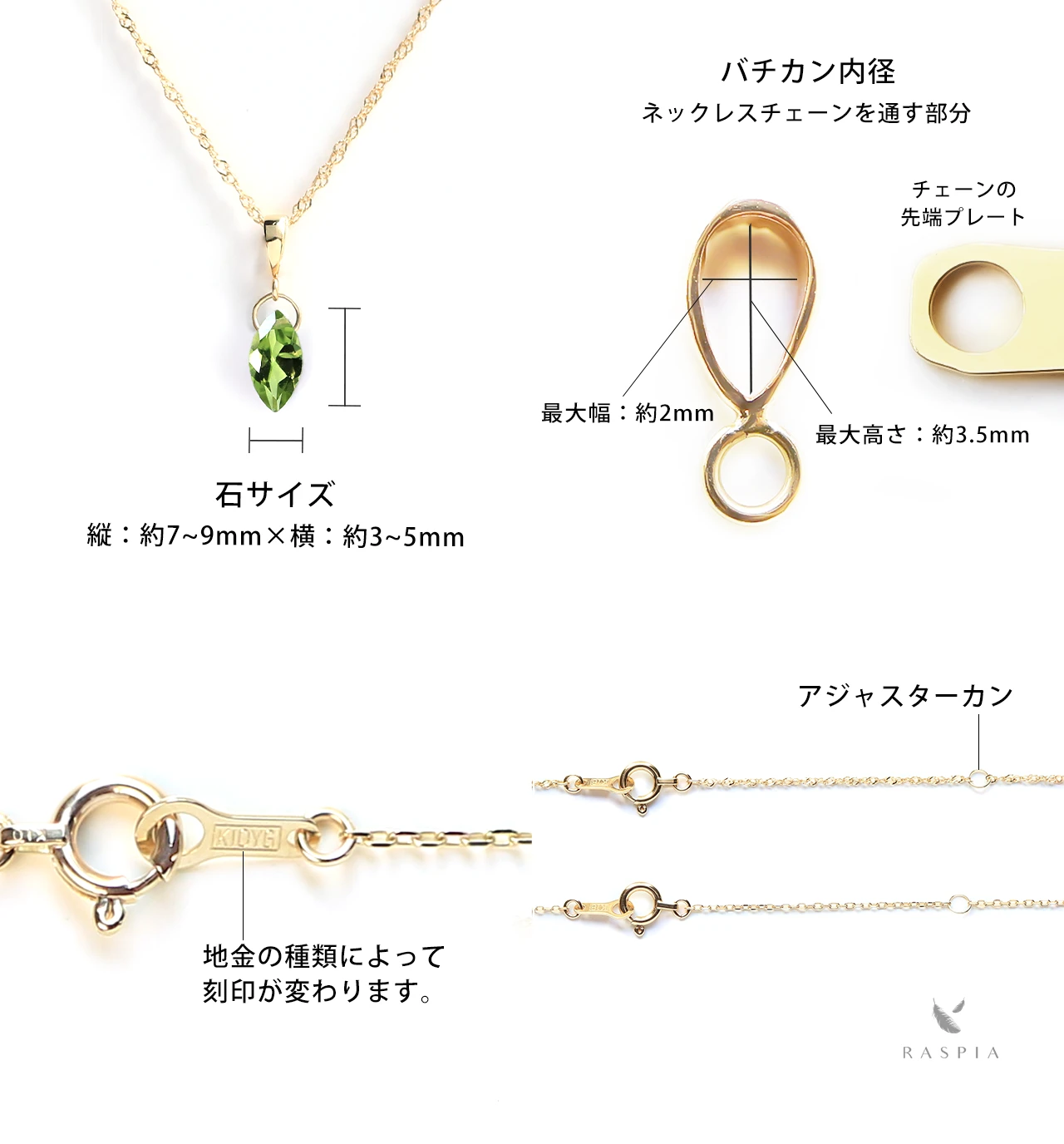 RASPIA(ラスピア)は、シンプルで大人可愛いデザインをイメージし、カラーストーン/天然石とK10(10金)/K18(18金)の本物のゴールド素材を使って手作りしています。