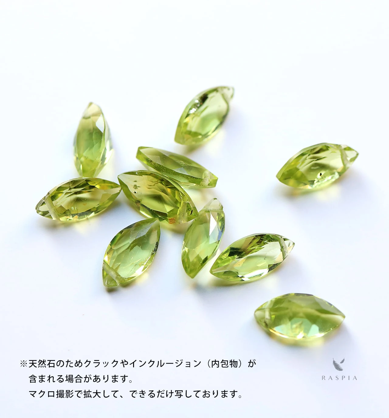 ※天然石のため、クラックやインクルージョン(内包物)が含まれることがあります。またペリドットには、「ダークスポット」と呼ばれる太陽の黒点のような特有の内包物が含まれる場合があります。