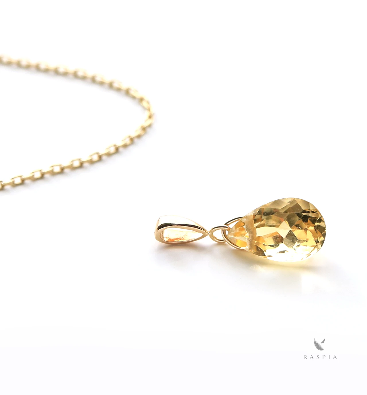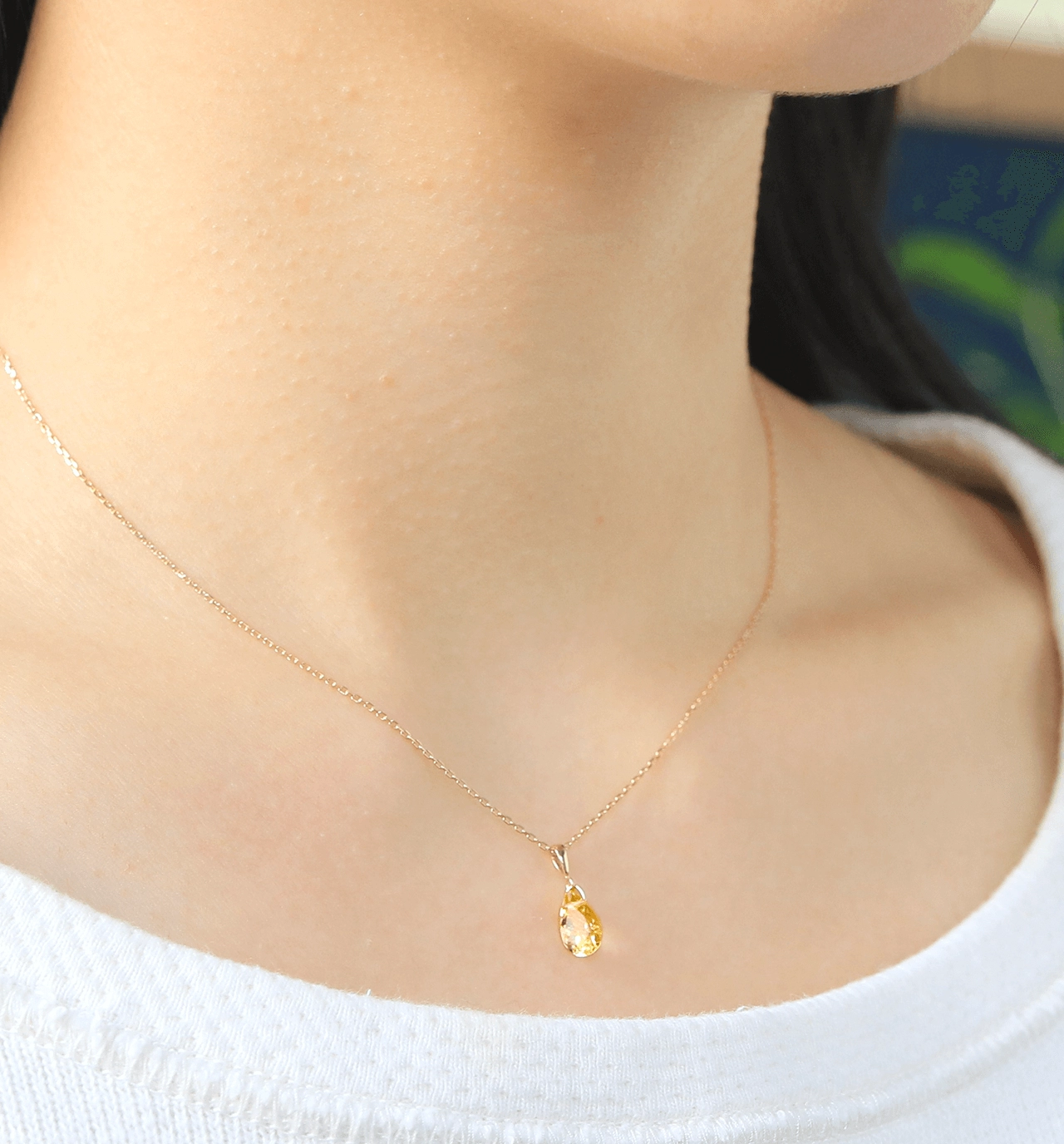 黄金の光をまとったような色味と表面の光沢が印象的な、シトリンを使用したネックレスチャームです。