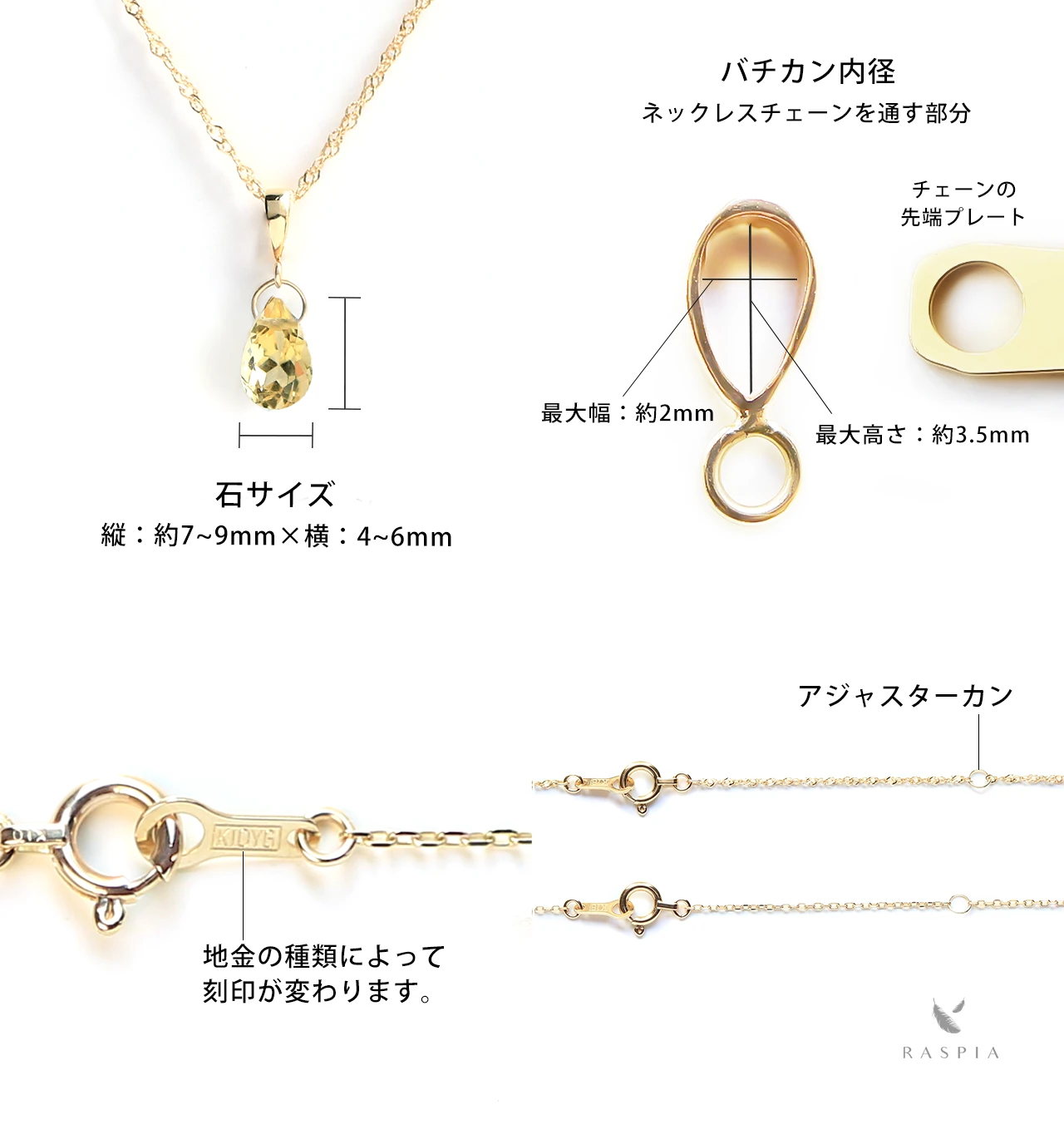 | サイズ | シトリン:縦 約7~9mm × 横 約4~6mm バチカン内径:高さ 最大(約)3.5mm/幅 最大(約)2mm チェーン全長は40cm・45cm・50cmよりお選びいただけます。 | ||
