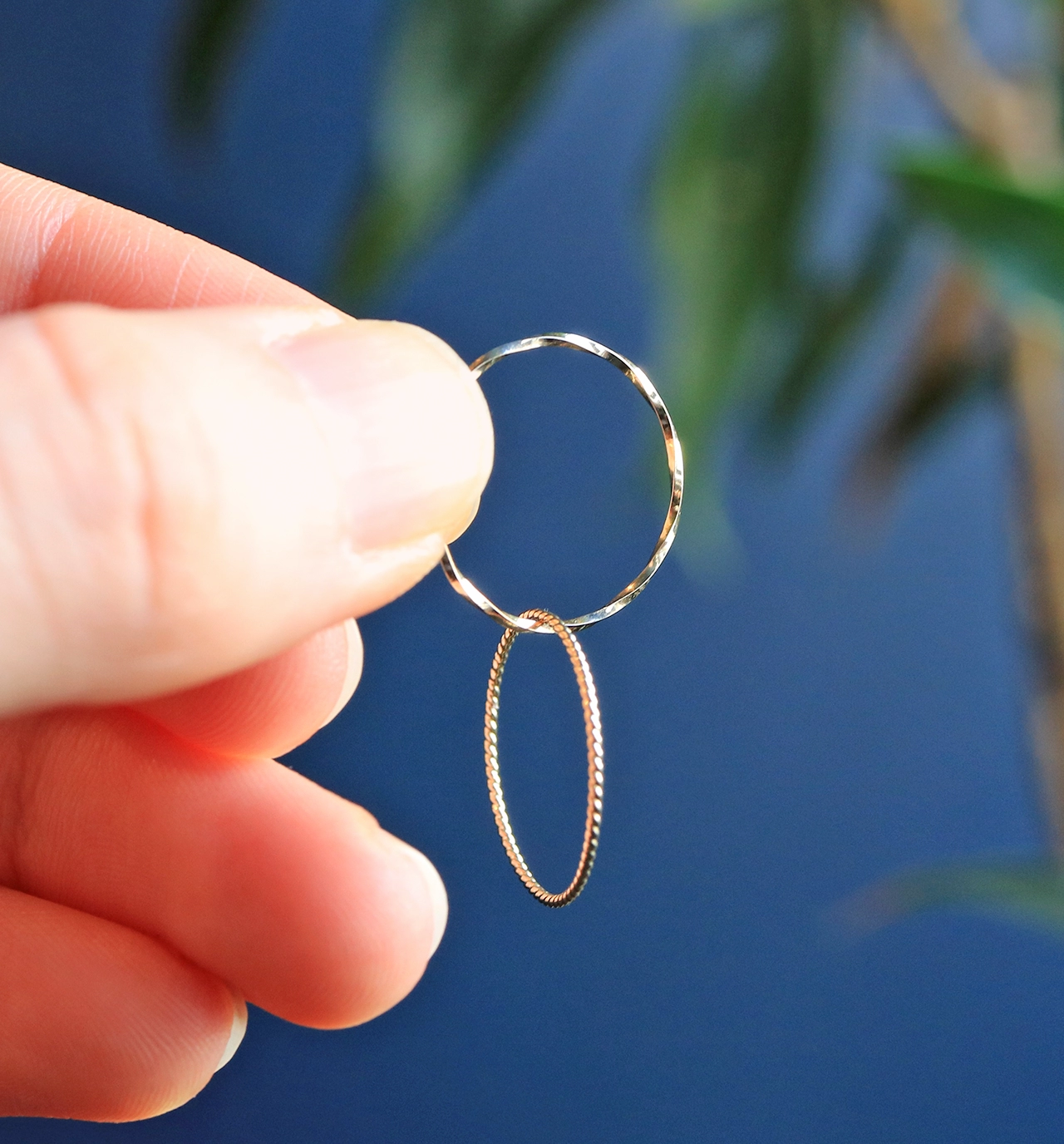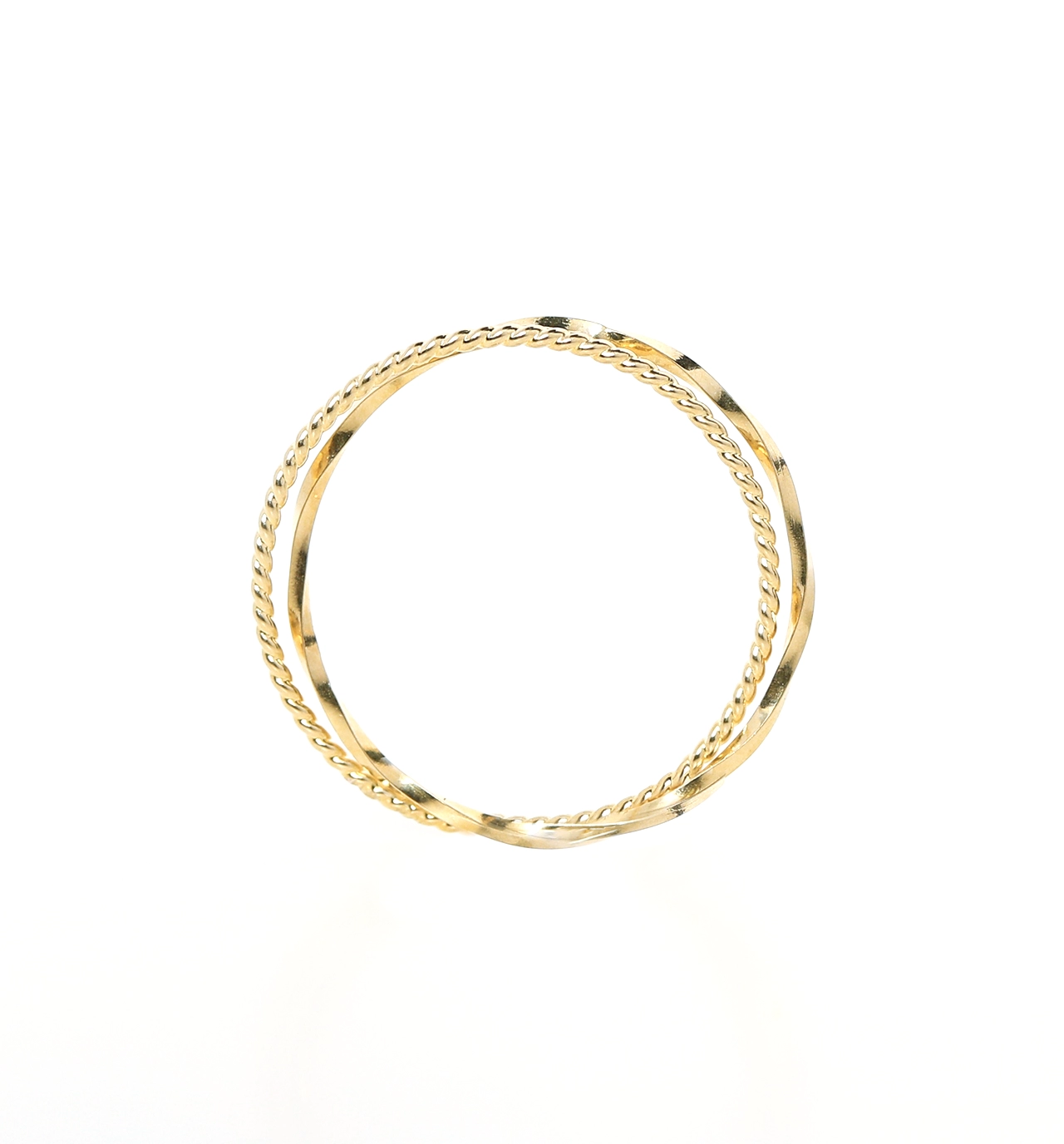 異なるねじれ加工を施した2つのリングがセットになった、2連ピンキーリングです。