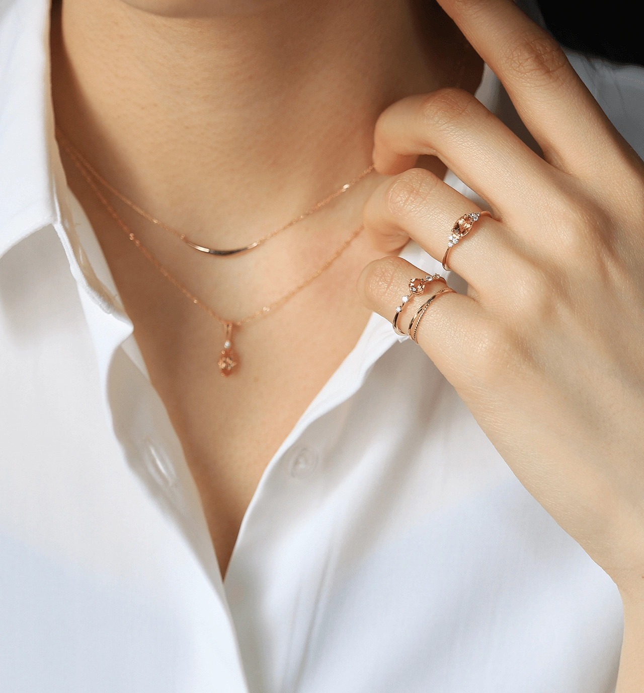 金が75%で、残りの25%に銅・銀・パラジウムを混ぜ合わせてつくられており、このうち銅の割合が多く含まれていることで、やわらかく淡いピンク色を表現しています。一方で、銅の性質上、サイズ直しなどの加工が難しい場合があるという点も特性のひとつです。特に、赤・ピンク・オレンジ系など暖色系のストーンと相性が良く、また肌の色にも近いため、ゴールドよりも肌なじみが良いと感じる方も多くいらっしゃいます。