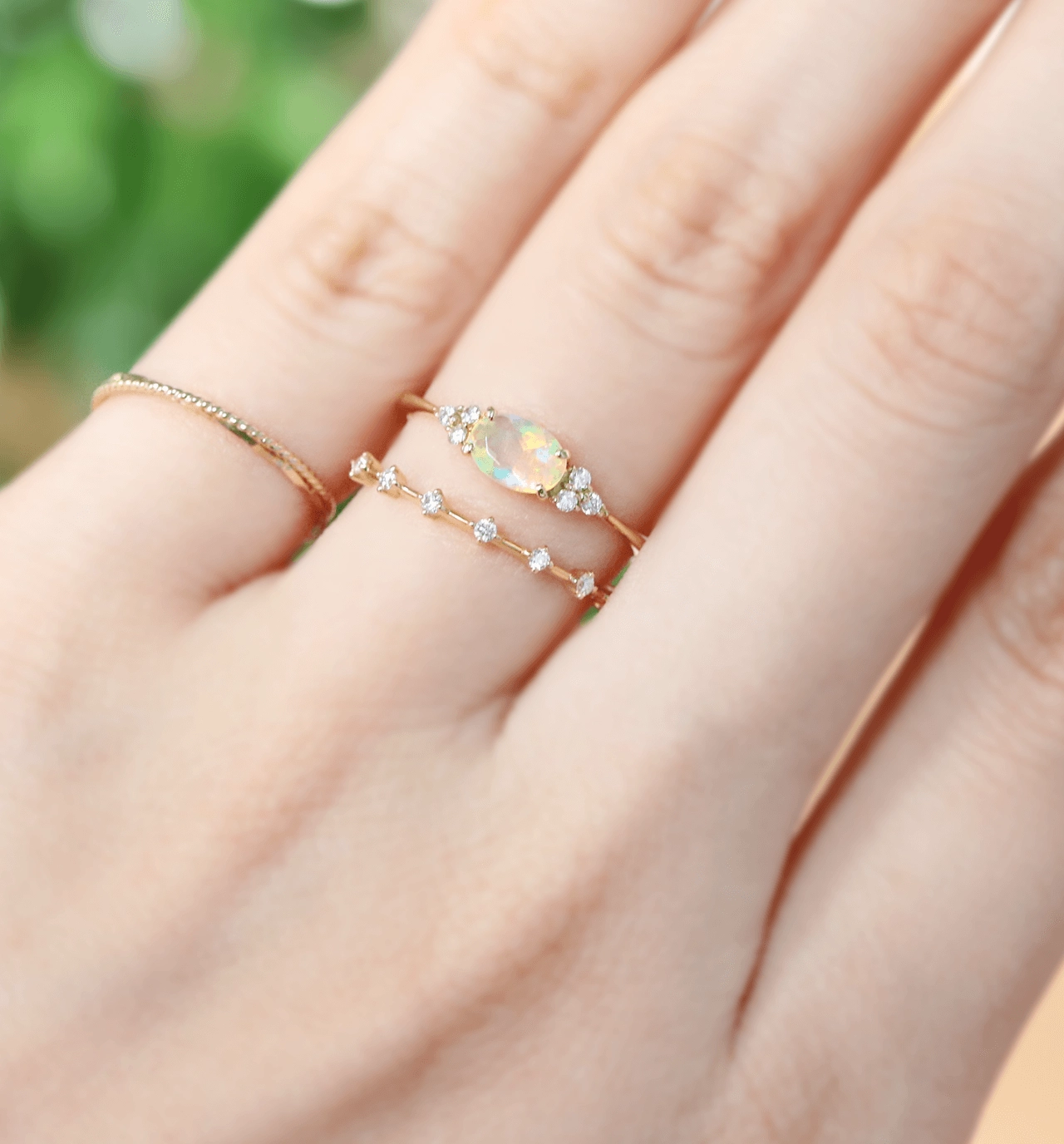 天然石リングとの重ね付けも相性抜群です。華奢なデザインのためどんなカラー・サイズの天然石とも調和し、華やかに引き立ててくれます。