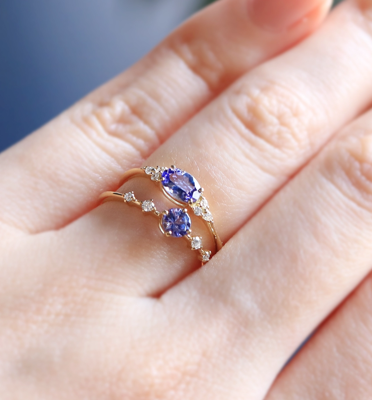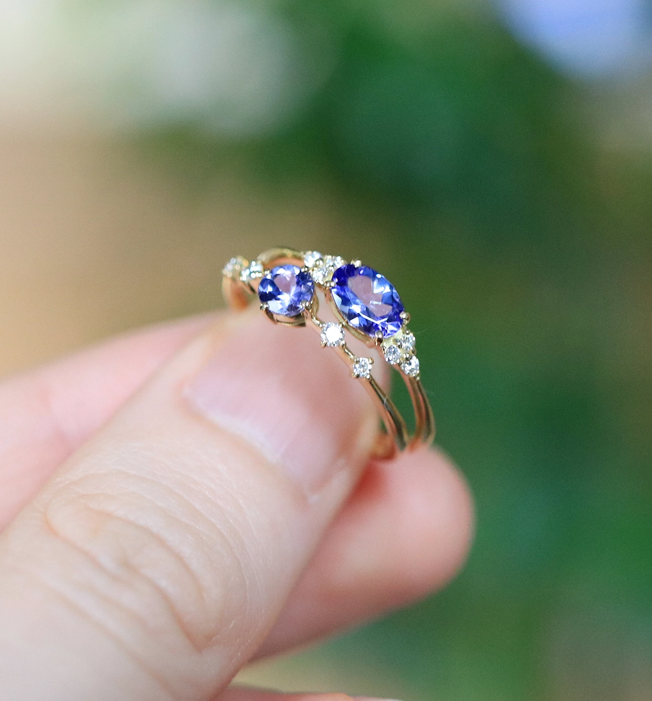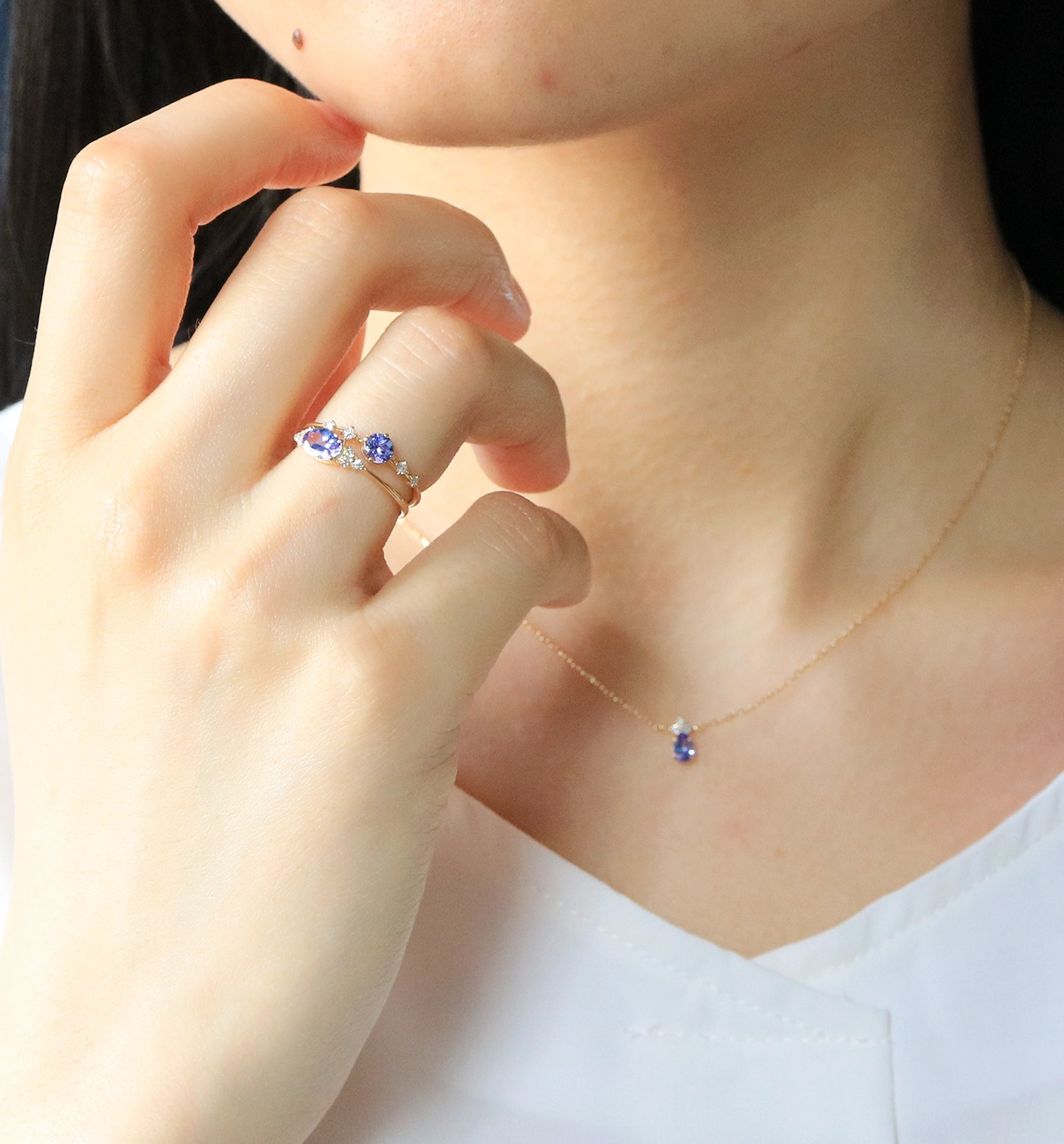| 石 | 【個数】 ・タンザナイト × 1石(タンザニア産) ・ダイヤモンド × 6石(SI~VSクラス相当) 【サイズ】 ・タンザナイト:約 4mm × 6mm × 1石 ・ダイヤモンド:直径 約 1.3mm × 6石 【カラット】 ・タンザナイト:約 0.45ct × 1石 ・ダイヤモンド:0.01ct × 6石 |