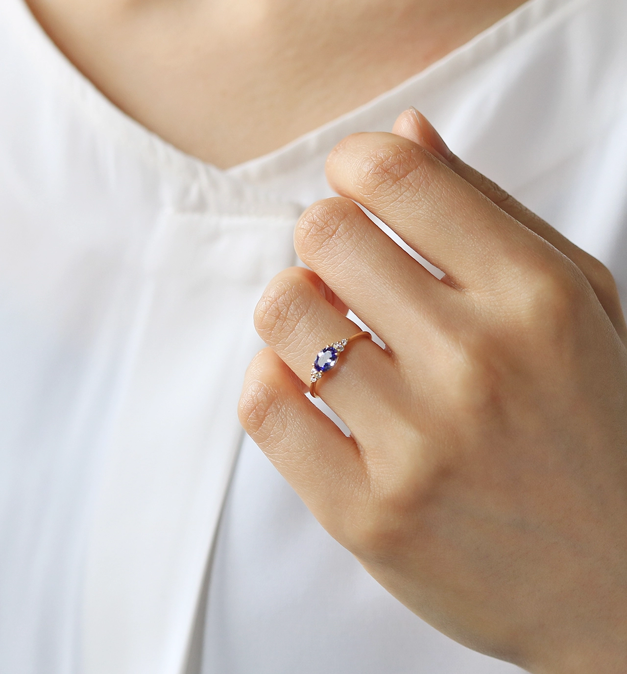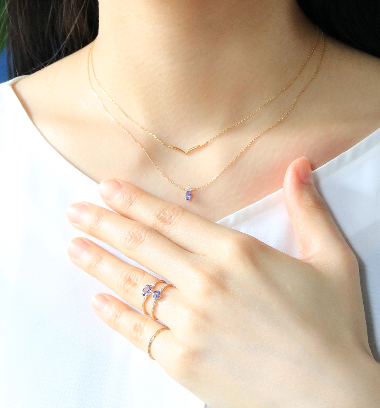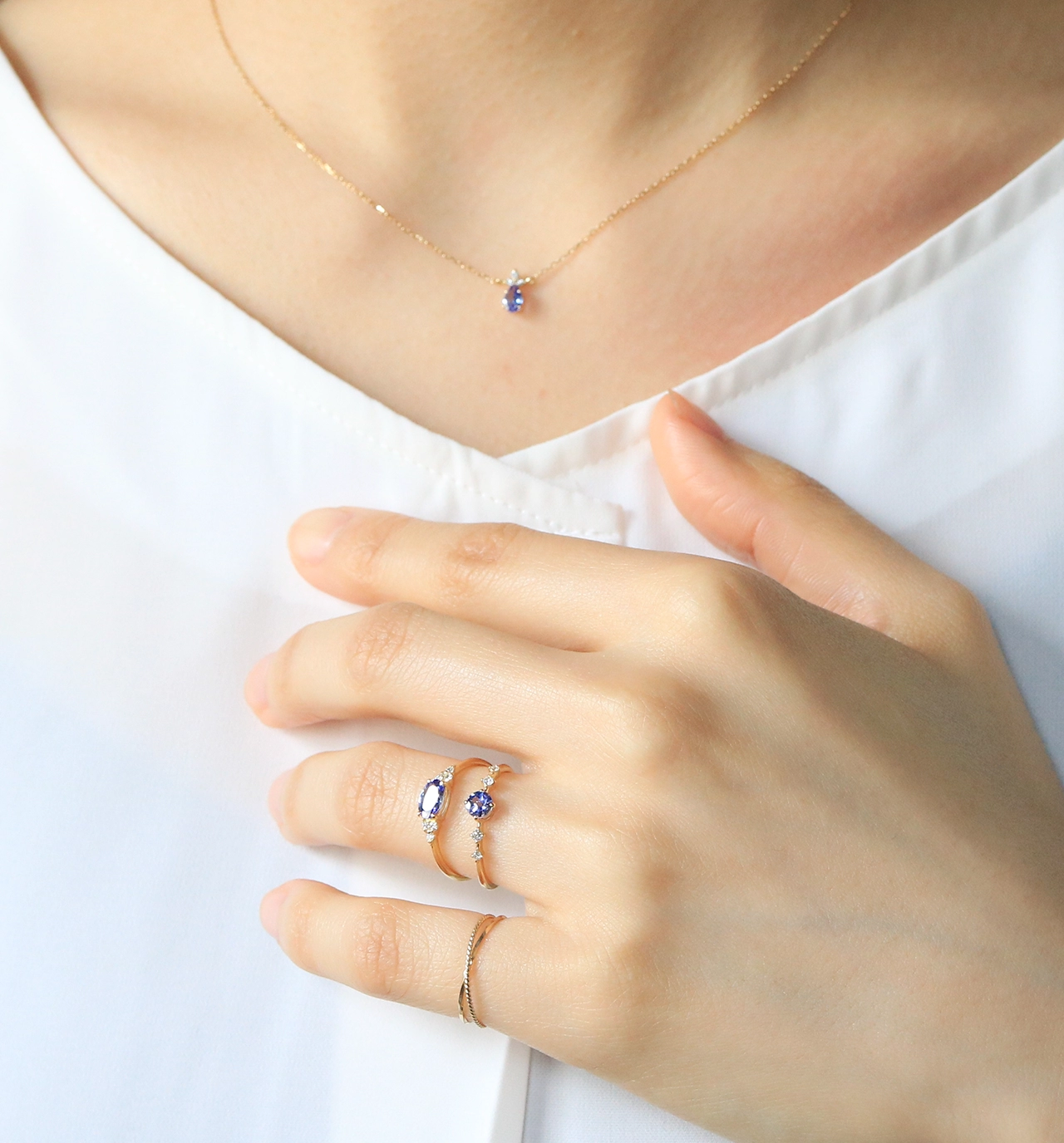 石が主役になる、そして鮮やかなカラーストーンの美しいきらめきが楽しめるリングになるように、細部までこだわり作り上げています。メイン石の左右に配置されたダイヤモンドがさらに気品とジュエリーの魅力を引き立たせます。指輪の重ね付けをしたり、Elloシリーズのネックレスと合わせたりと様々なコーディネートでお楽しみください。