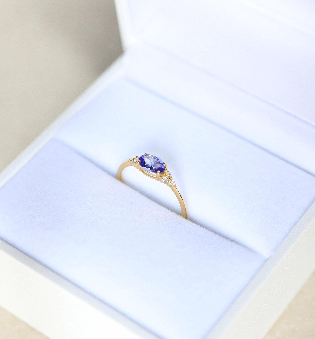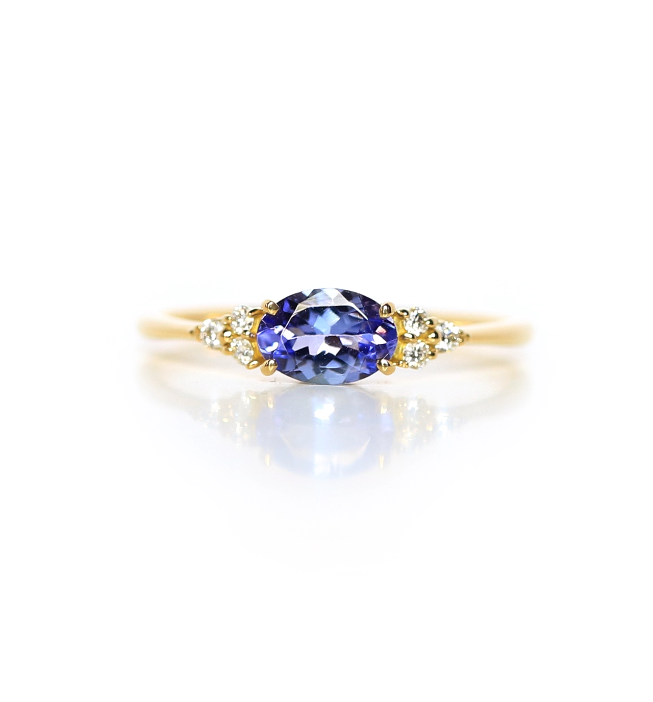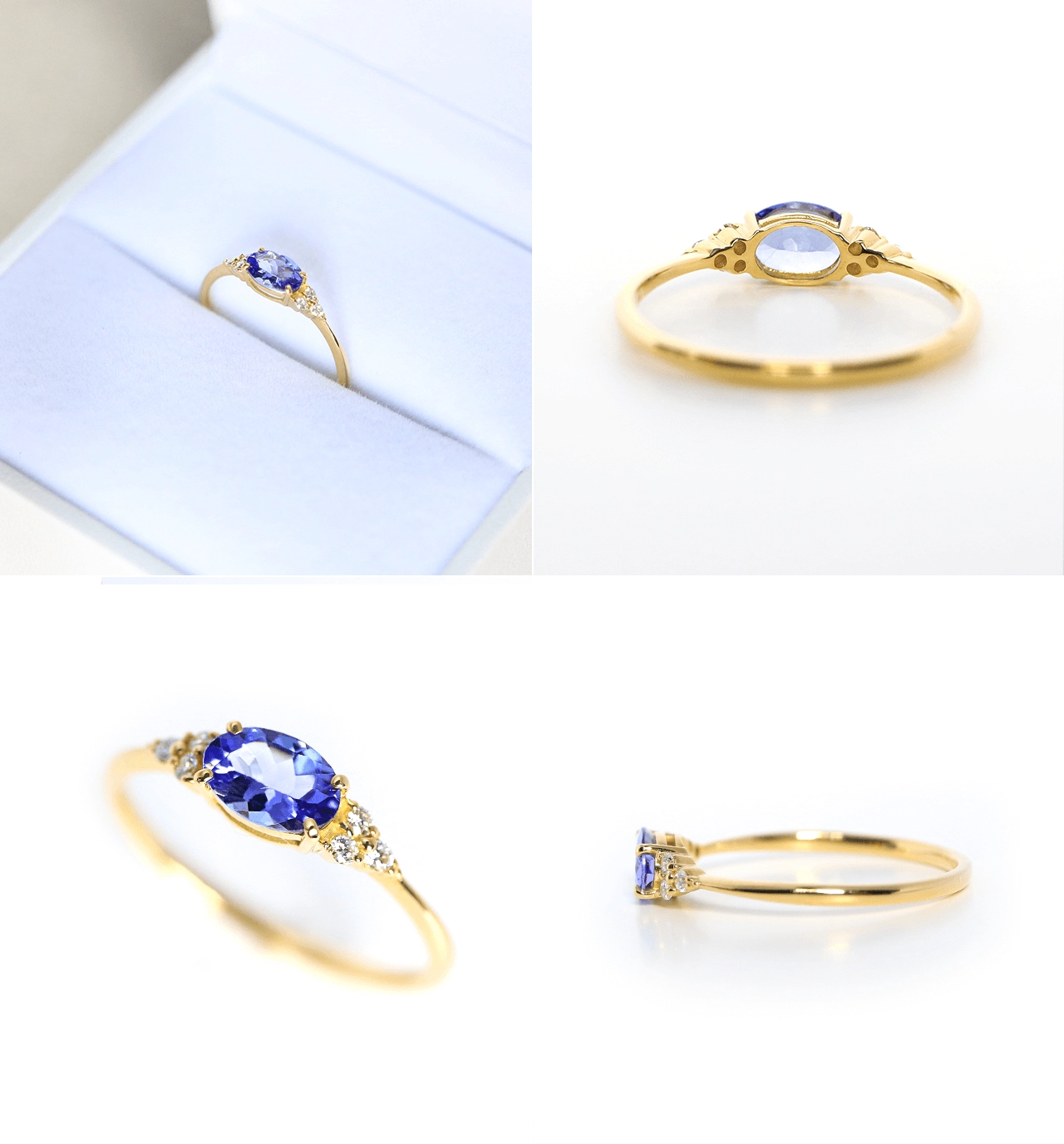 タンザナイトのオーバルカットをメインに、6つのメレダイヤを左右にセットしたK18リングです。タンザニアのメレラニ鉱山でのみ産出される「タンザナイト」は、 特有のパープルブルーが魅力的な人気の宝石です。また12月の誕生石です。