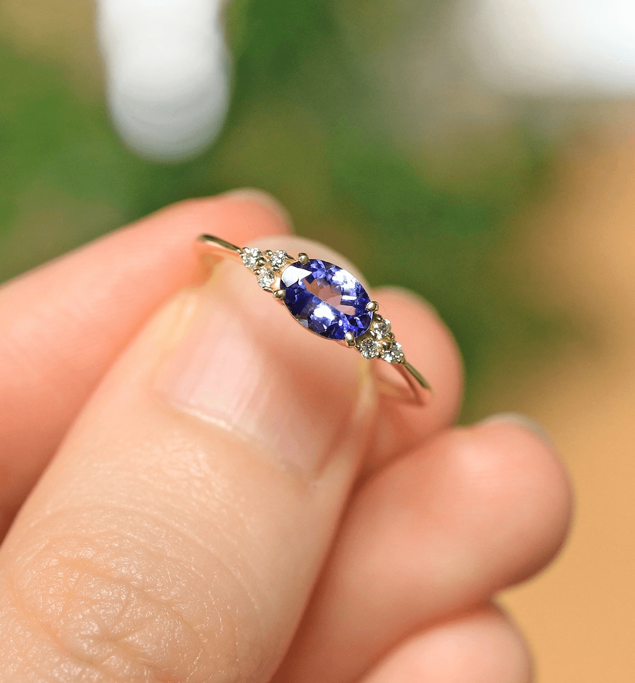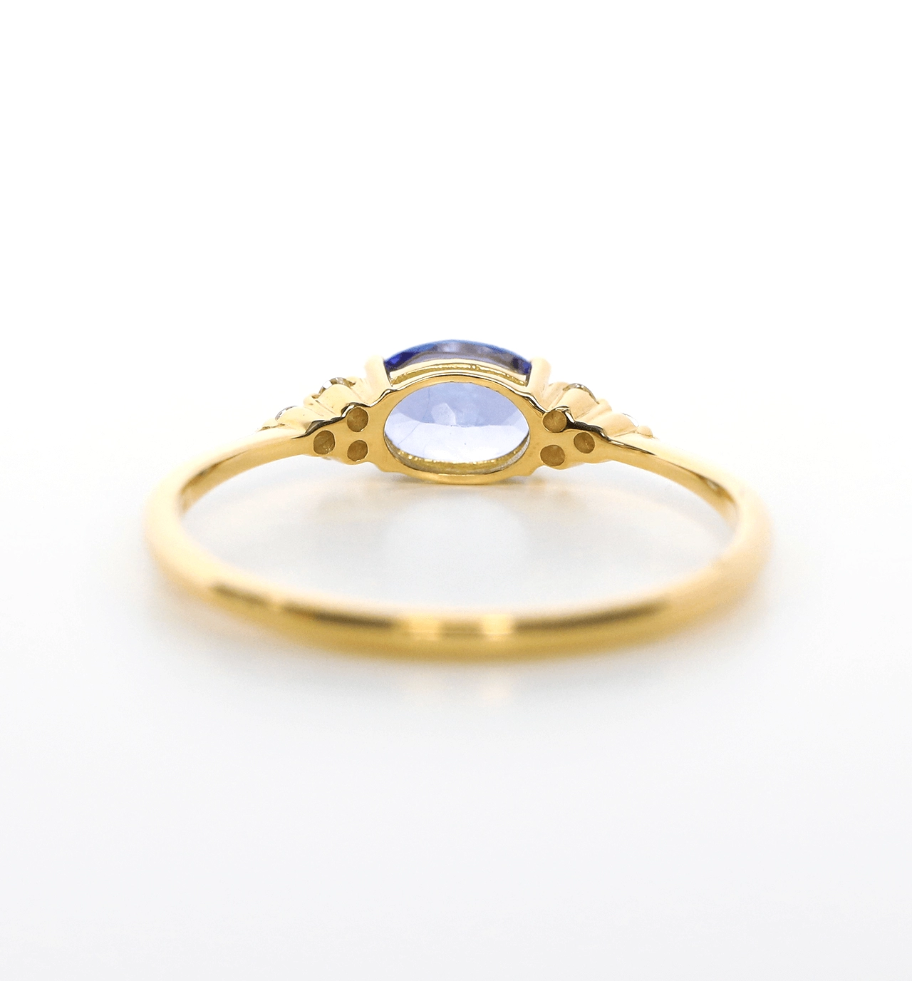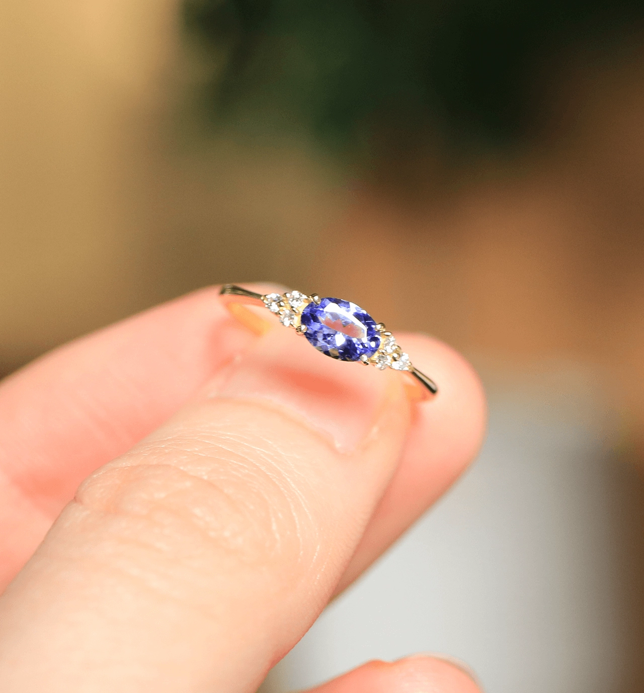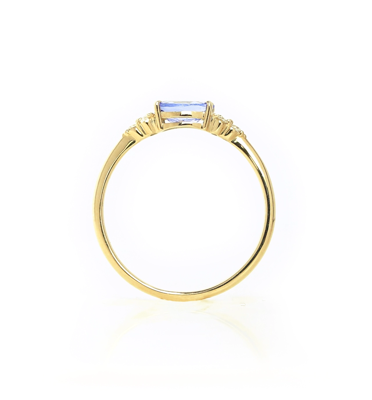 タンザナイトのオーバルカットをメインに、6つのメレダイヤを左右にセットしたK18リングです。タンザニアのメレラニ鉱山でのみ産出される「タンザナイト」は、 特有のパープルブルーが魅力的な人気の宝石です。また12月の誕生石です。