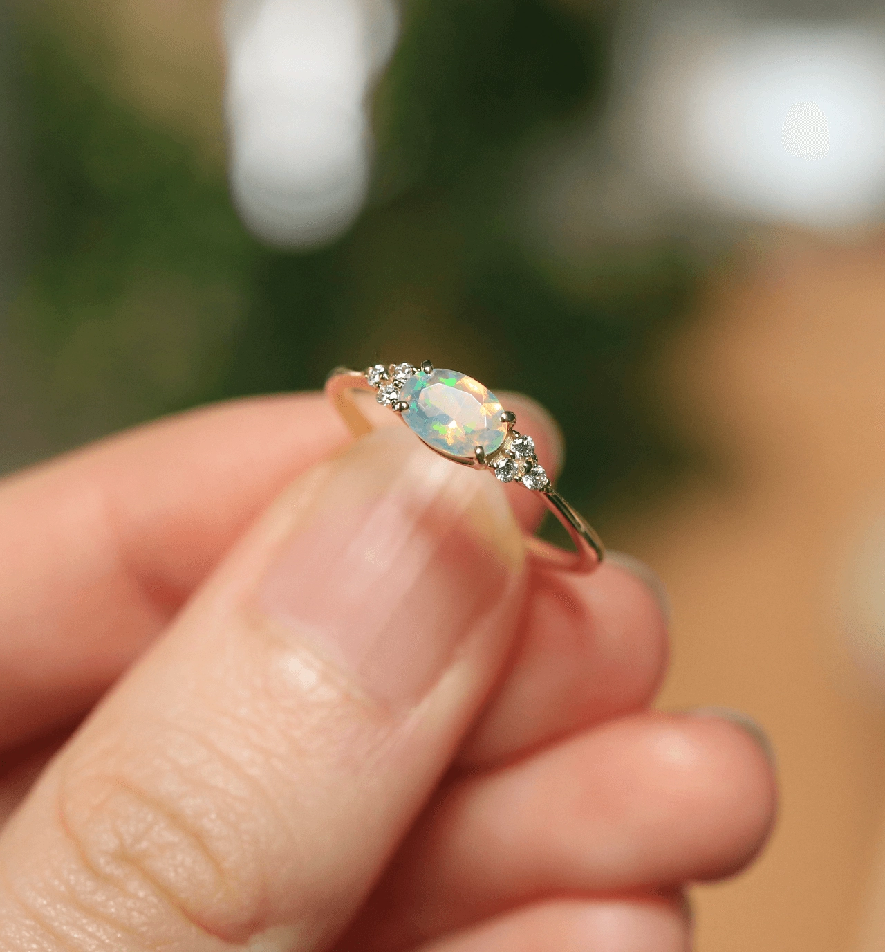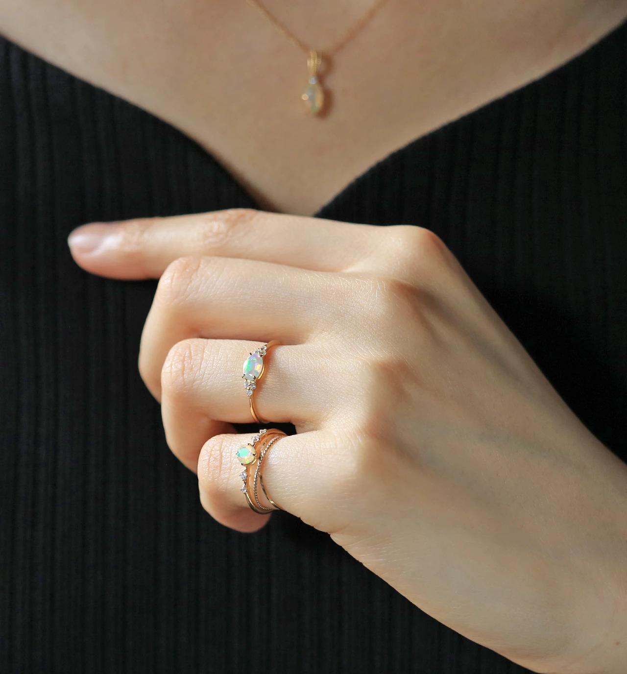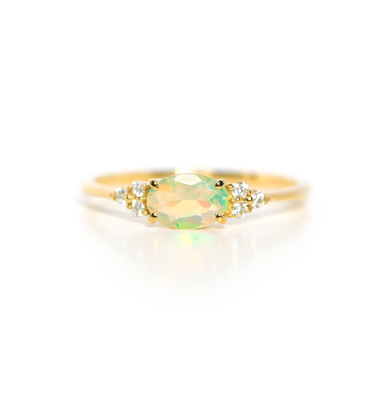 プレシャスオパールのオーバルカットをメインに、6つのメレダイヤを左右にセットしたK18リングです。エチオピア産の高品質な「プレシャスオパール」のカット面から様々な色が織りなす遊色がお楽しみいただけます。オパールは10月の誕生石です。