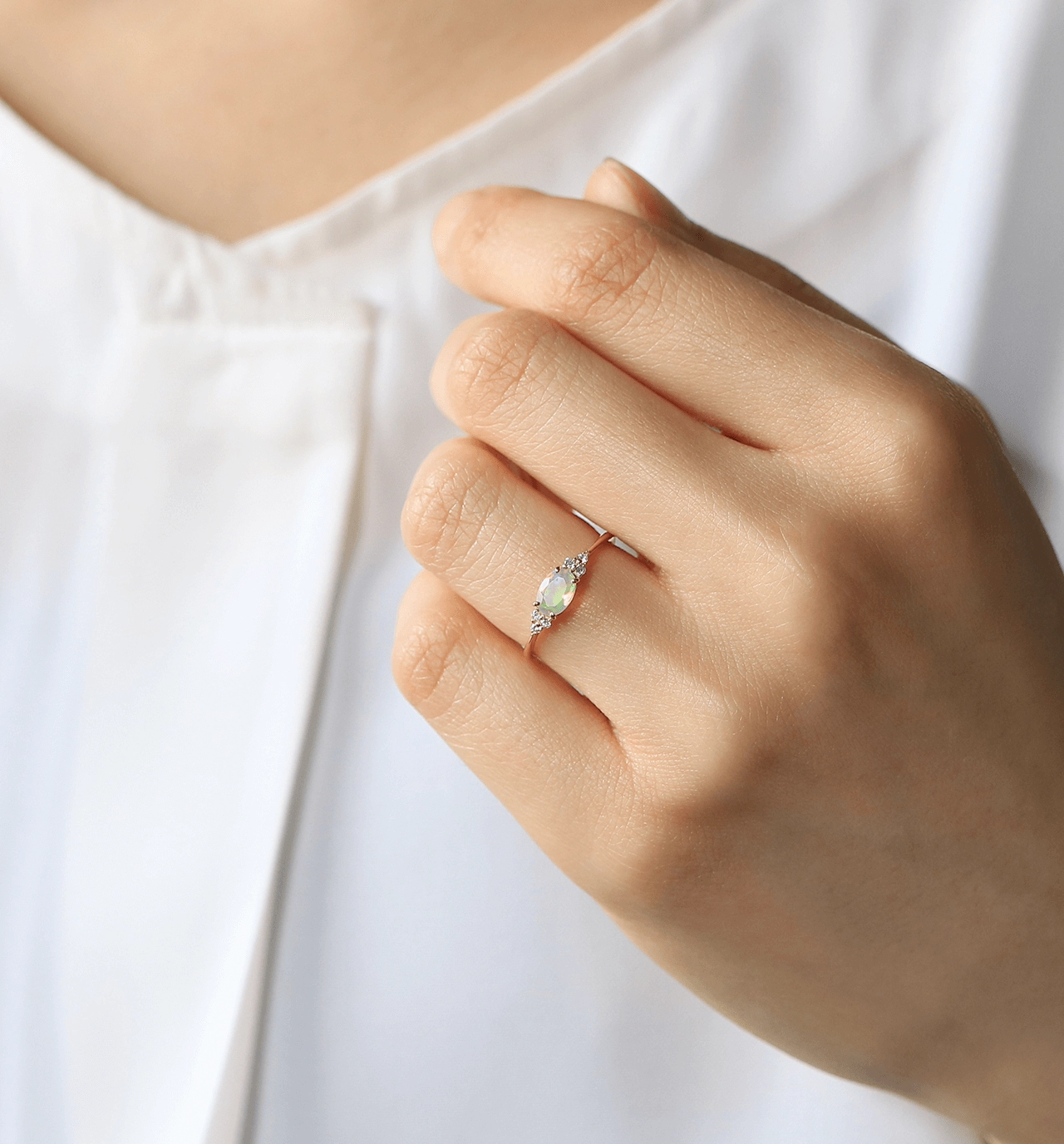 | 石 | 【個数】 ・プレシャスオパール × 1石(エチオピア産) ・ダイヤモンド × 6石(SI~VSクラス相当) 【サイズ】 ・プレシャスオパール:約 4mm × 6mm × 1石 ・ダイヤモンド:直径 約 1.3mm × 6石 【カラット】 ・プレシャスオパール:約 0.45ct × 1石 ・ダイヤモンド:0.01ct × 6石 |