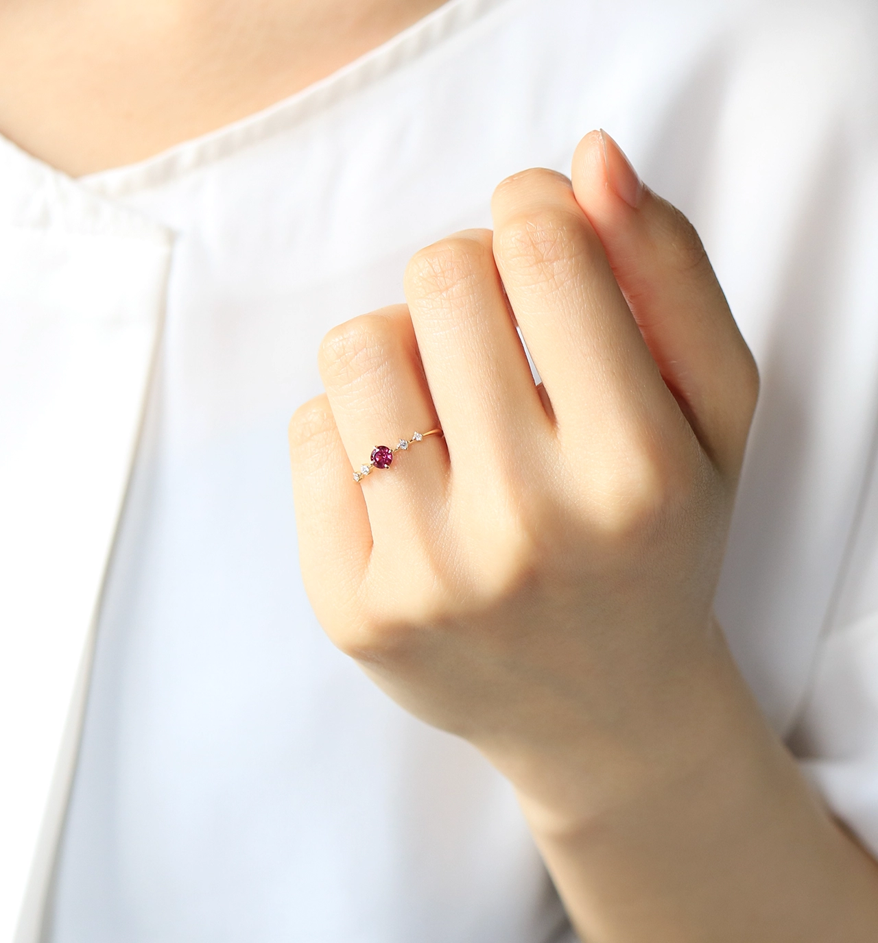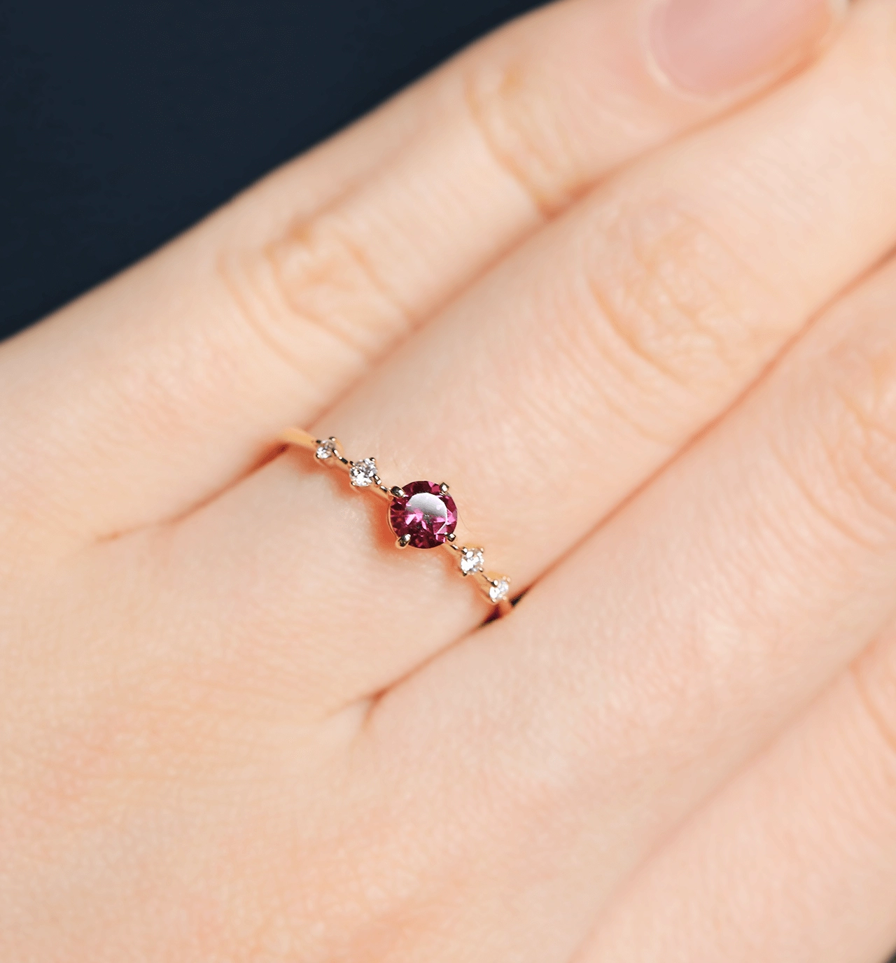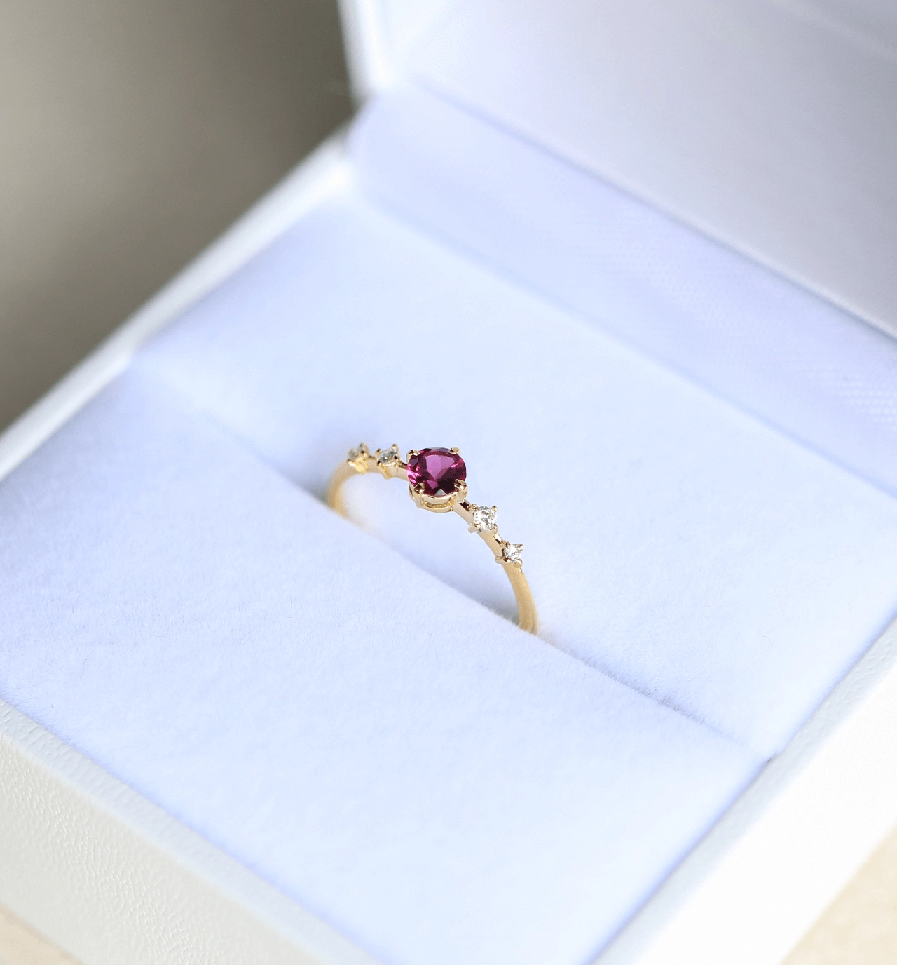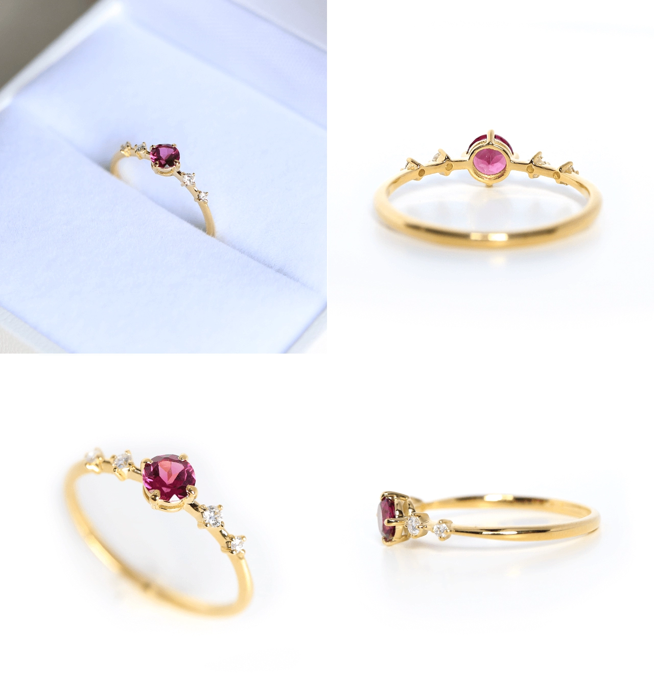 ロードライドガーネットのラウンドカットをメインに、4つのメレダイヤを配したリングです。バラの花びらのようなワインレッドカラーが魅力的なロードライトガーネットは、1月の誕生石としても有名です。