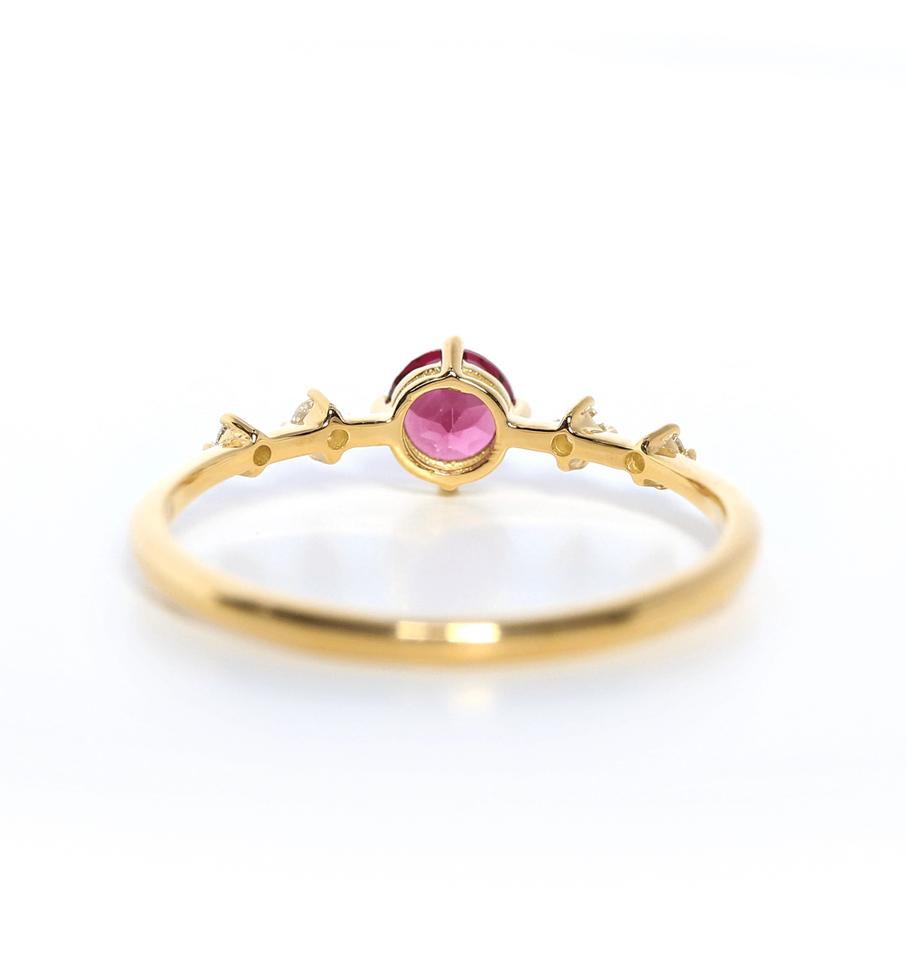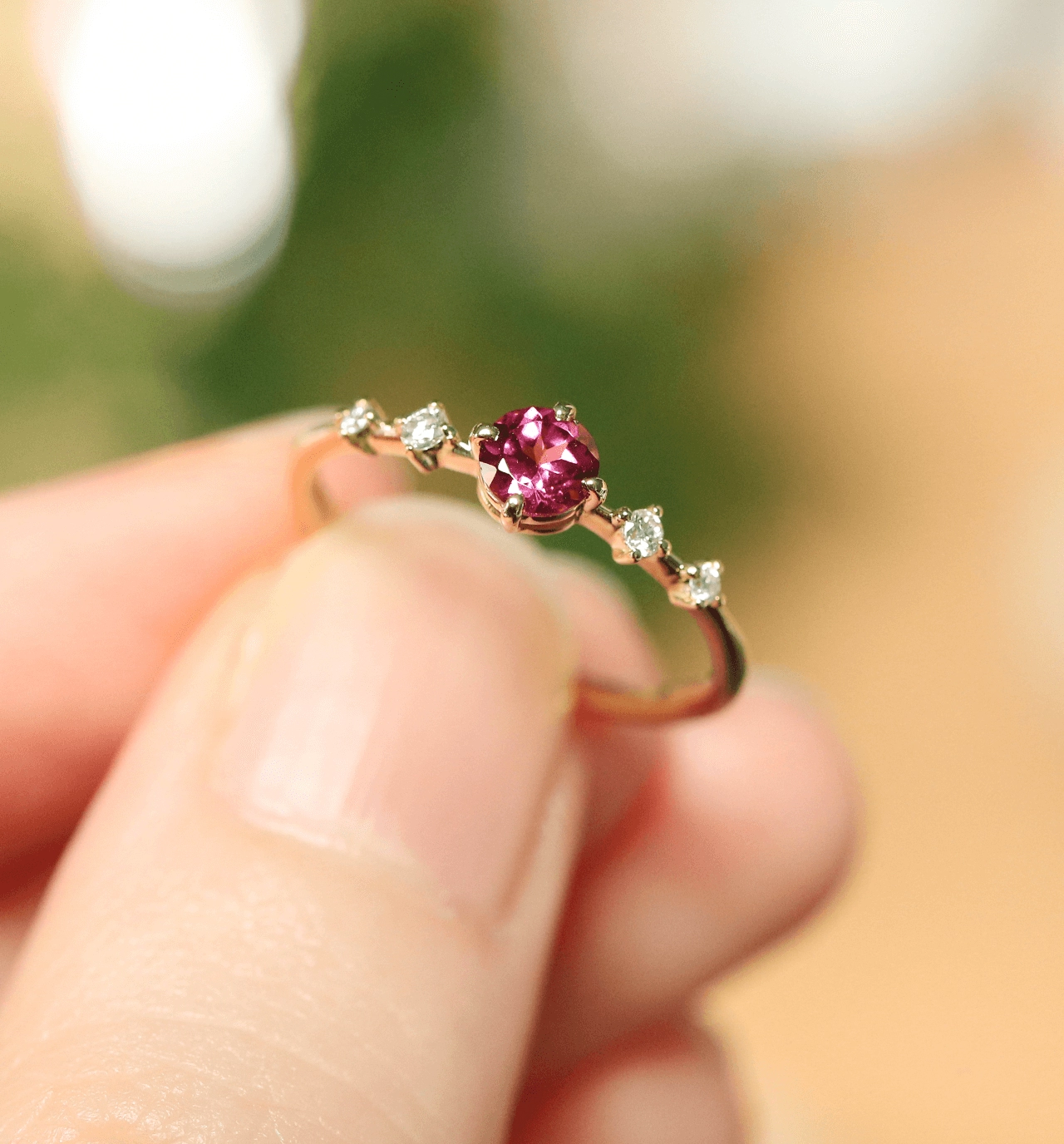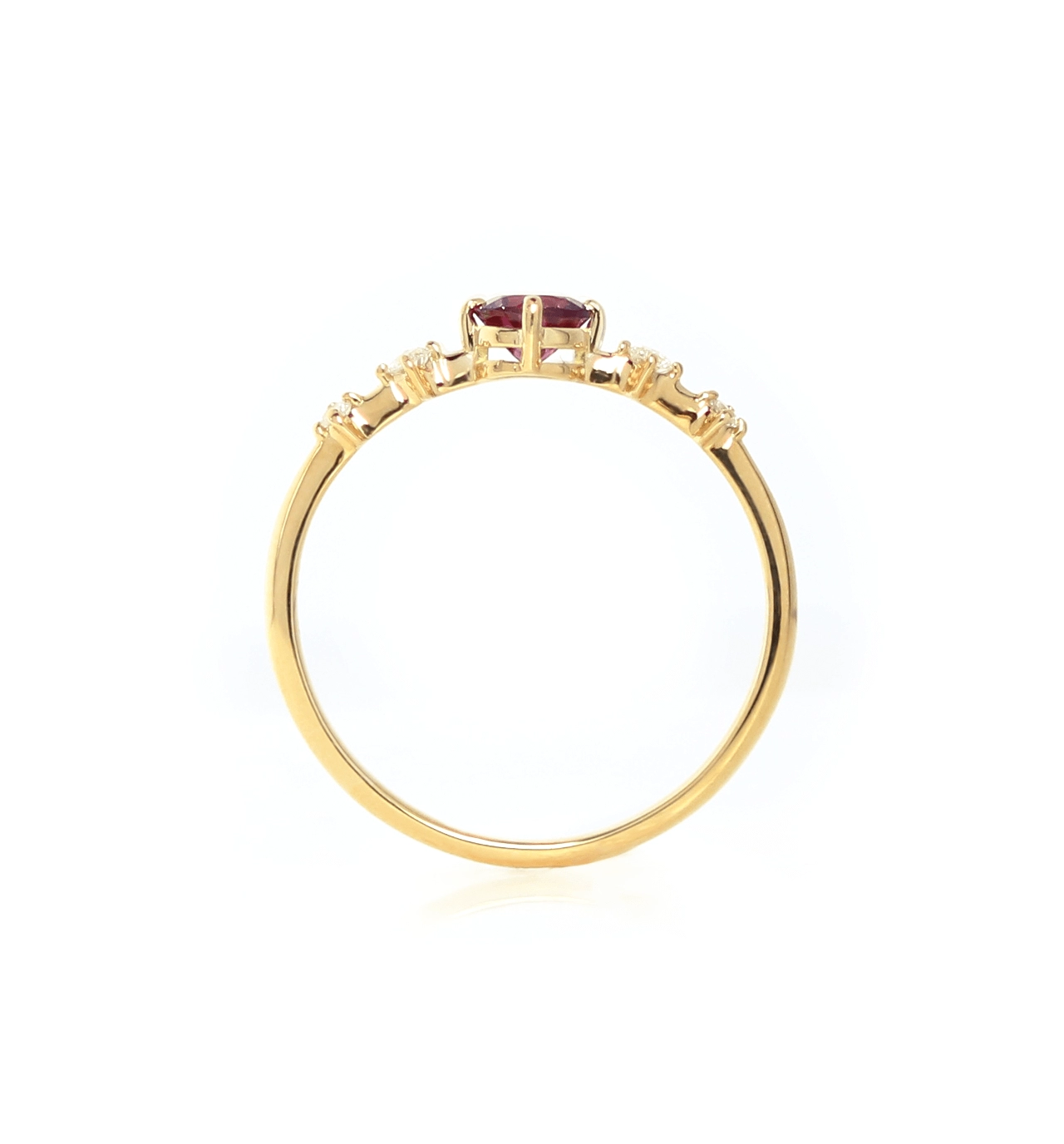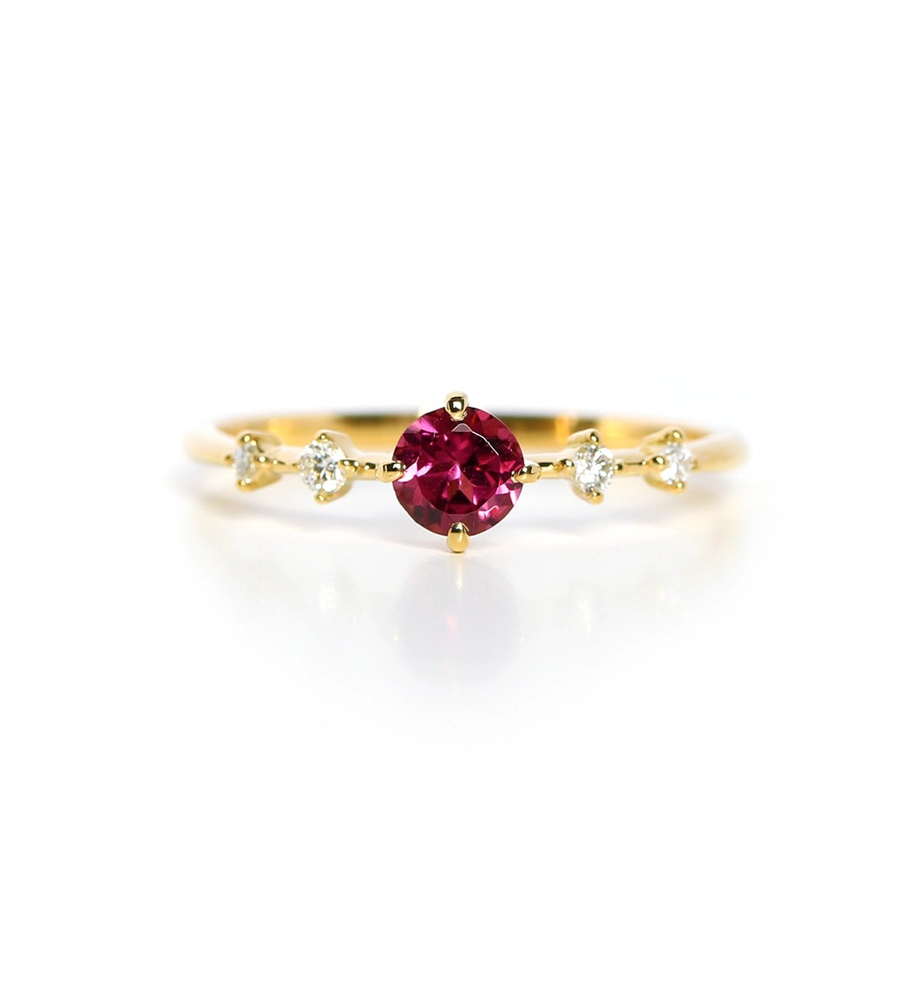 ロードライドガーネットのラウンドカットをメインに、4つのメレダイヤを配したリングです。バラの花びらのようなワインレッドカラーが魅力的なロードライトガーネットは、1月の誕生石としても有名です。