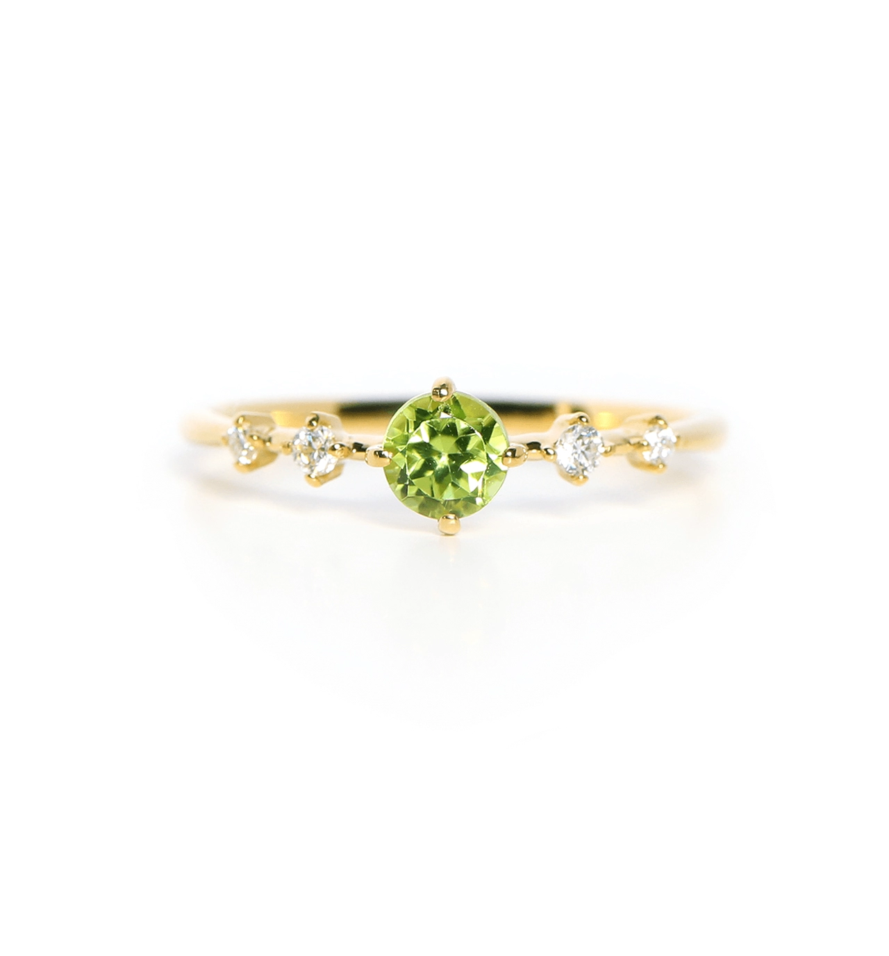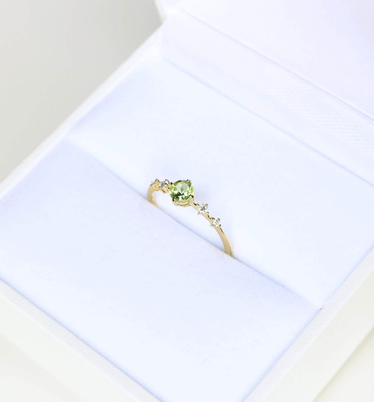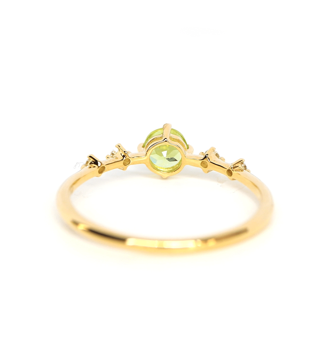 ペリドットのラウンドカットをメインに、4つのメレダイヤを配したK18リングです。