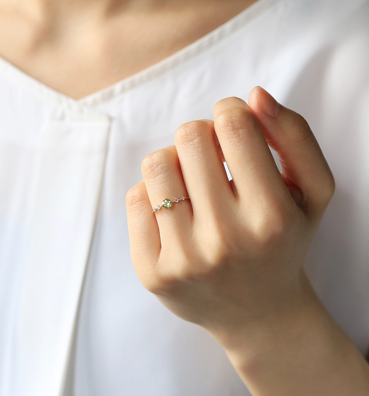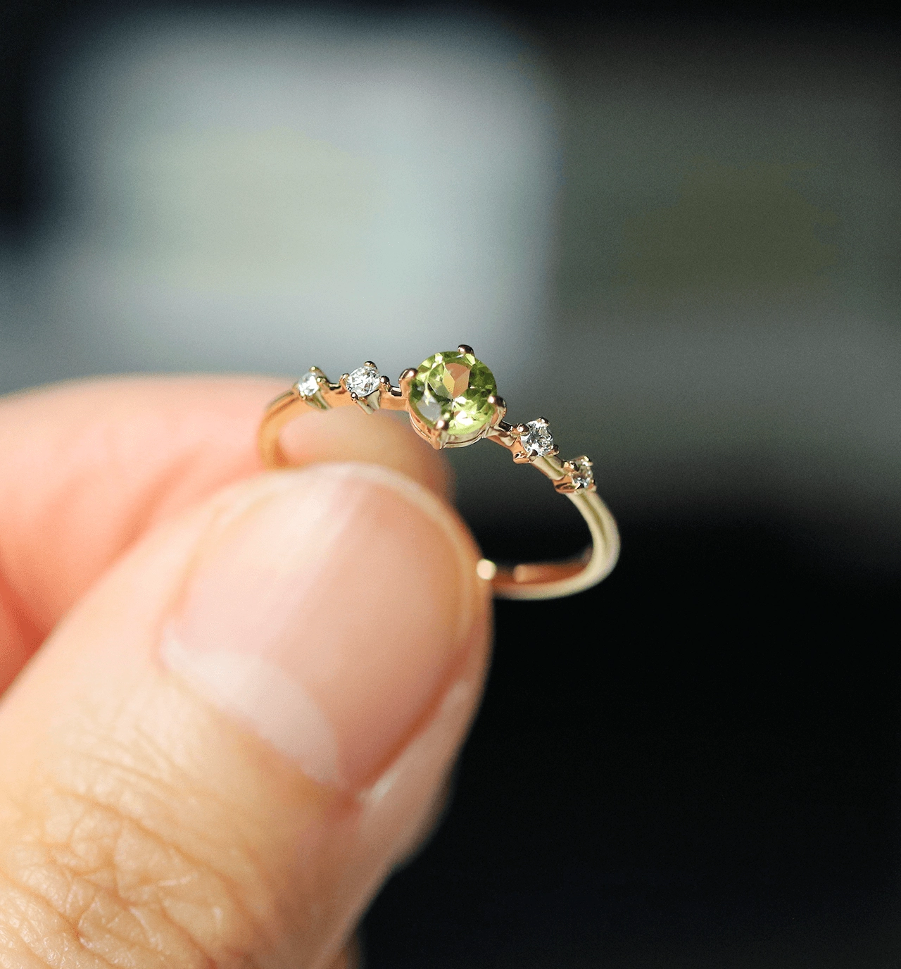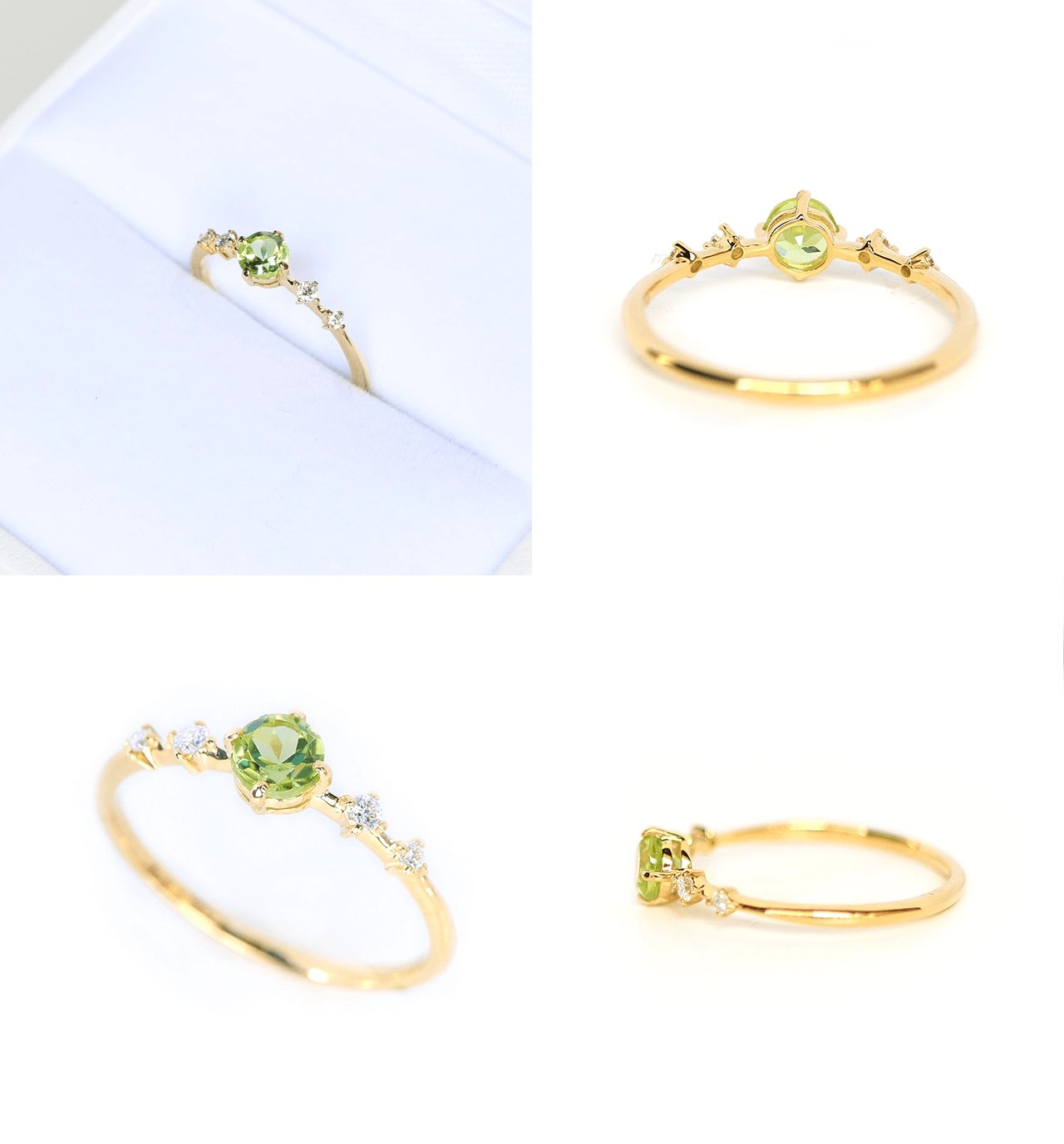 ペリドットのラウンドカットをメインに、4つのメレダイヤを配したK18リングです。