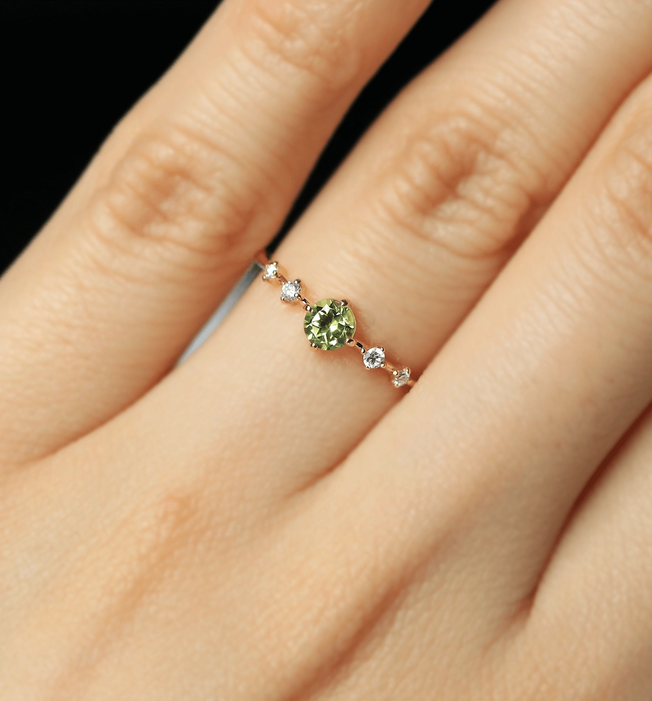 オリーブグリーンの輝きが印象的なペリドットは、「太陽の石」とも呼ばれる人気の宝石で、8月の誕生石です。