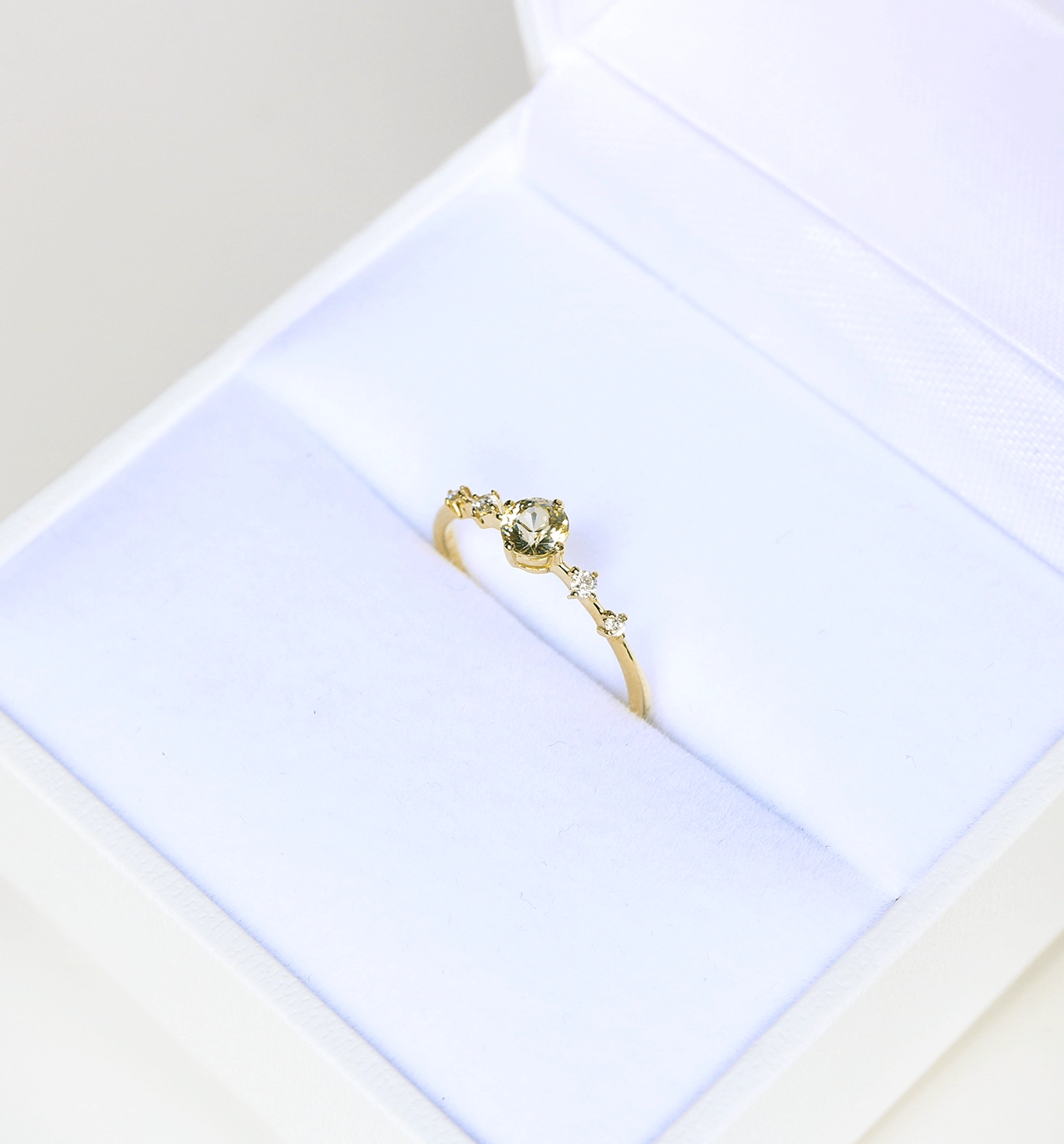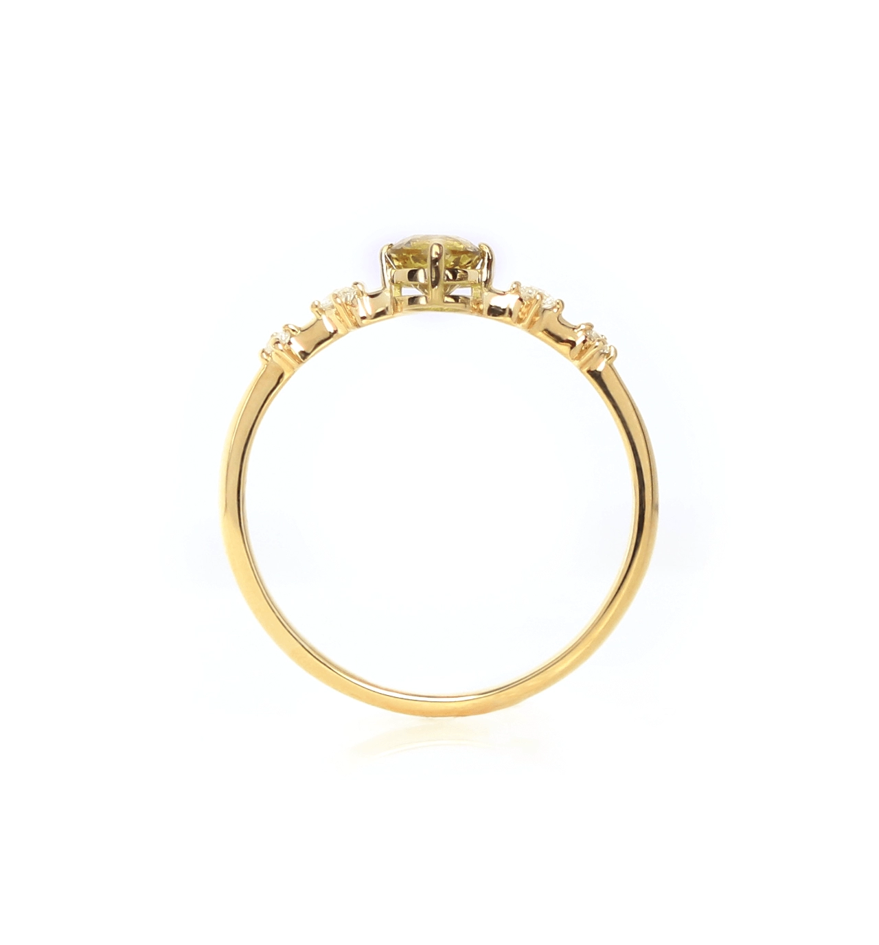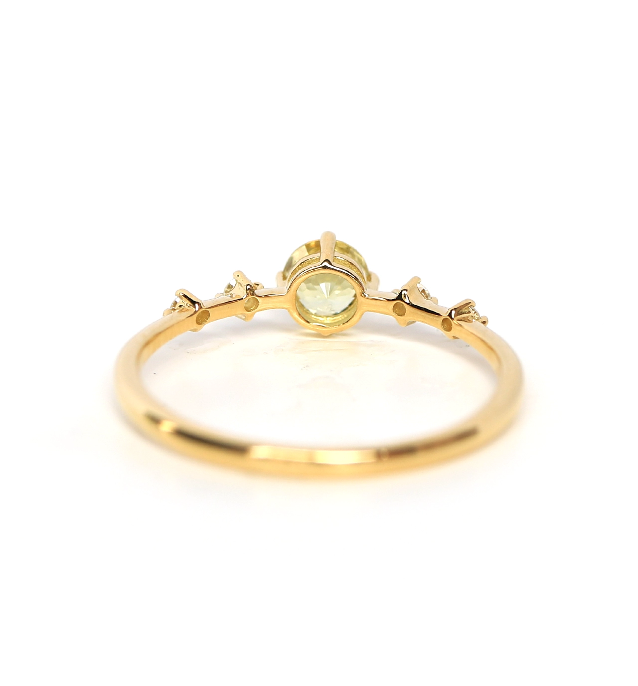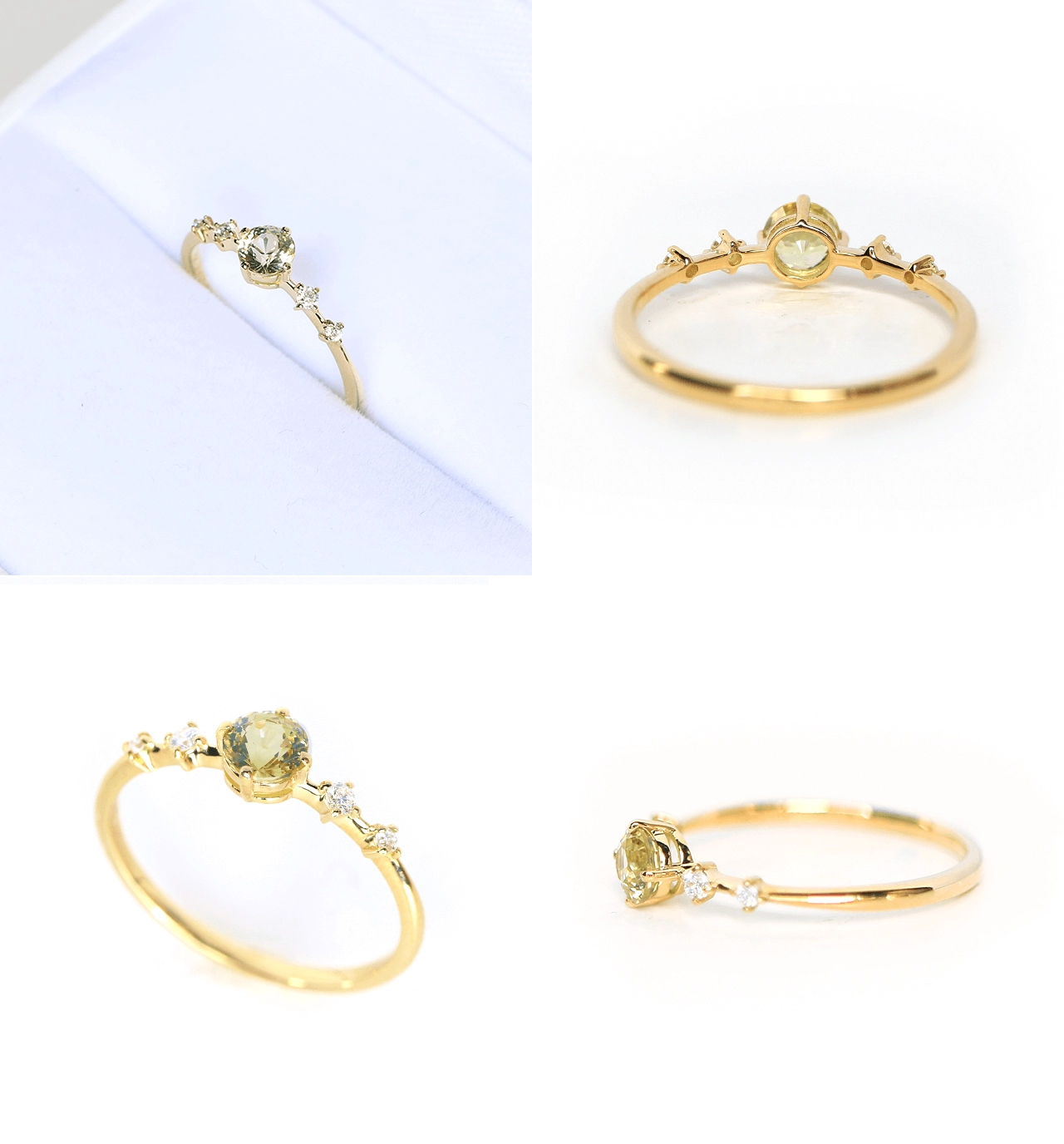 クリソベリルのラウンドカットをメインに、4つのメレダイヤを配したK18リングです。特有のイエローゴールドと強い輝きと美しい煌めきが魅力的な宝石です。