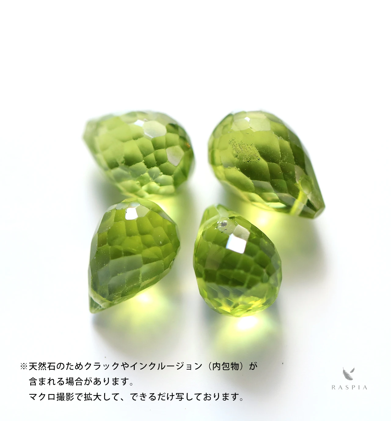 ※天然石のため、クラックやインクルージョン(内包物)が含まれることがあります。またペリドットには、「ダークスポット」と呼ばれる太陽の黒点のような特有の内包物が含まれる場合があります。