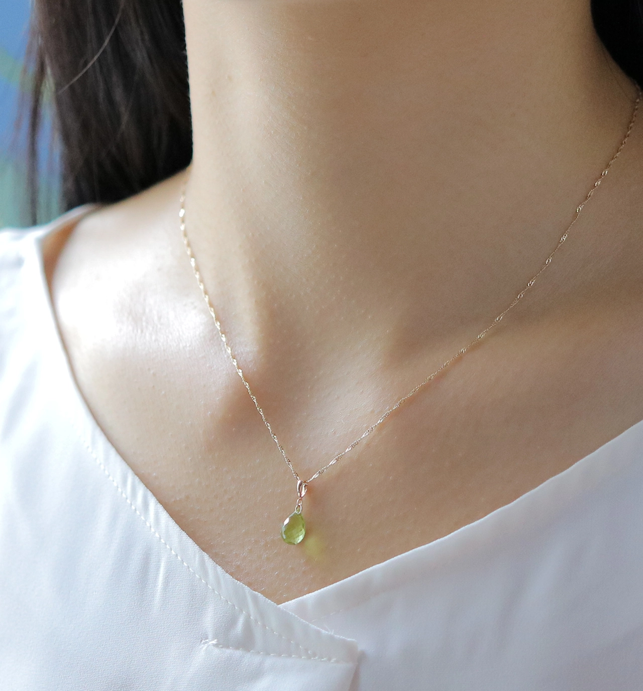 シンプルなデザインながらも、ゴールドの輝きと美しいグリーンカラーが胸元で存在感を放ち、夏のコーディネートの爽やかなアクセントにもぴったりのアイテム。