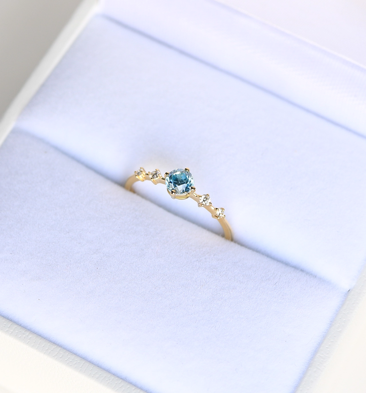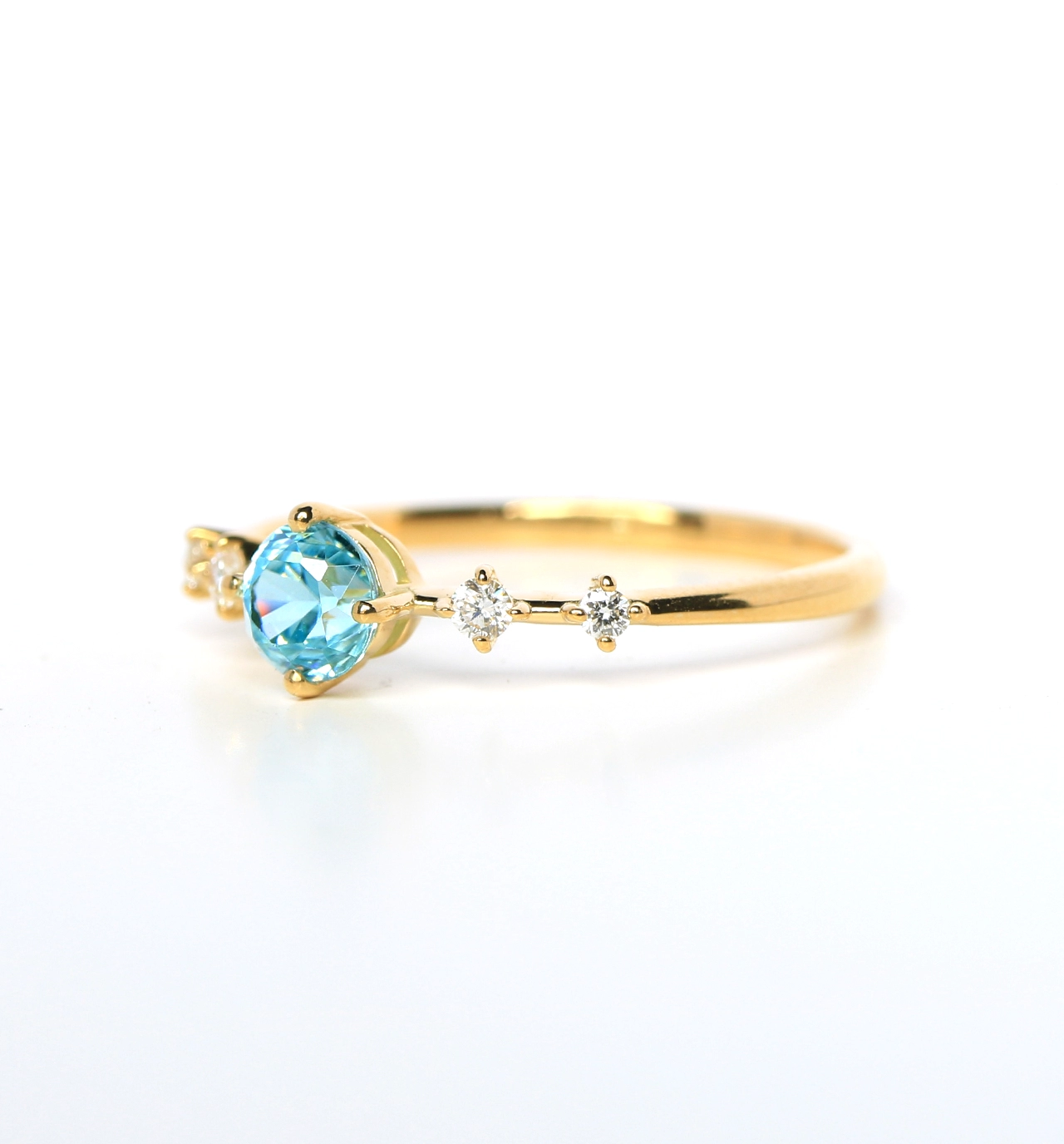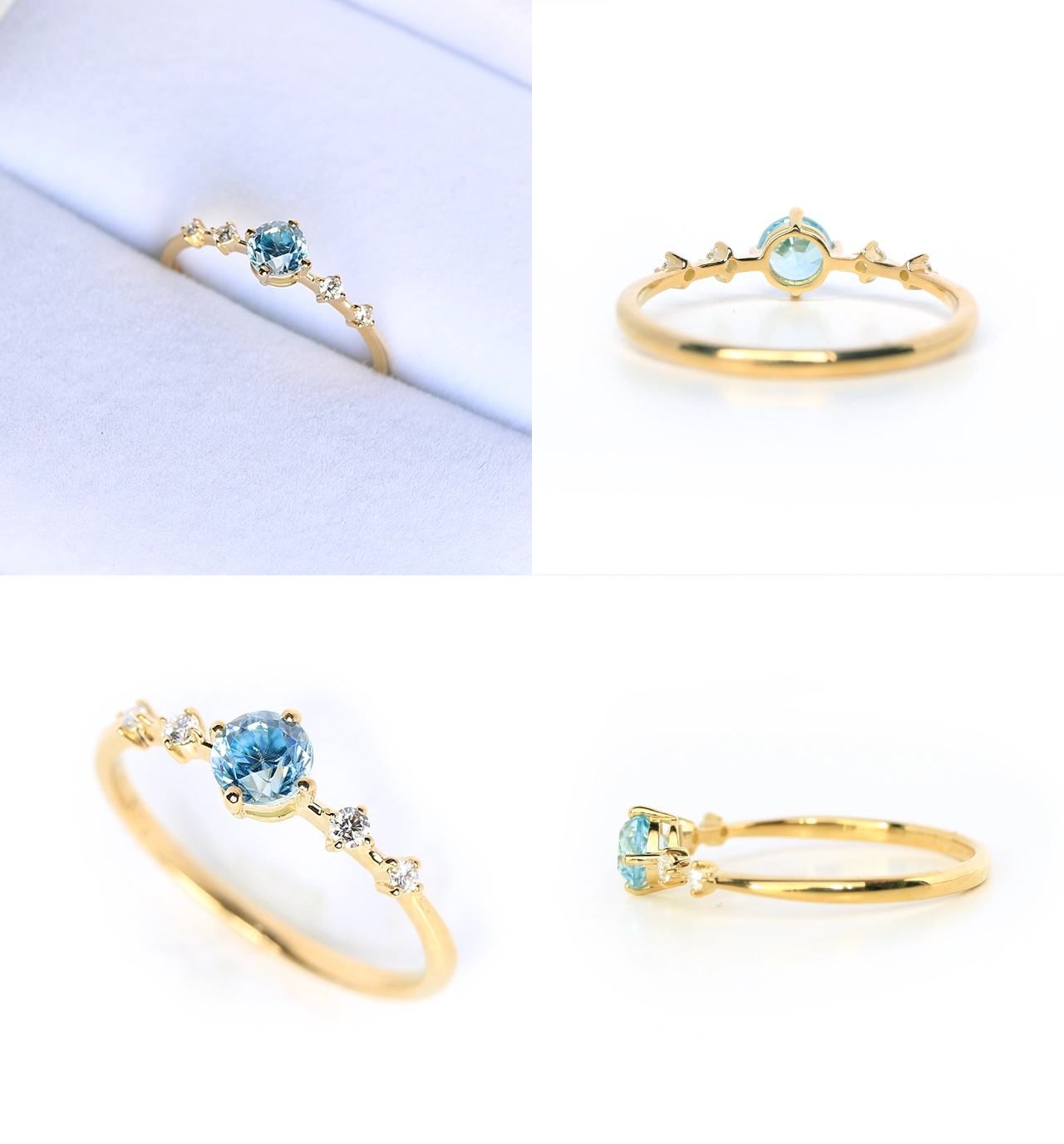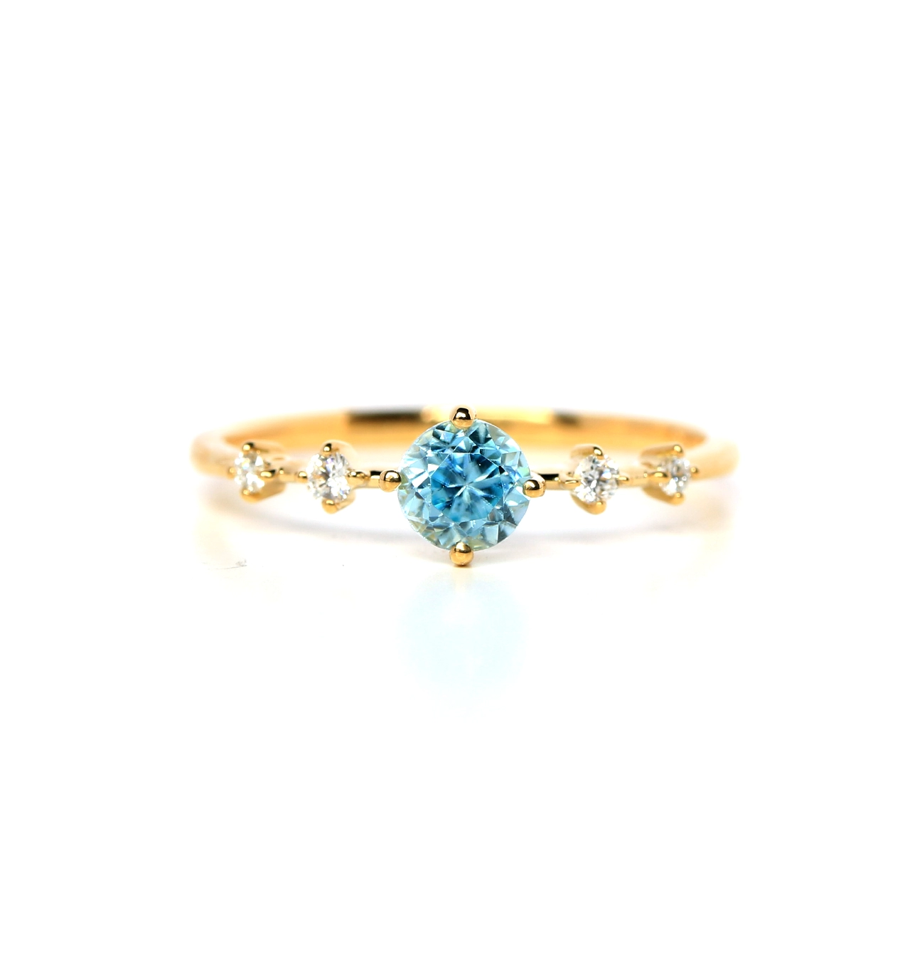 ブルージルコンのラウンドカットをメインに、4つのメレダイヤを配したK18リングです。 ジルコンは特有の高い屈折率と分散値による虹色のファイアと呼ばれる輝きが見られます。澄み切った淡青の色彩とファイアがとても美しい宝石です。