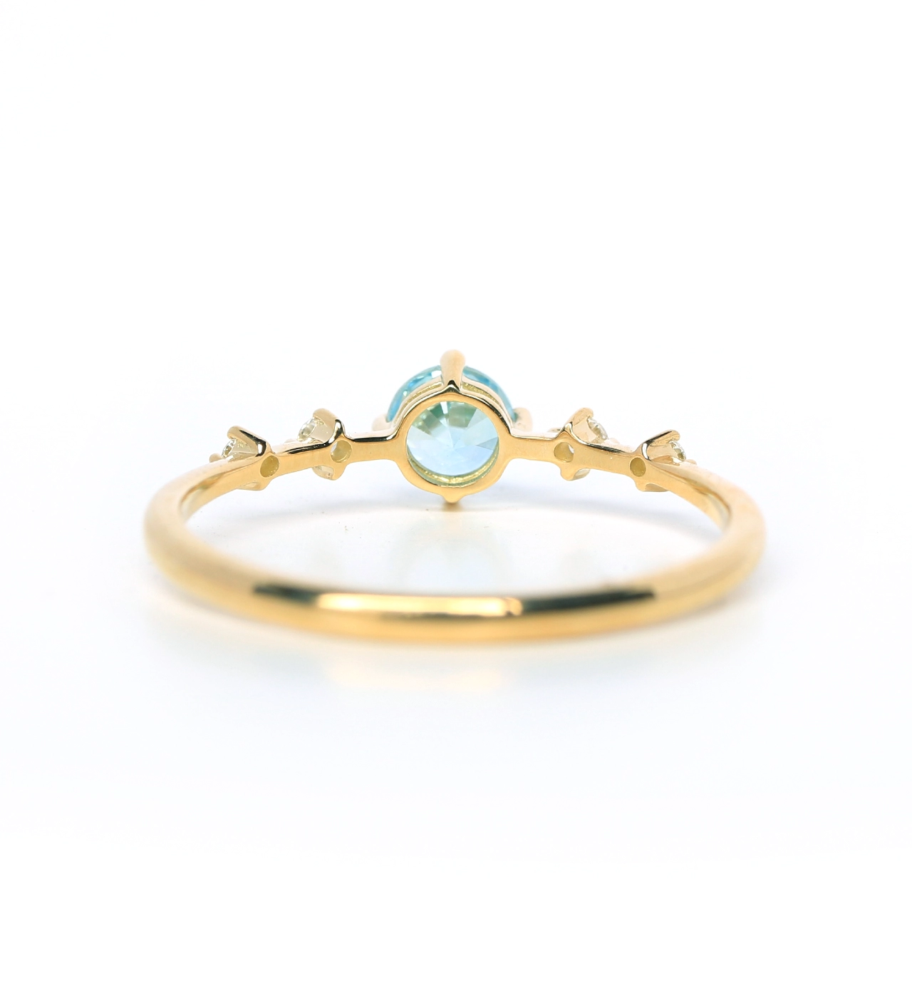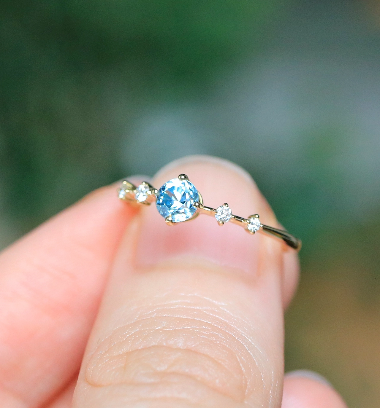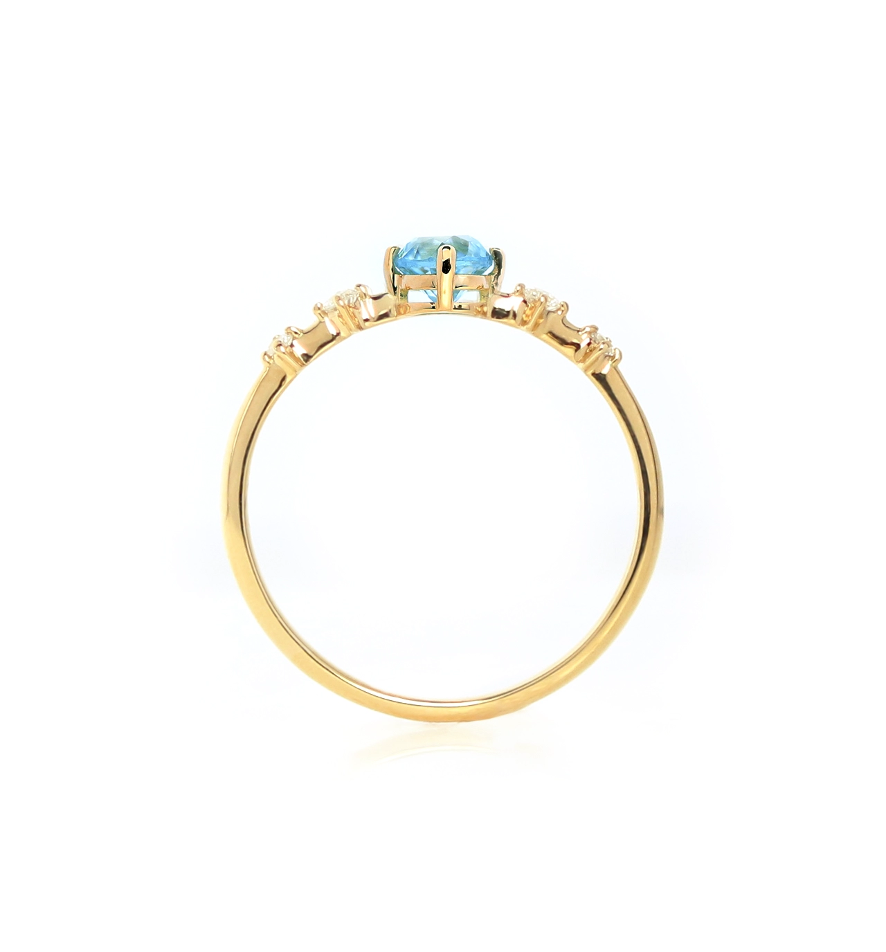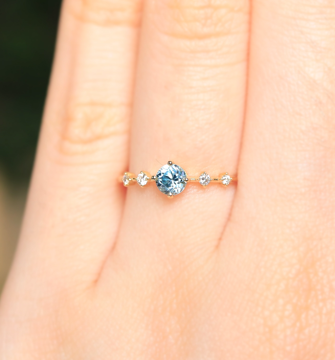 ブルージルコンのラウンドカットをメインに、4つのメレダイヤを配したK18リングです。 ジルコンは特有の高い屈折率と分散値による虹色のファイアと呼ばれる輝きが見られます。澄み切った淡青の色彩とファイアがとても美しい宝石です。