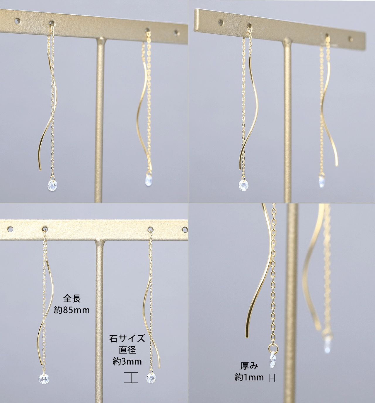 石が主役の繊細な曲線が美しいアメリカンチェーンを使ったイエローゴールドピアス。耳元でゆらゆらきらめくローズカットのダイヤモンドは、エレガントなコーディネートや普段使いとしても使いやすいピアスです。 ウェーブの入ったパーツとローズカットのダイヤモンドの輝きを、極細の18金チェーンが際立たせています。