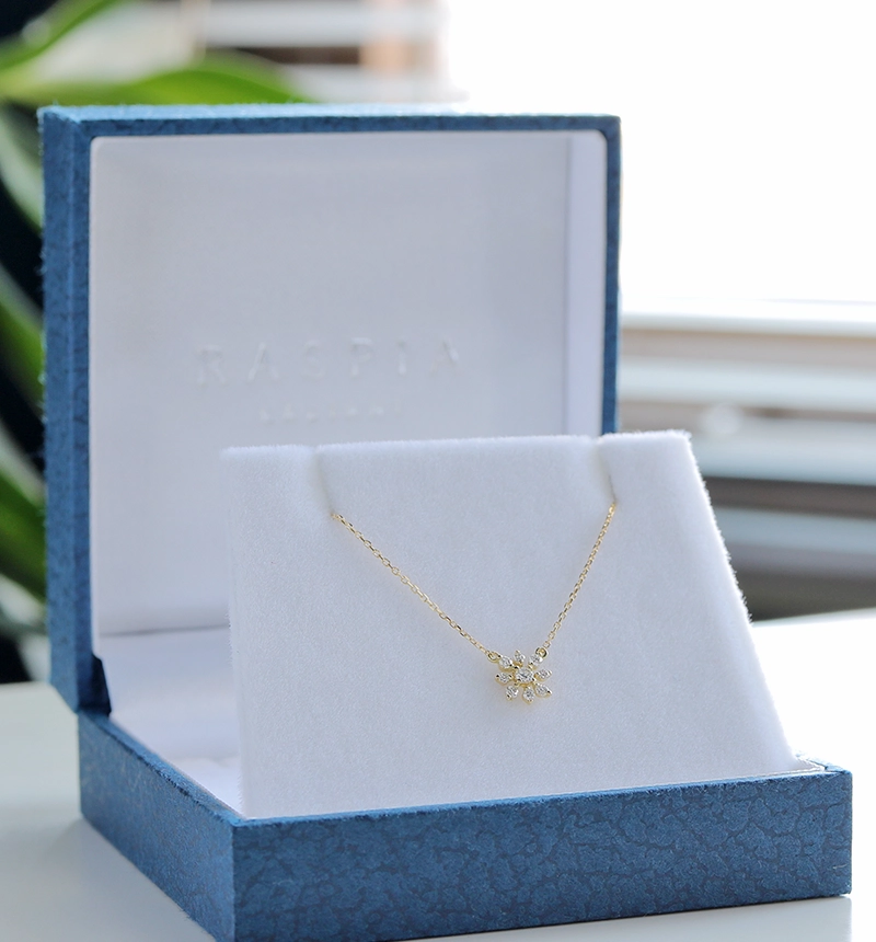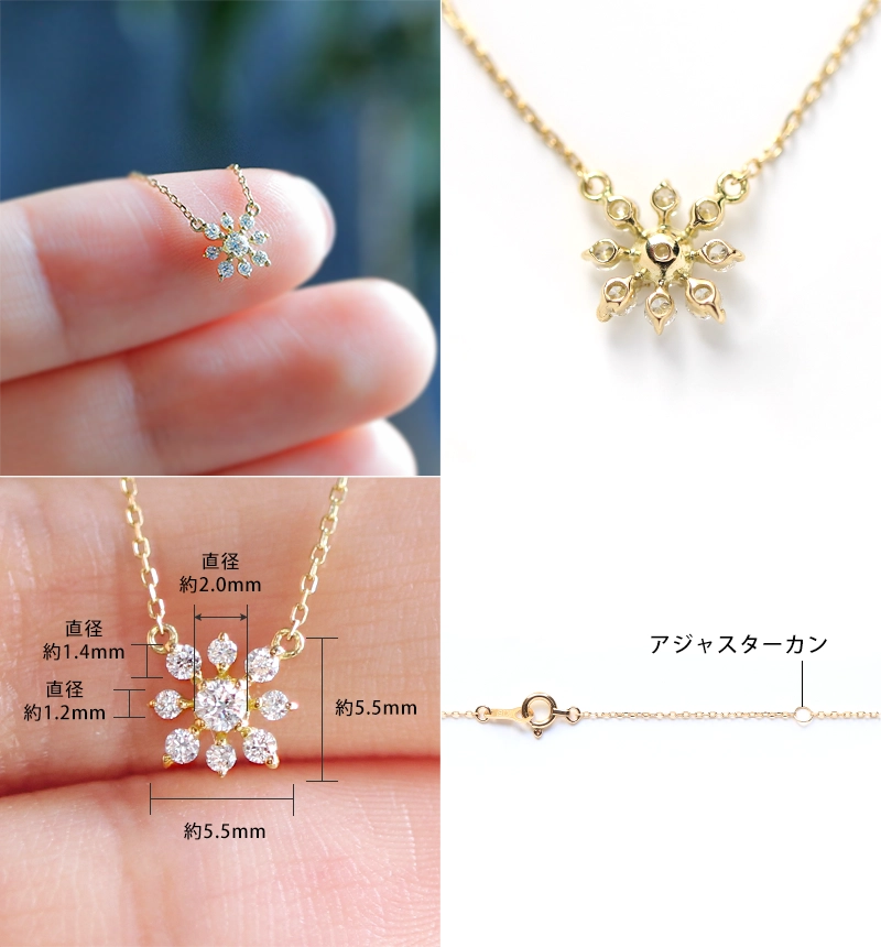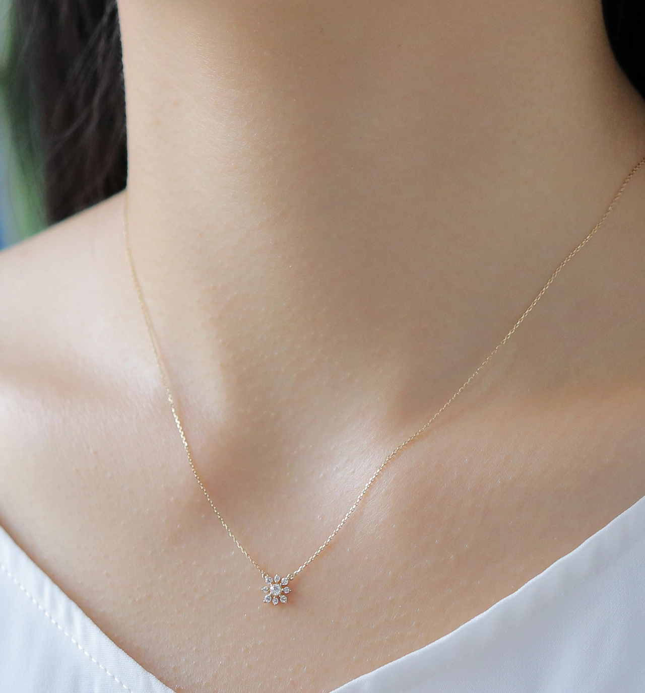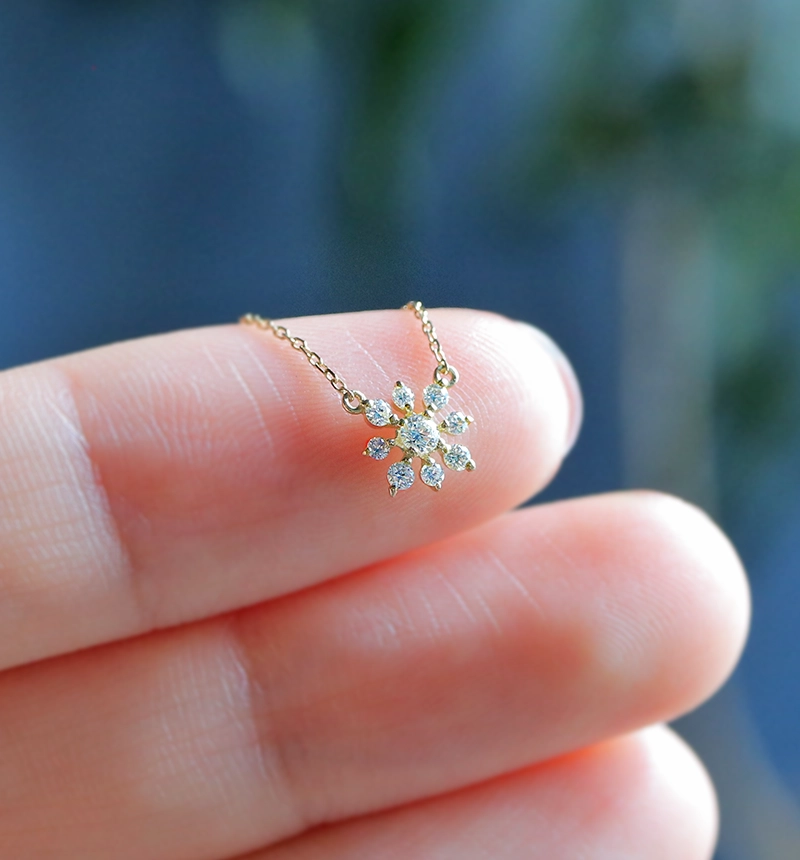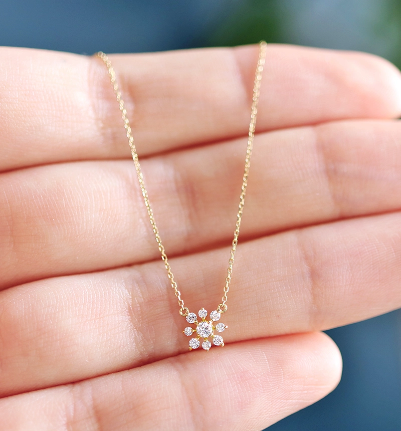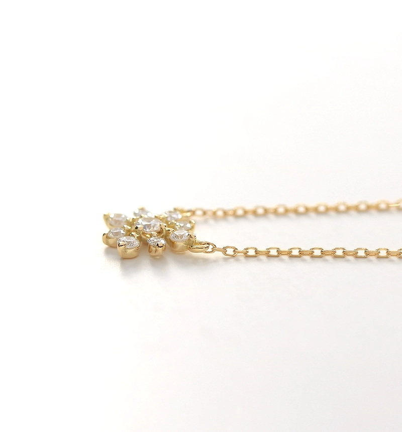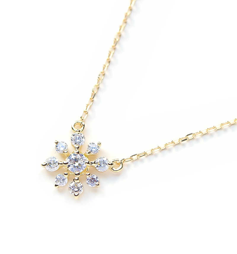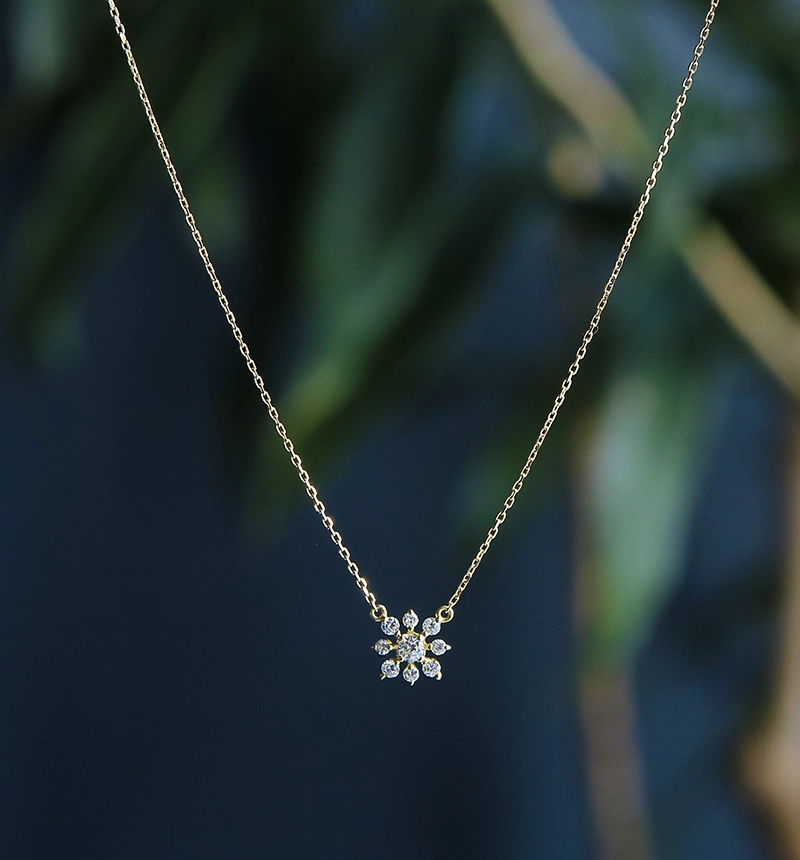 雪の結晶モチーフにダイヤモンドを配置したK18イエローゴールドのネックレス。ダイヤモンドは9つ使用し、揺れるたびに胸元を輝きが楽しめます。使用しているダイヤはカラー、カット・研磨の質、透明度など、美しいルースを1粒ずつ厳選して買付しております。