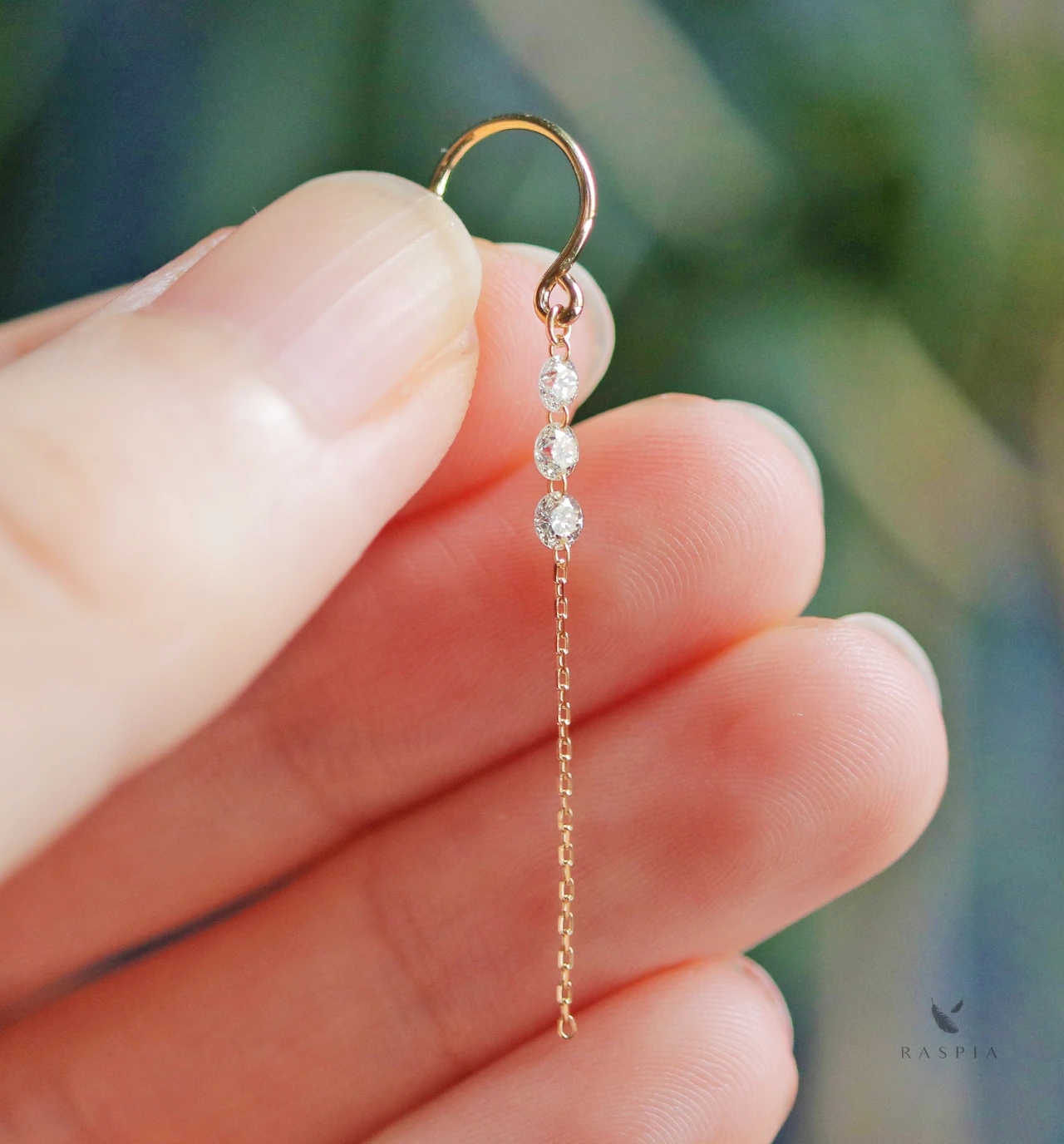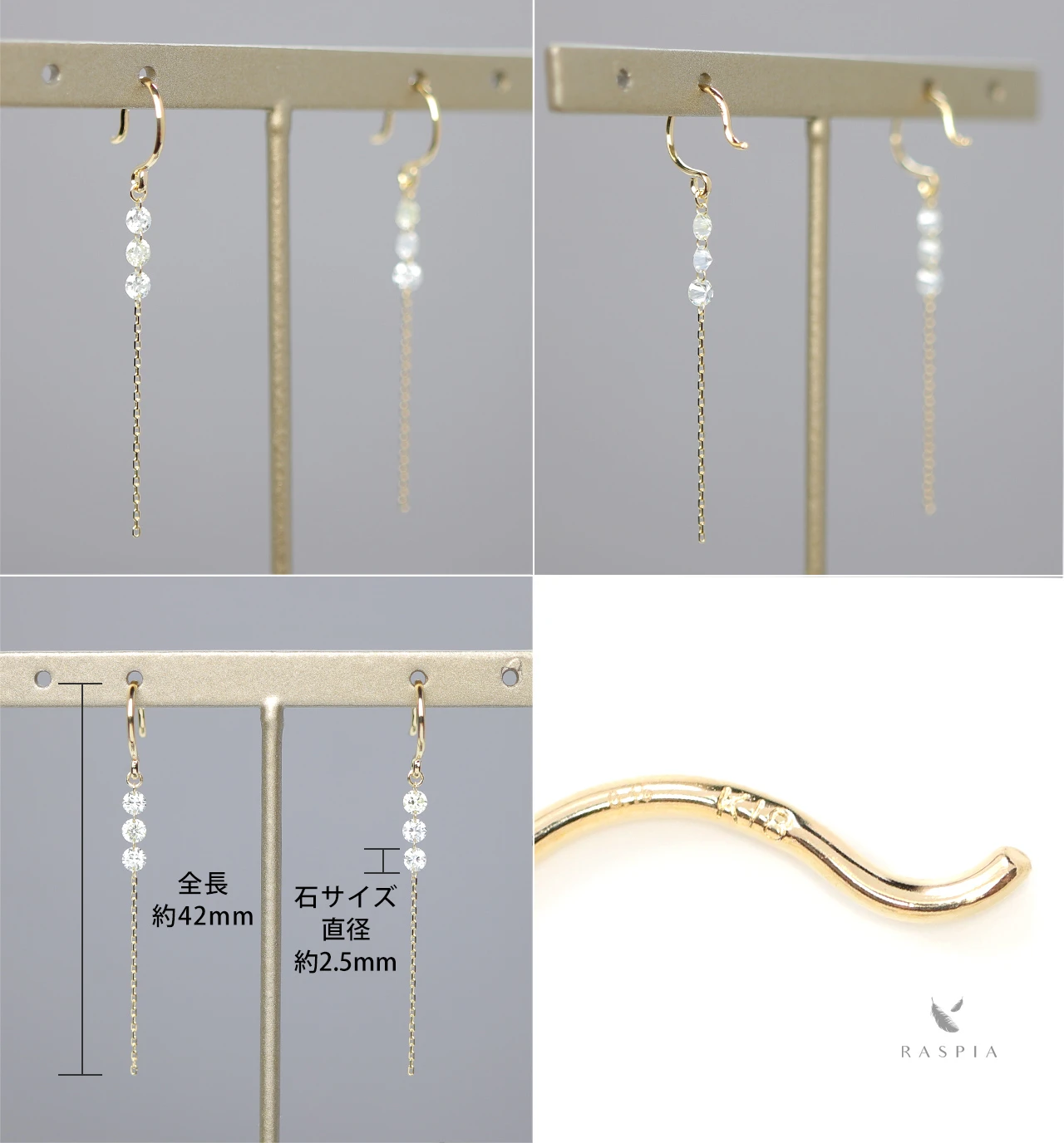 ブリリアントカットのダイヤモンドを左右で合計6粒あしらったチェーンフックピアスです。
