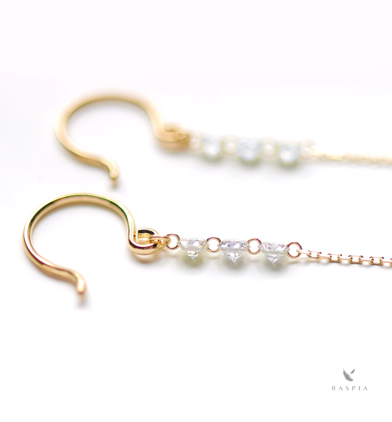 ゆるやかなウェーブのフック、ダイヤモンドの輝き、極細チェーンのすべてが調和し、女性らしい華やかさを演出します。