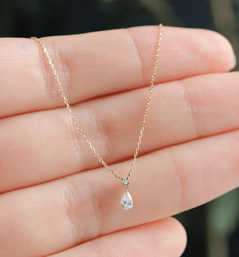 ダイヤモンドがきらきらと煌めき、小さく繊細でありながら胸元で確かな存在感を発揮します。