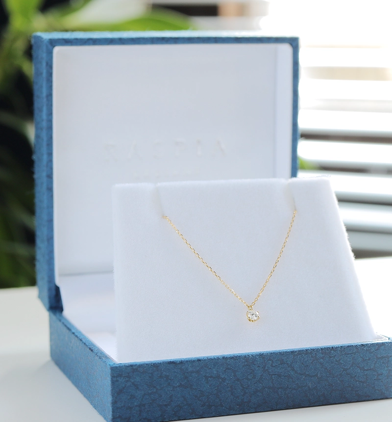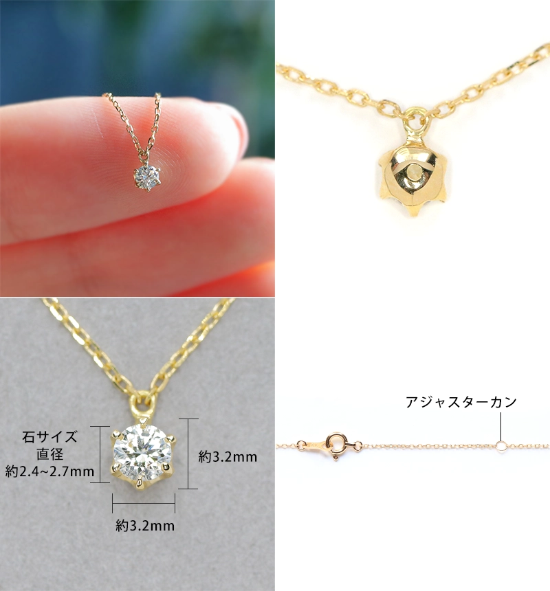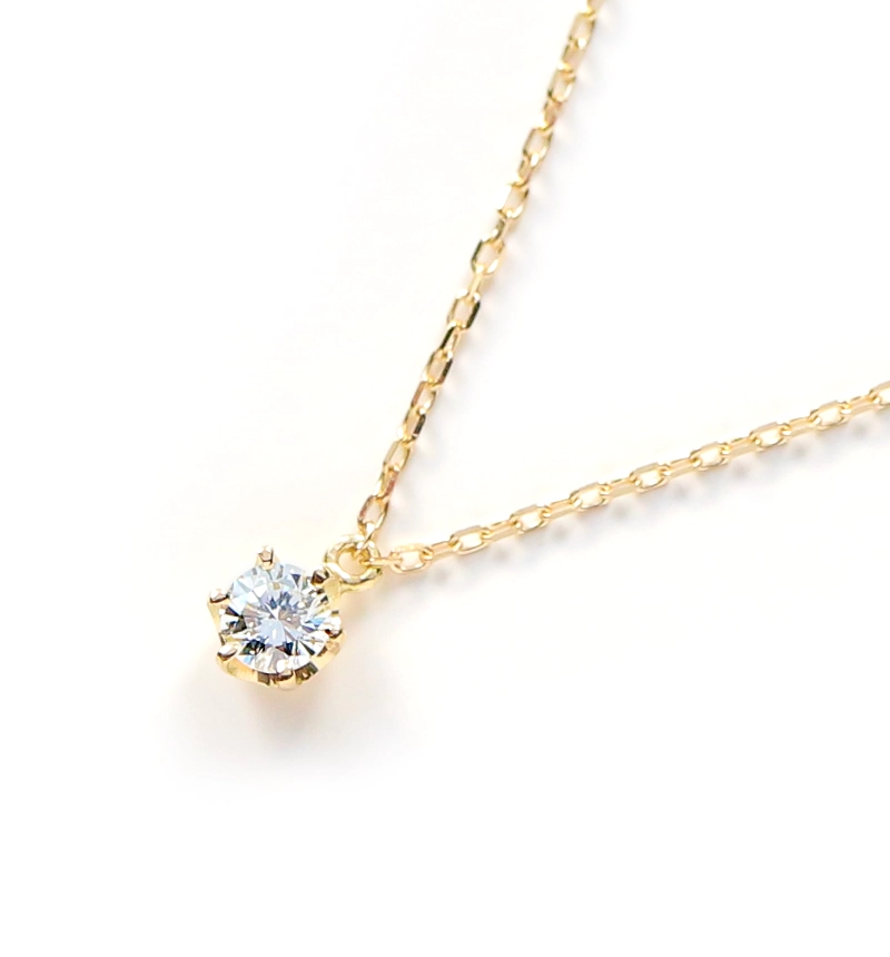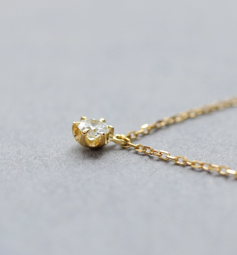 ネックレストップの台座は6つの爪でダイヤモンドしっかり支え、輝きを引き立てます。 金具はすべて18金で、職人が細部まで丁寧に磨きあげました。鮮やかなイエローゴールドの輝きを長くお楽しみいただけます。