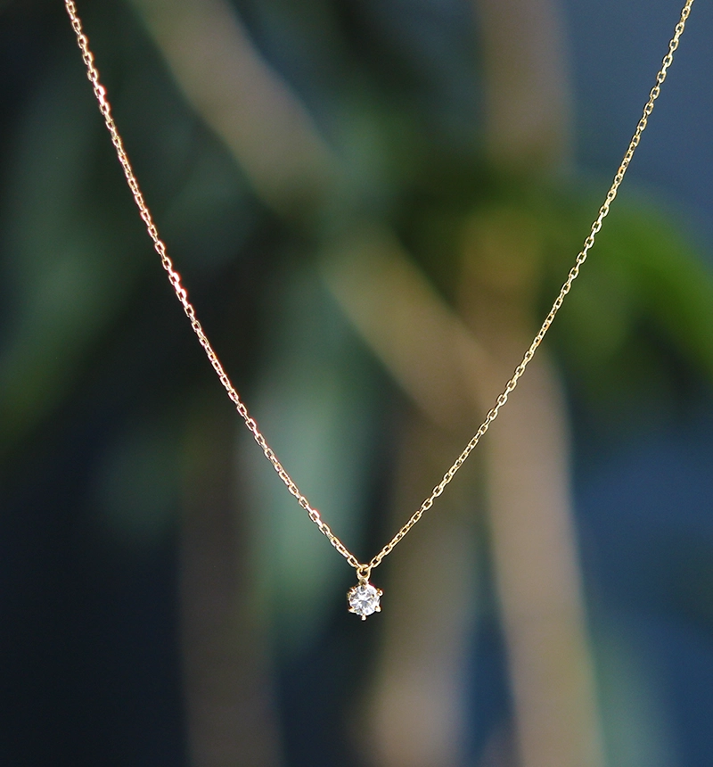 女性に人気、定番のシンプルな一粒のダイヤモンドネックレス。ダイヤモンドは2.5mmラウンドカットでダイヤモンドの輝きが楽しめるよう、カラー、カット・研磨の質、透明度など、美しいルースを1粒ずつ厳選して買付しております。