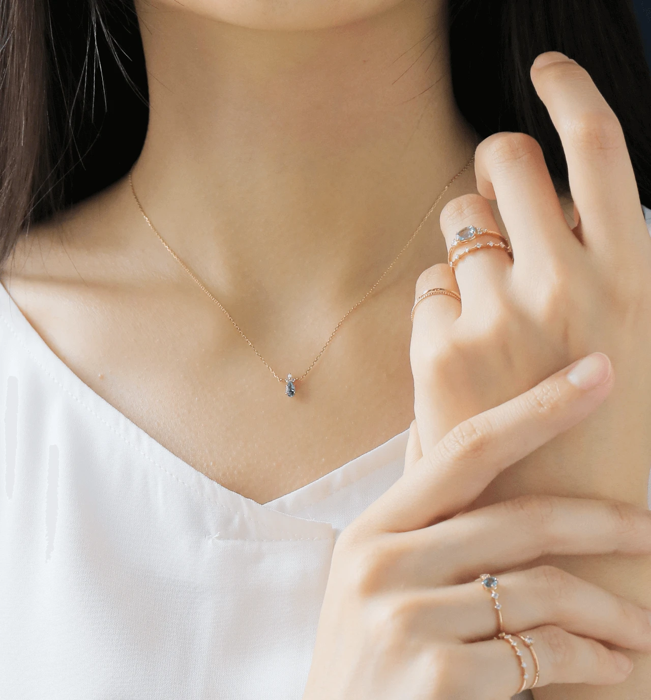 ネックレストップの石留めは、極限まで小さくさり気ない作りにこだわりました。小さいながらもしっかりと石を支え、宝石の存在感を引き立てます。