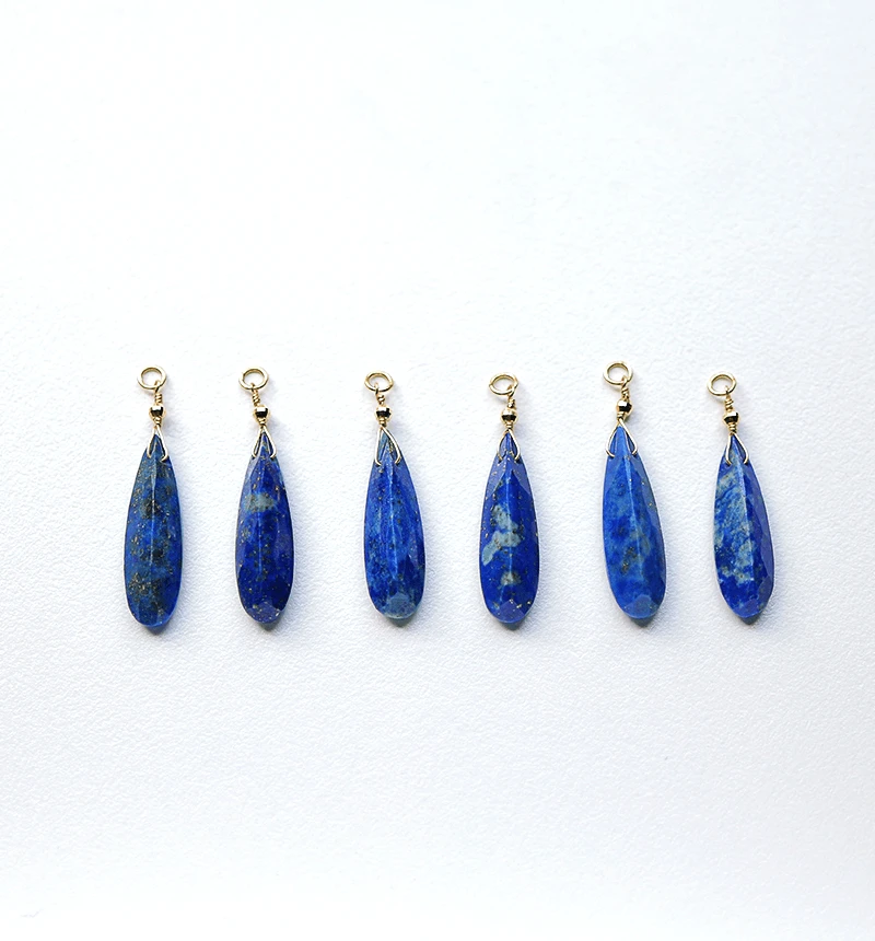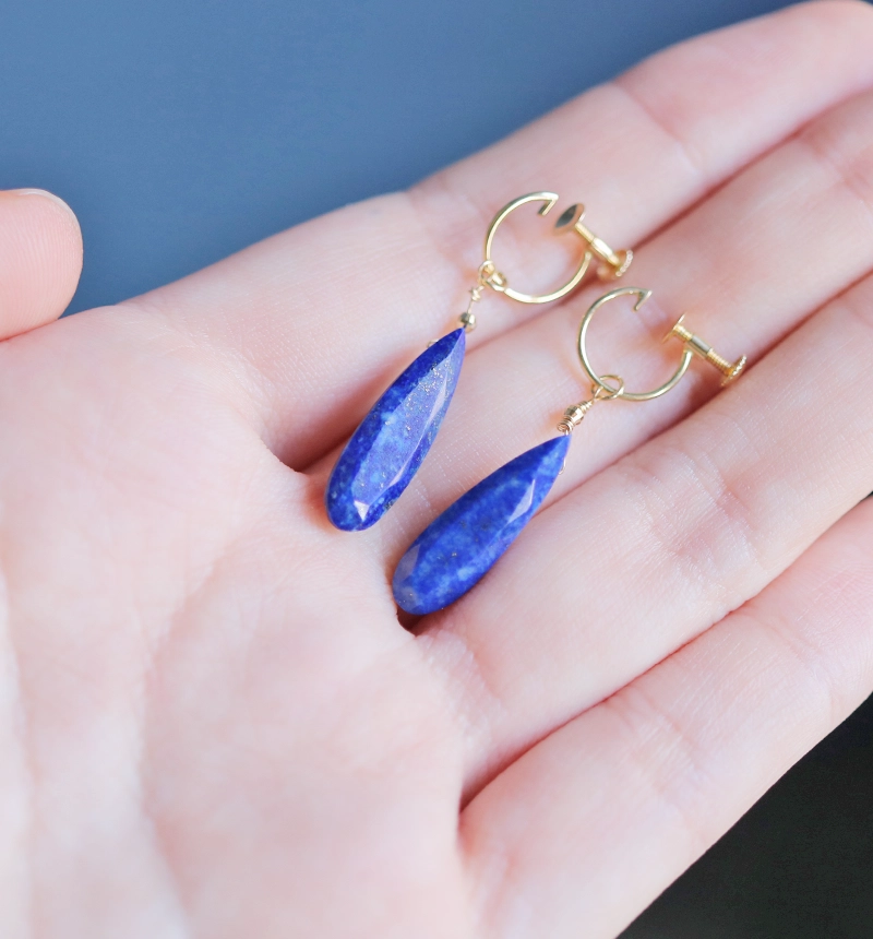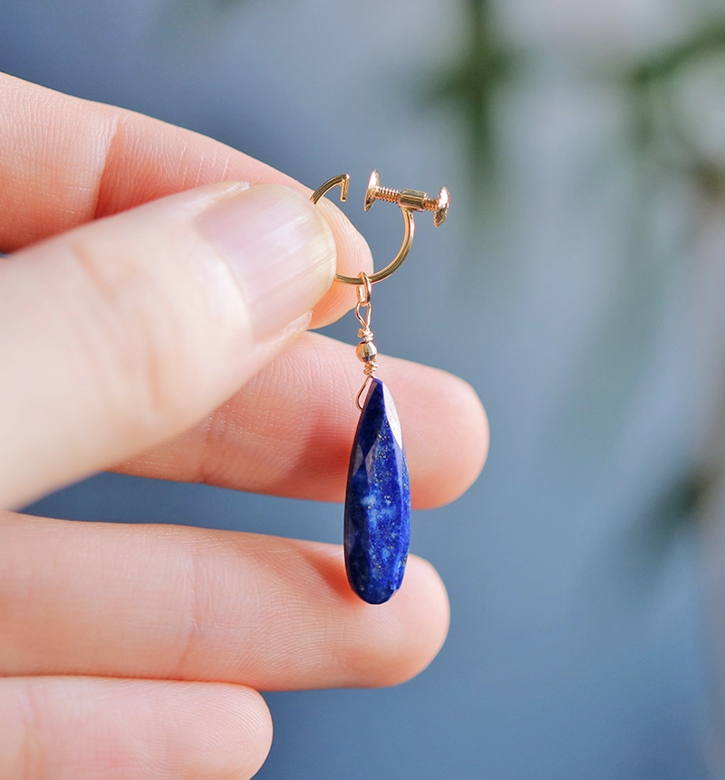 ラピスラズリの深い青とのコントラストの美しさが最大限に引き立つようにしました。散りばめた星が夜の空に広がるようなラピスラズリ、そしてさり気なくあしらわれたK18のカットビーズは相性がよく、上品で可愛く耳元で揺れます。