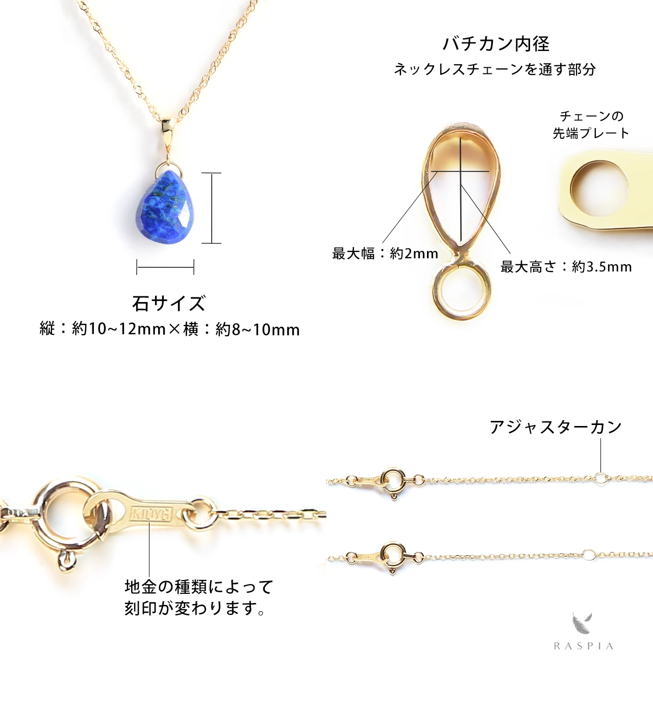 | サイズ | ラピスラズリ:縦 約10~12mm × 横 約8~10mm バチカン内径:高さ 最大(約)3.5mm/幅 最大(約)2mm チェーン全長は40cm・45cm・50cmよりお選びいただけます。 | ||