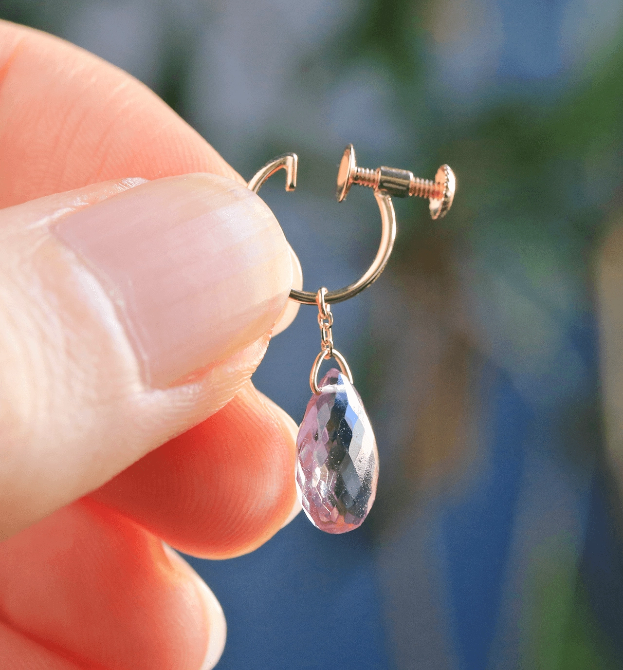 イヤリングのネジパーツはさりげなく、正面からみると華奢なフープピアスのように見えます。ミニマルなデザインながら耳にしっかりと留まってくれます。
